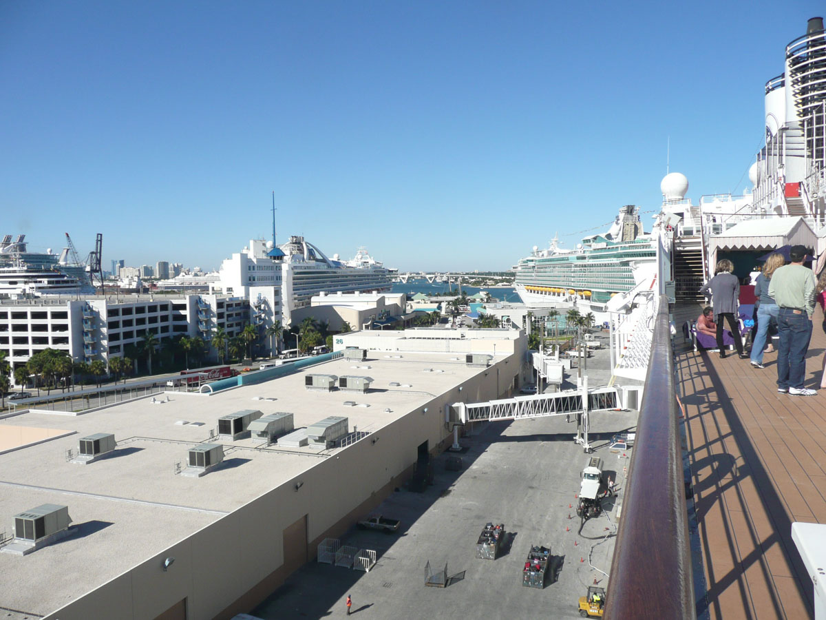 Everyone was very excited today because we were getting on the cruise ship. We left the hotel around 11:00am and it did not take us long to get to Port Everglades. There were approximately fifteen ships in port including a couple of the very large Royal Caribbean ships.