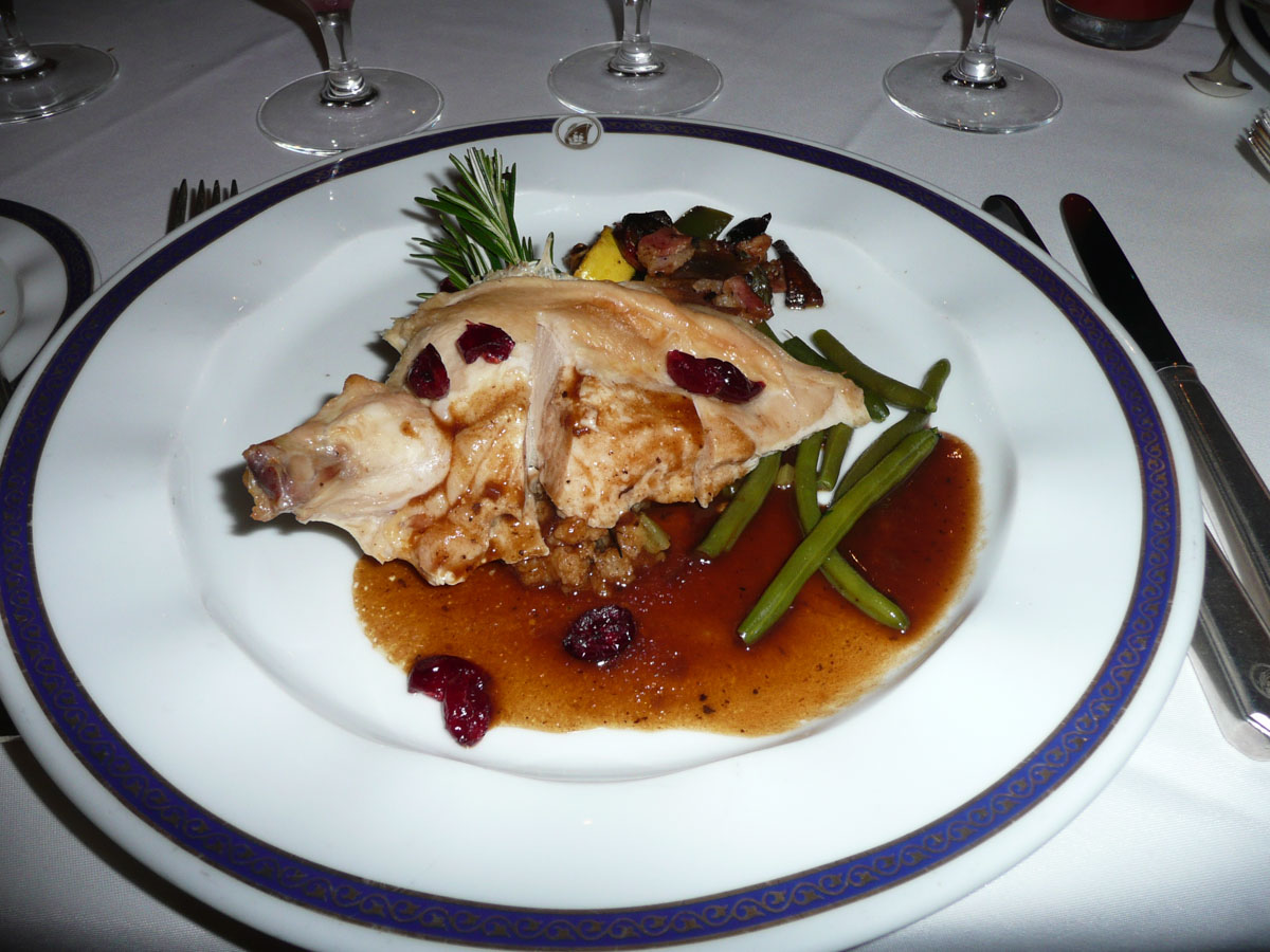 We decided to have an early dinner so we made our way to the Rembrandt Dining Room. Tonight’s selections included fresh fruit medley, Roasted Chicken with Sausage Cornbread Stuffing and Eggplant Cannelloni Parmigiano.