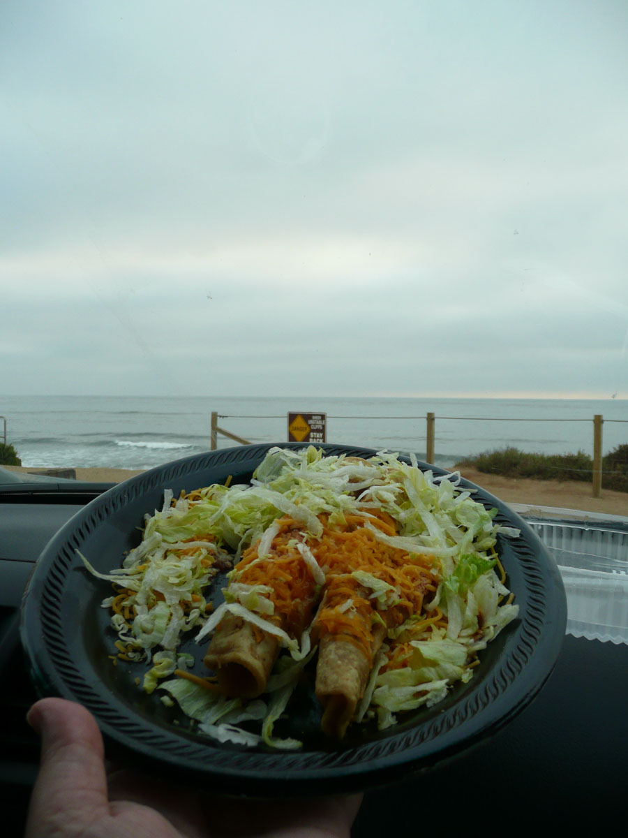 While watching “Diner, Drive-Ins and Dives” one night on the Food Network, Guy Fieri visited a Mexican restaurant in San Diego called El Indio.  We decided to pick up dinner to enjoy with the sunset.  Once we pulled up, we noticed the line coming out the door.  This place must be good.  We got some taquitos, chips and salsa and headed to Sunset Cliffs.  Unfortunately, there was no sunset but we still enjoyed the view with a fabulous Mexican dinner.