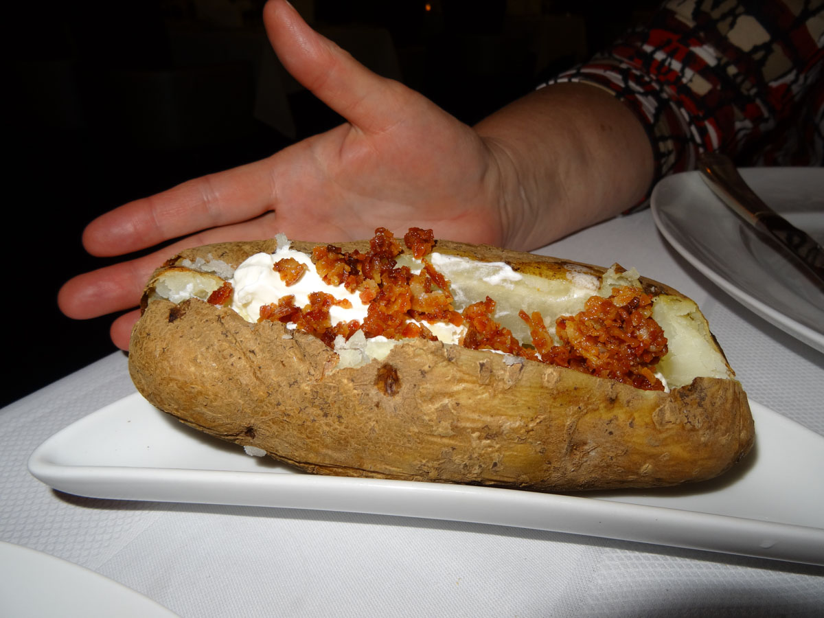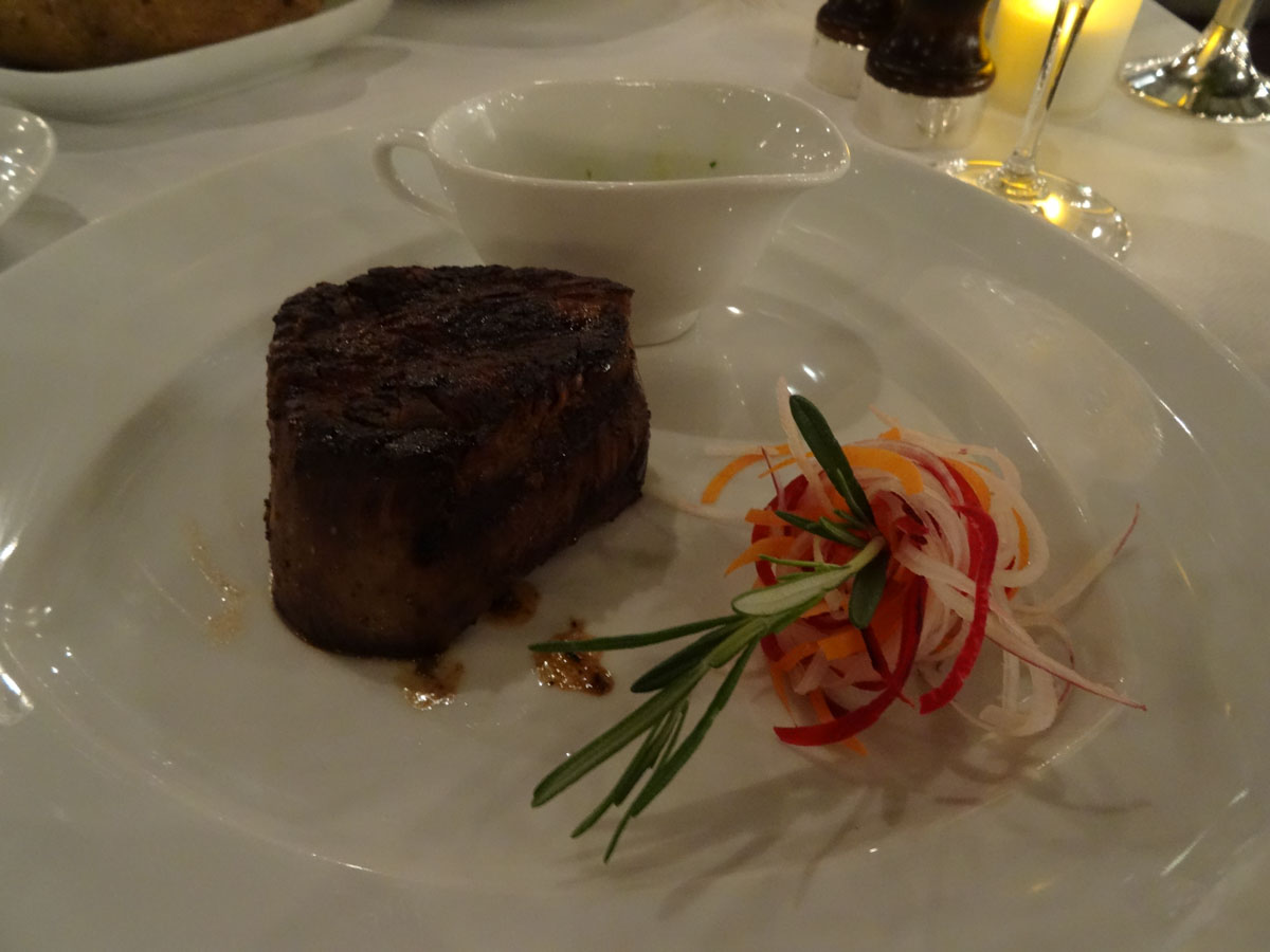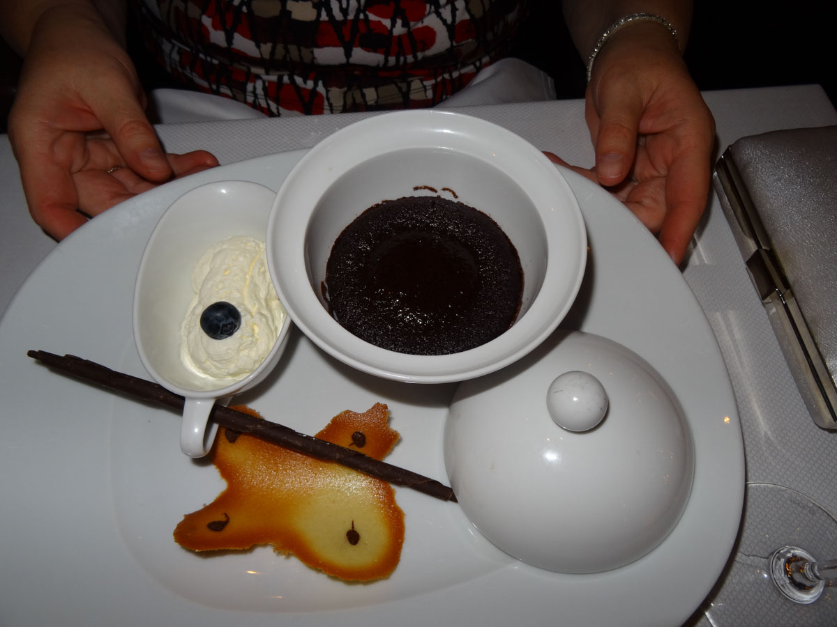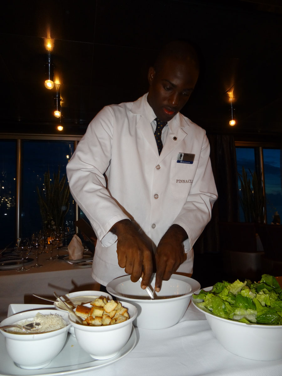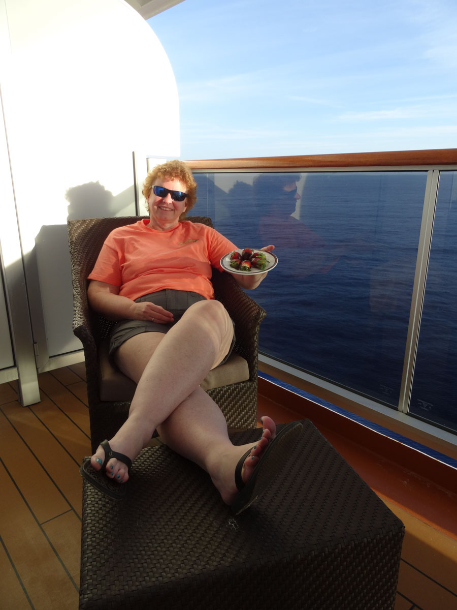 We returned to the cabin to find a surprise from Helayne.  (Thanks for the delicious chocolate covered strawberries!). After more relaxing on our balcony, we headed to the Pinnacle Grill for dinner, which was superb.  Caesar salad made table side, filet mignon with garlic herb butter, mashed or ginormous baked potato (with all the fixings), raspberry cheesecake and chocolate volcano cake.
