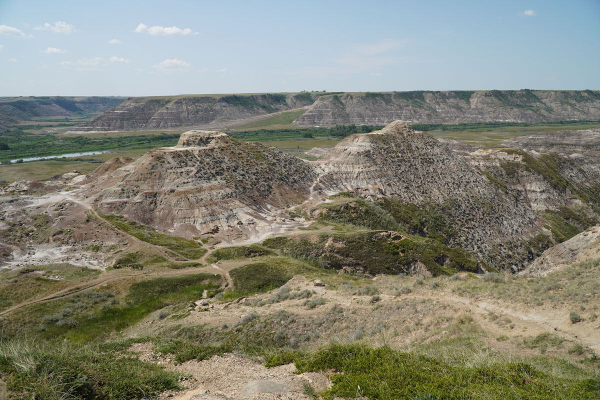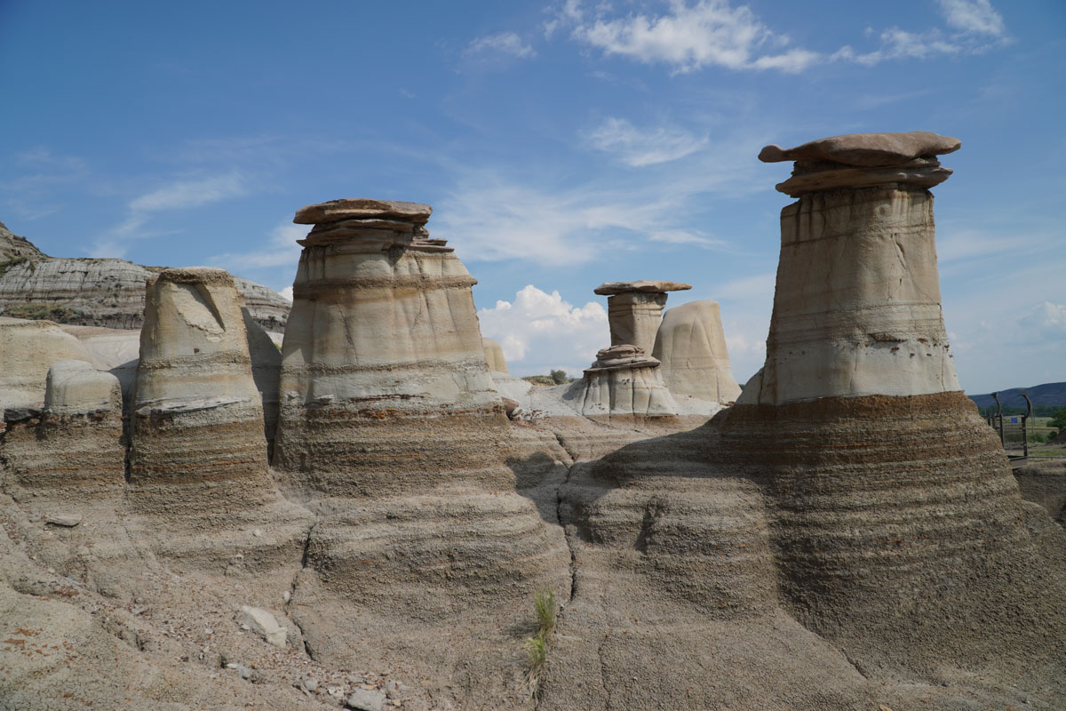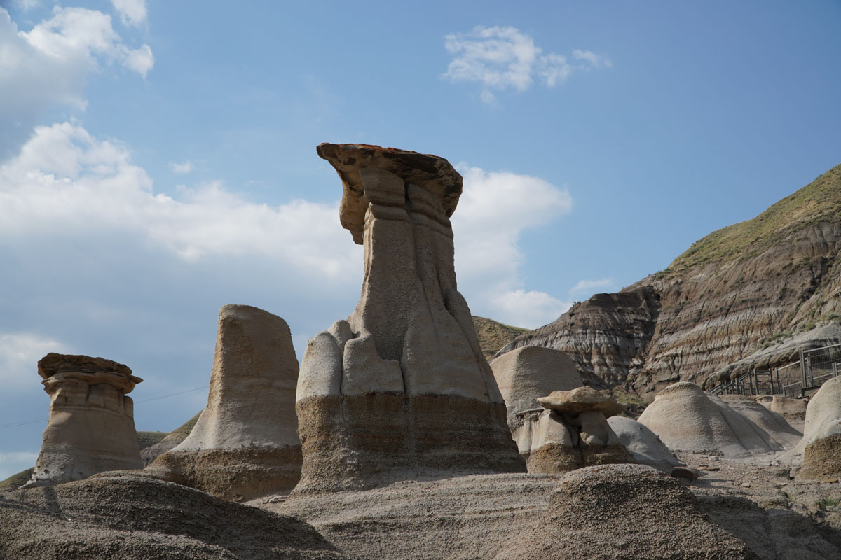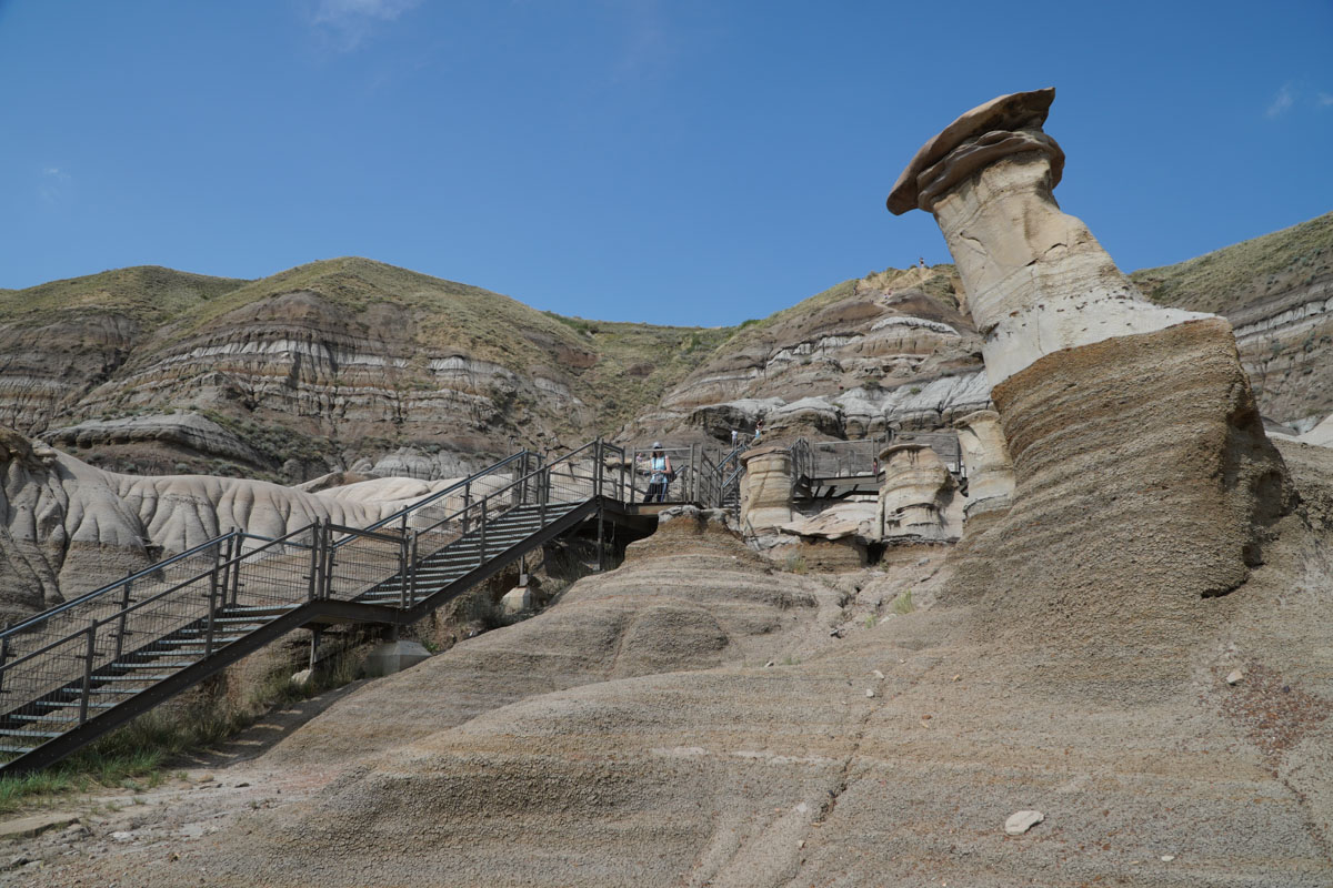 After exploring Drumheller, we headed south on the Hoodoo Trail. Because it was late afternoon, we decided to just stop at one of the lookout points. This stop had metal staircases where you could climb up to get an up close look at the hoodoos which are sandstone pillars with rock caps. If you are feeling energetic, you can hike the area surrounding the hoodoos. We left that for another time.