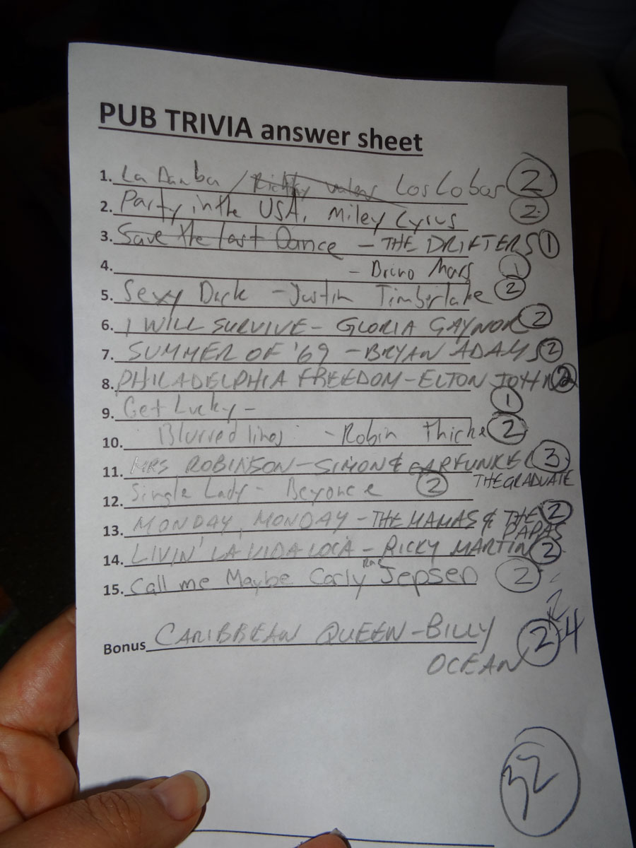 We thought we should try our hand at Name That Tune tonight. We got there early and a family sat down with us at our table. We decided to team up since there were two young kids. The show was hosted by the former DJ Styles who now goes by Show Host Styles. The category tonight was top 40. Styles said it would be half current and half from the past. Guess what … we won with a score of 32 points. The prize was a bottle of champagne and we gave it to the family since we just wanted the accolades.