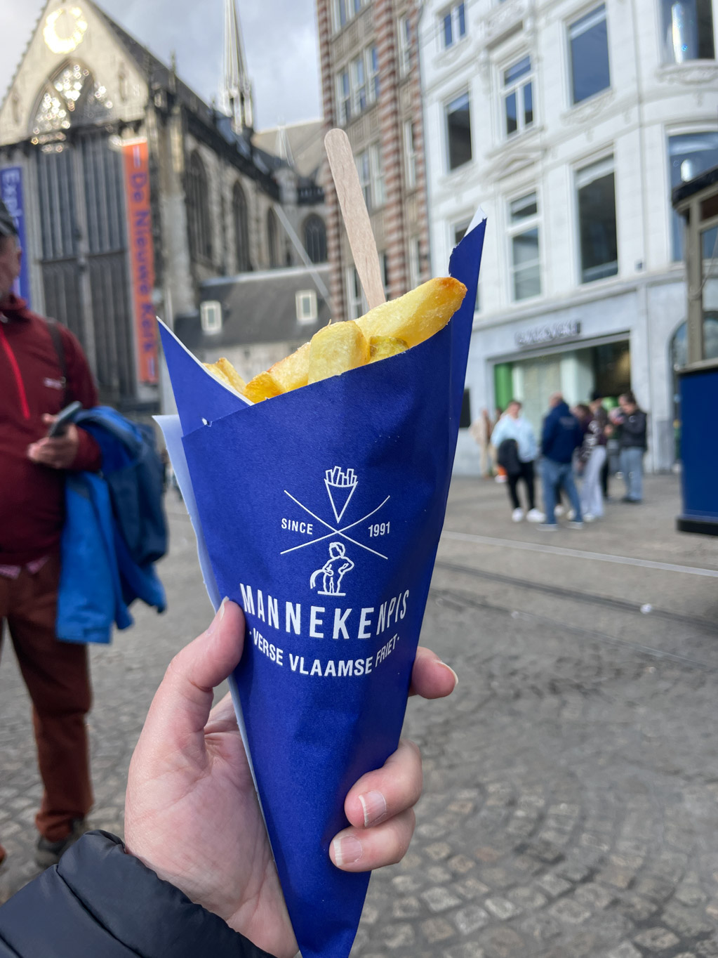 We came upon a long line up at Van der Linde, an ice cream shop that has been in business since 1937. We made sure to follow the posted instructions on how to order the ice cream. It is a combination of ice cream and whipped cream, very light and airy. As we were walking along, we noticed that many people were having frites (fries) in a paper cone. I knew we had to have some so we found ourselves at Mannekenpis, a favourite among locals and tourists. The fries are hand cut and fried to perfection. But what sets these fries apart are the over twenty sauces you can get on them. I had mine with BBQ sauce while Karen had the tangy Mannekenpis sauce. It was a very short walk to Dam Square where we found a bench to enjoy our snack.