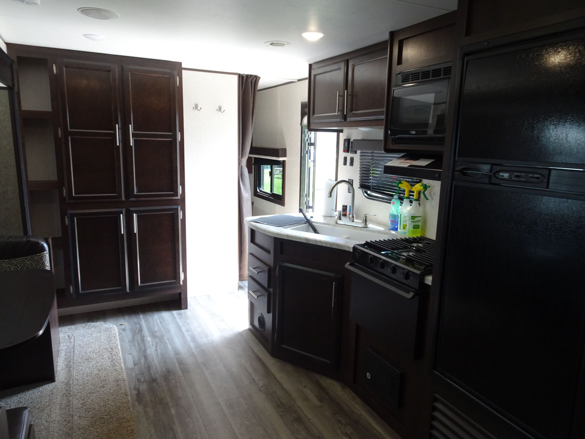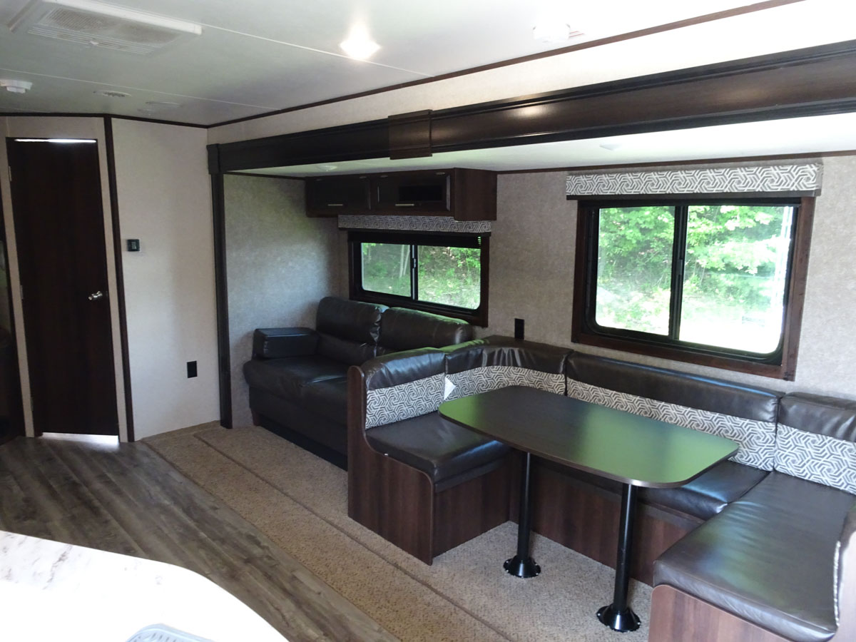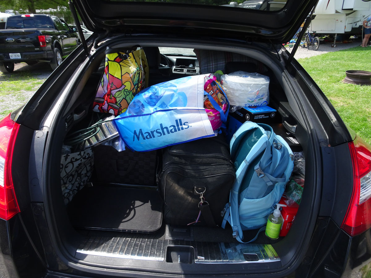 We arrived at the 1000 Islands / Ivy Lea KOA at around 1pm. We are in site 106 which is along the back of the property. It did not take Luke long to get the trailer backed in and set up for us. He even gave us a quick tour on how everything operates. The trailer is a 33 foot 2019 Jayco Jayflight. It has a bedroom at the front, a spacious living/dining/kitchen area and double bunks in the back. It is a really nice trailer which sleeps eight people or Karen, Maui and myself. It took us about an hour to get everything out of Karen’s jam packed car and settled into the trailer.