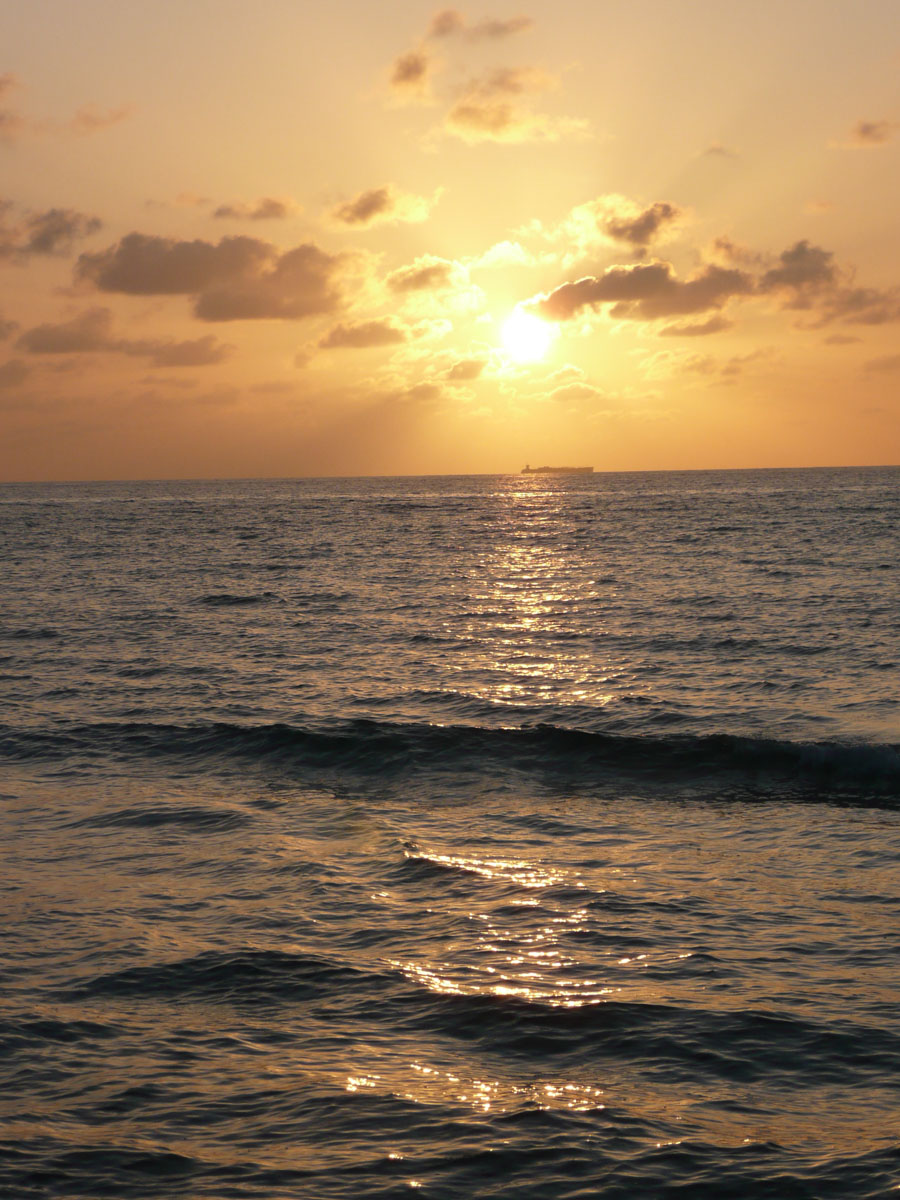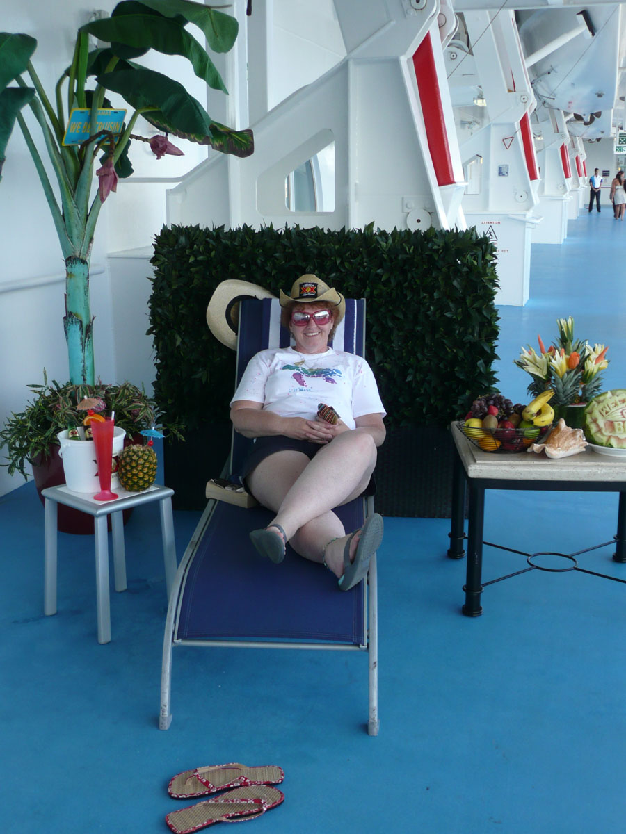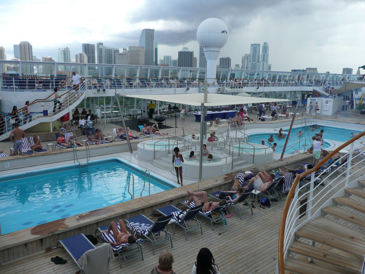 We spent quite a bit of time exploring the ship before we had to attend our boat drill. The drill is mandatory and it actually didn’t take too long. The ship is so quiet that we didn’t even notice when the boat was moving, and that we had pulled away from the dock. From our balcony We saw the exquisite houses of Millionaire’s Row, as we sailed out of Miami and past South Beach. After leaving Miami, we went to the pool. There are two pools with four hot tubs on deck 11, and a kiddie pool plus hot tub on deck 12. It was a bit crowded but what surprised me is there are many little areas where one can get anyway from the crowds. And lots of lounge chairs that aren’t crowded together.