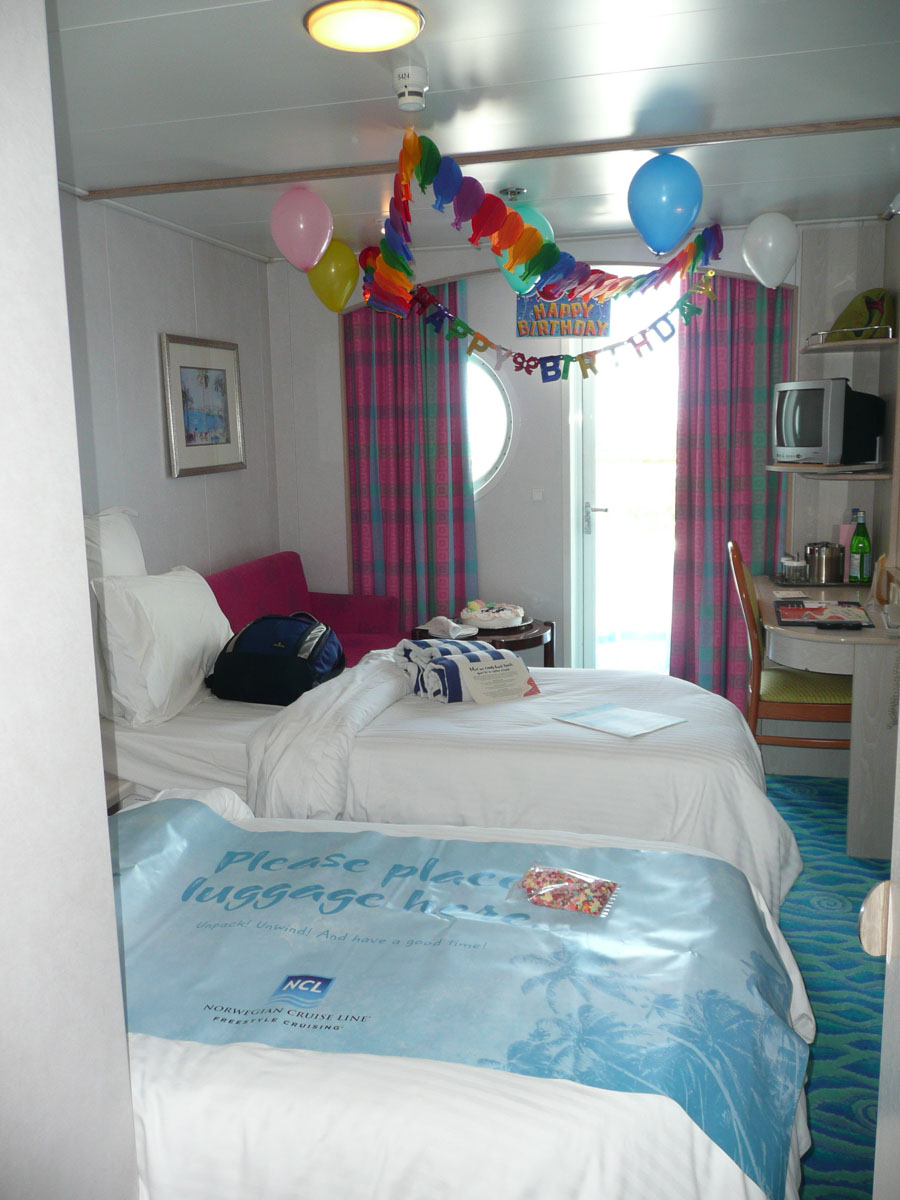 Around 2pm, they announced that our staterooms were ready. We made our way to the 9th floor also known as the Fjord deck to our room 9040. I walked in and was greeted with a birthday surprise. There were decorations and a birthday cake compliments of Karen.