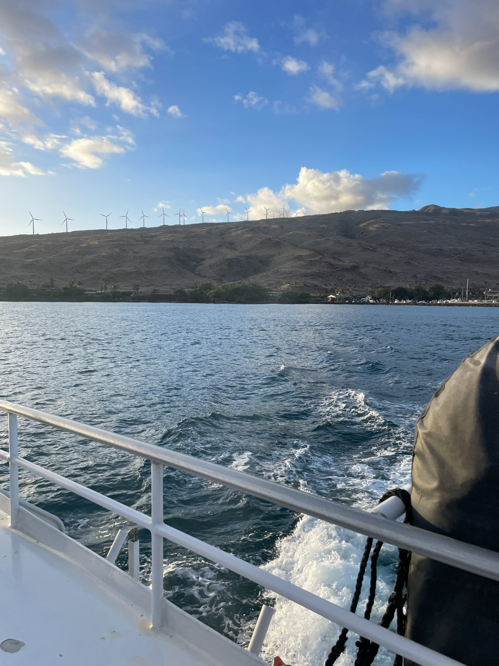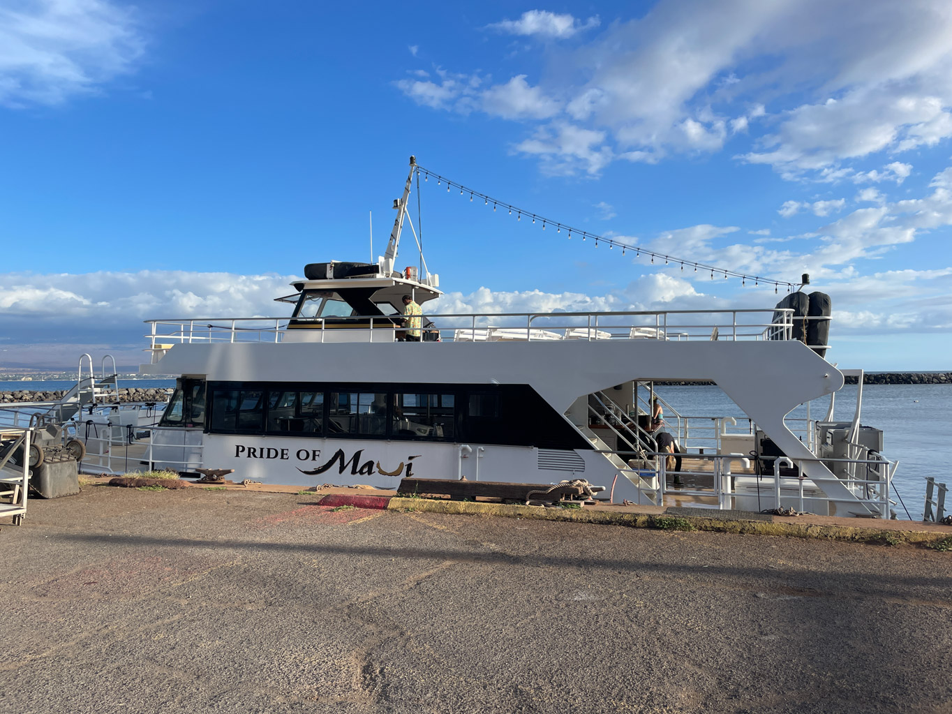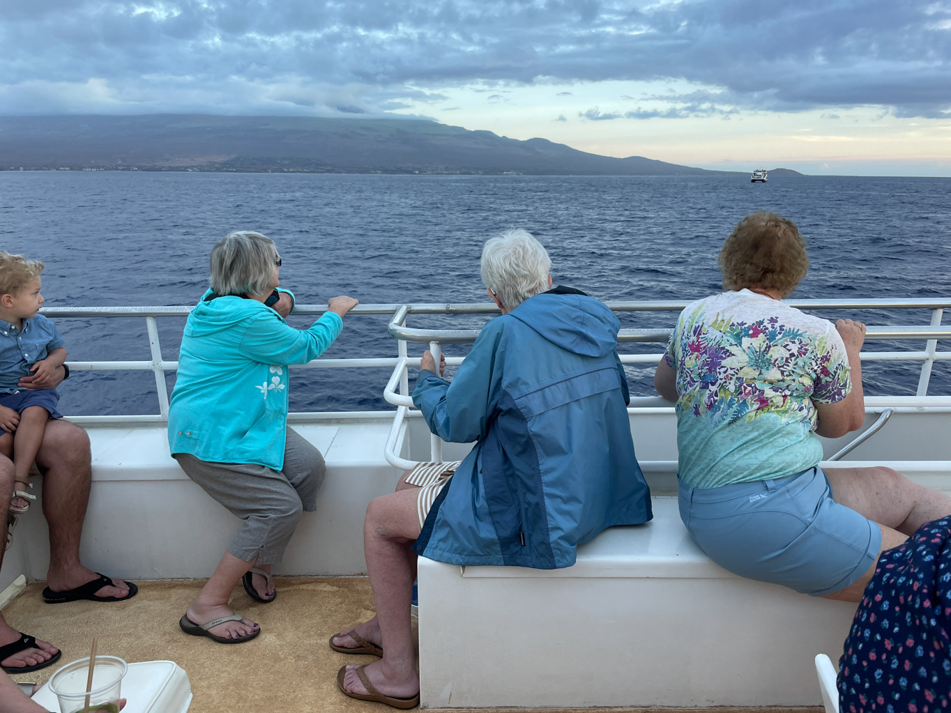 One of the gifts we gave Joan, Darlene, and Nana was a sunset dinner cruise with Pride of Maui. We chose this cruise for its island-style cuisine, open bar, and live Hawaiian music complete with hula dancers. We arrived at Ma‘alaea Harbor around 4:30 p.m. and checked in for the 5:00 p.m. departure. Once onboard, we made our way to the upper deck for the best views. Not long after leaving the harbor, whales were spotted—an exciting bonus, especially since Joan and Nana would not be going on any whale watching tours.