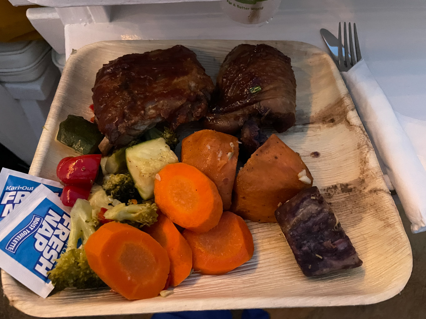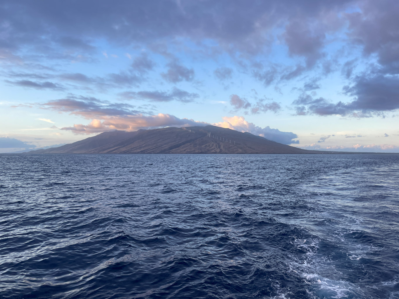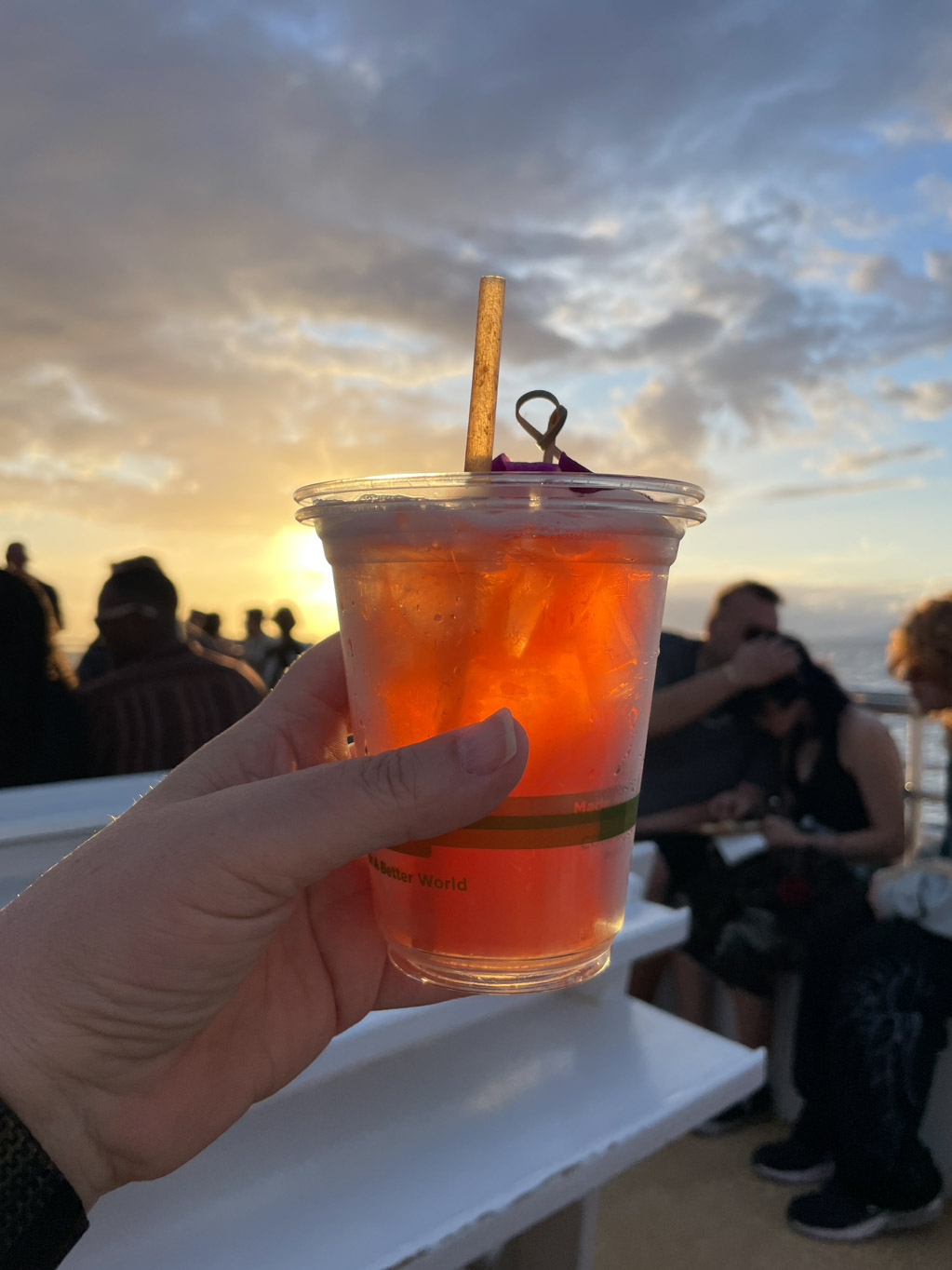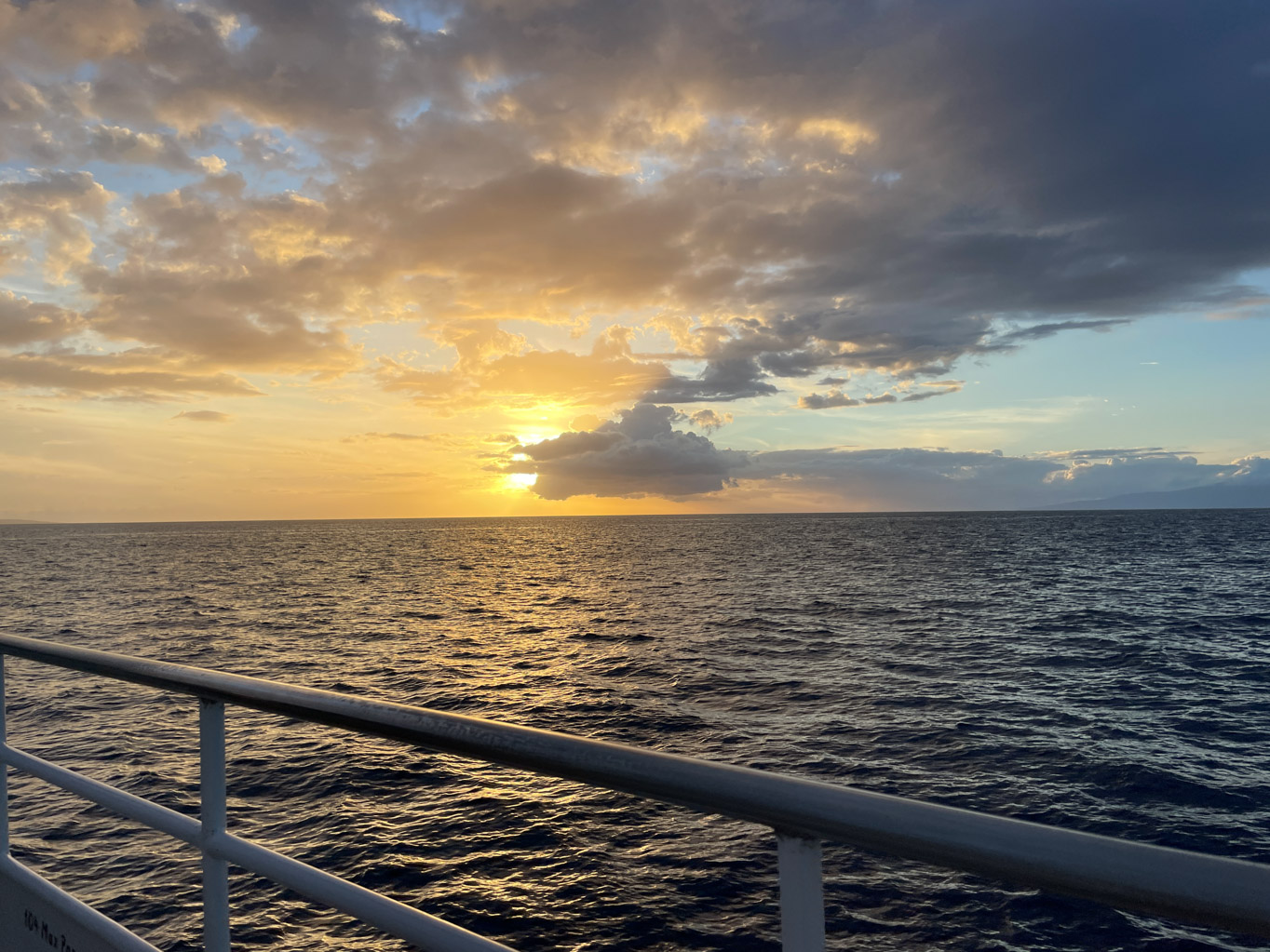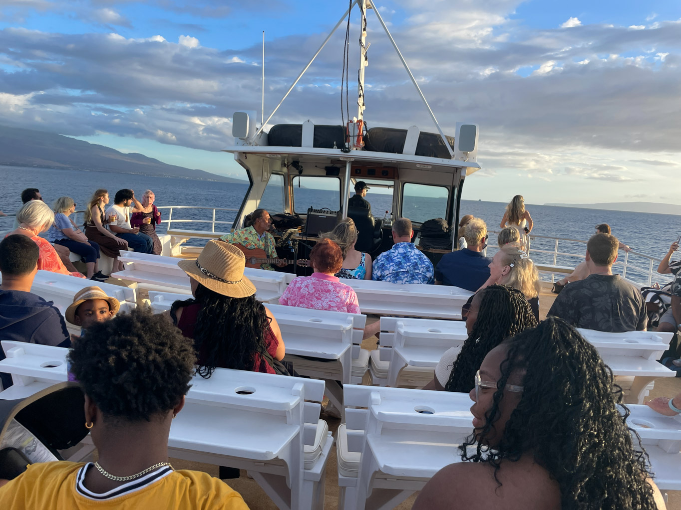 About an hour into the cruise, it was time for dinner. With the boat rocking a bit, the staff kindly helped guests carry food and drinks back to their seats. The meal included roasted garlic vegetables, coconut-infused roasted sweet potatoes, island-style baby back ribs, and shoyu chicken. Dessert featured an island fruit display and lilikoi cheesecake. With a stunning Maui sunset as our backdrop, we thoroughly enjoyed the meal.