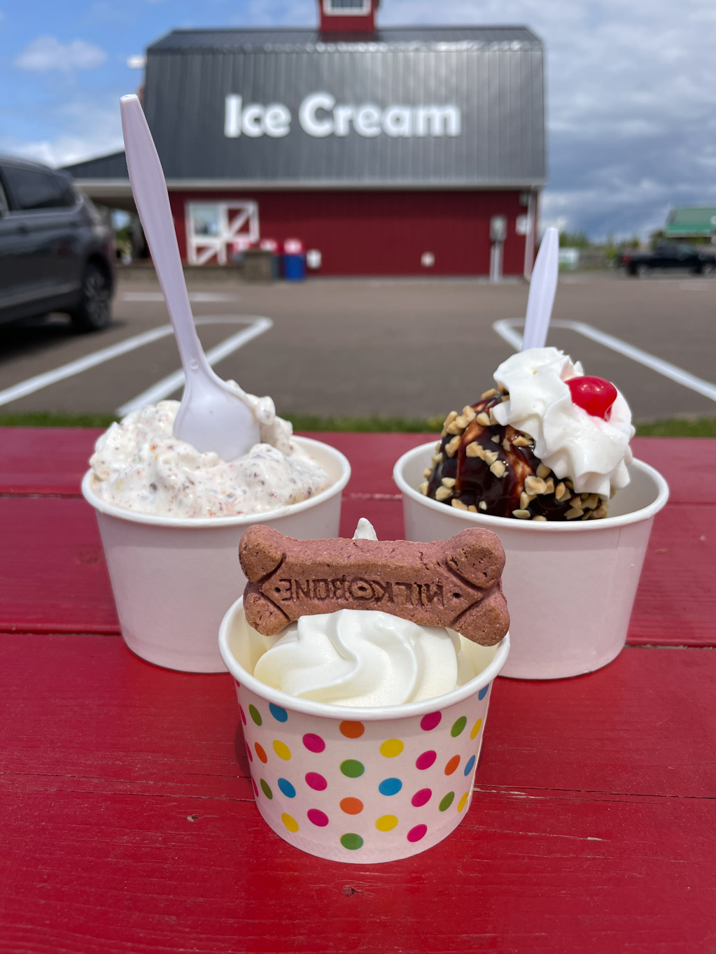 From there, we went into Summerside to Global Pet Foods to pick up a little something from Kai. On the way out of town, we stopped in at Kool Breeze Farms which is a garden centre, farm market, stone yard, seasonal store and ice cream barn. Karen saw on Facebook that they were selling five pound bag of PEI potatoes for $2.97 each or 2 for $5.00. Of course I had to get some to bring back home. And even though we did not have lunch yet, we decided to have dessert including Kai.