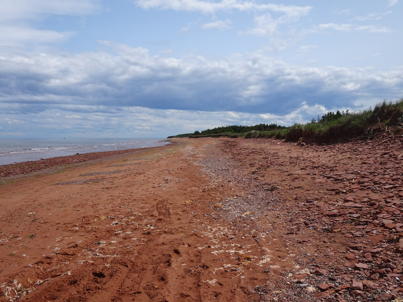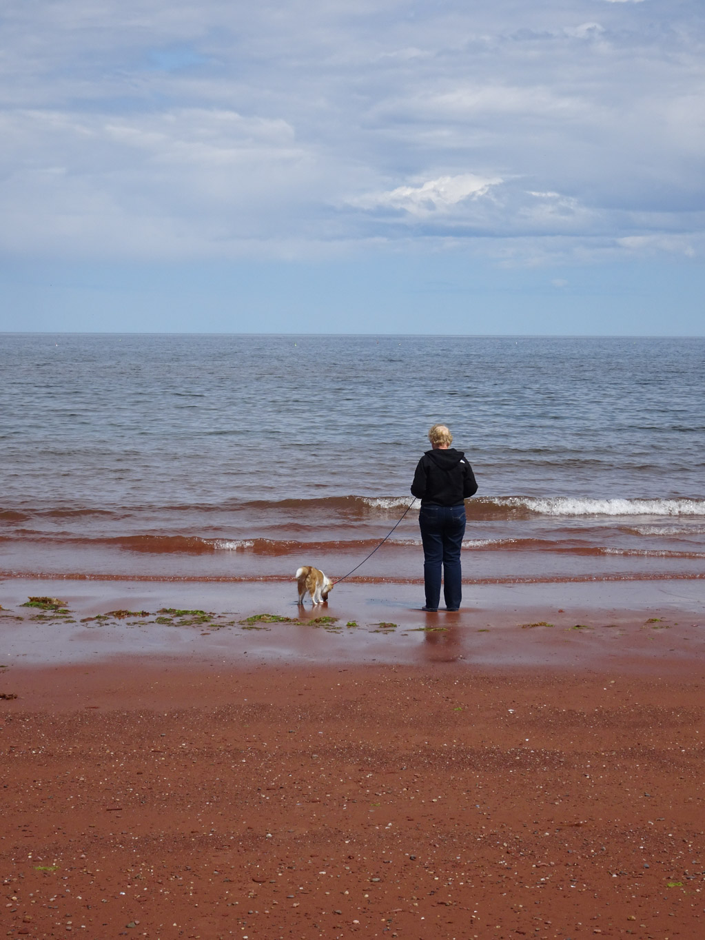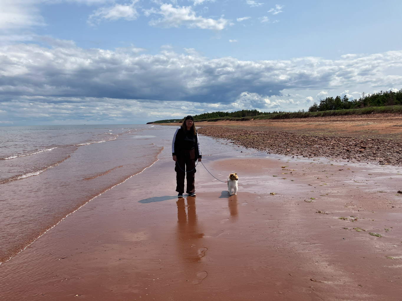 While we were having our ice cream, there was a lady that remembered Karen from the ferry ride. She told us that Donahue Beach in Tignish is really nice and good for dogs. Since we were headed in that direction anyways, we decided to go. When we got there, the beach was empty. Kai was getting braver with the waves and getting his feet wet.