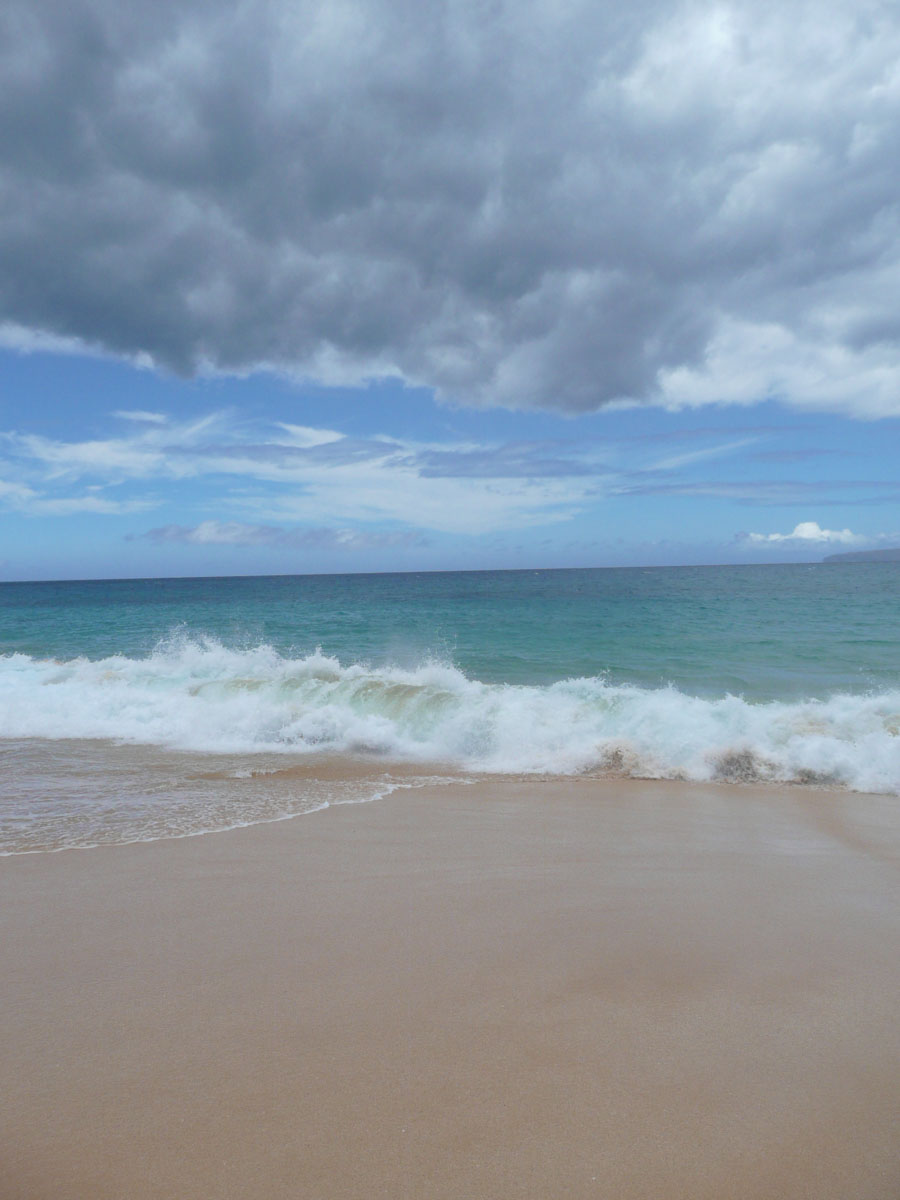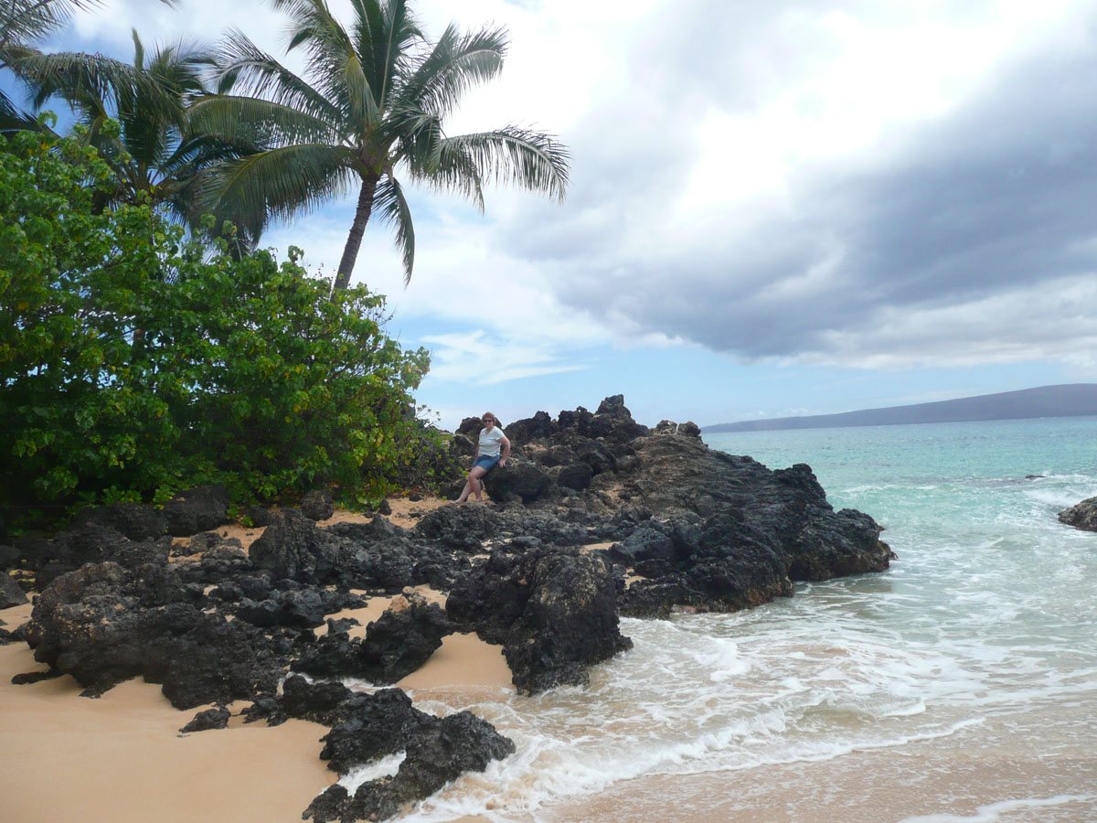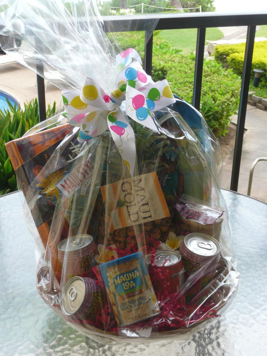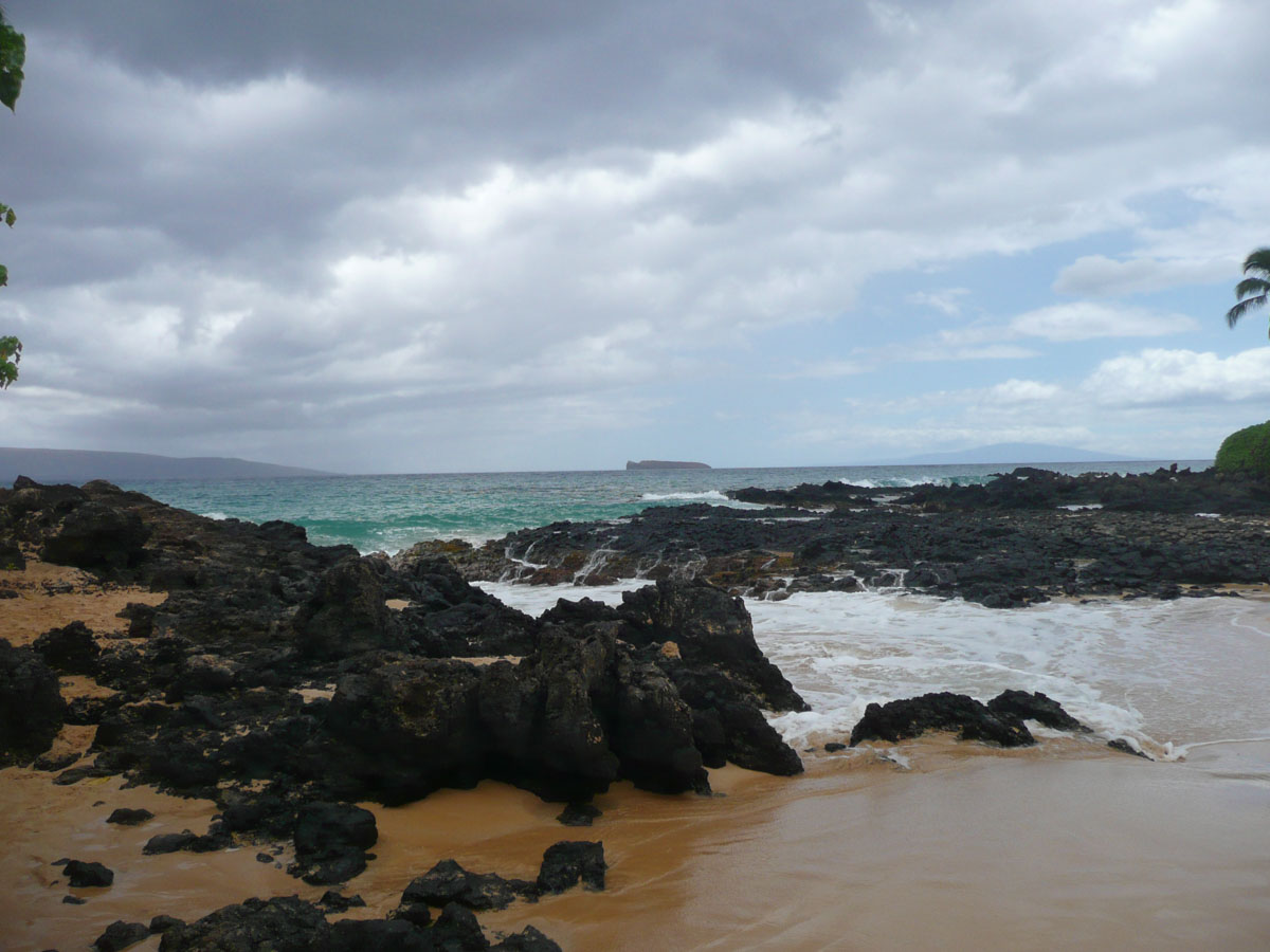 We got the car packed up including lunch from 808 Deli and made the half an hour trip to the beach. Once we got there, it was a short hike to our spot. It was very windy today which made for very rough waters. Too rough for us to go in. We spent the next few hours reading, napping, eating and just relaxing. All of a sudden, a big cloud came over and started dropping rain on us. That was our cue to leave. On the way back to the condo, we stopped in at Secret Beach. This is a beach that unless you have read Maui Revealed, you would not know about it. The beach is hidden by a huge lava rock wall and the only way you can find it is by looking for the telephone poll marked E2-3. Once you go through the little walkway, you are rewarded with a spectacular view. We got back to the condo and I was greeted by a beautiful gift basket from Darren, Allison, Shayla and Sienna. Thank you guys. We had a quick dip in the pool before retiring to a couple of loungers beachside.