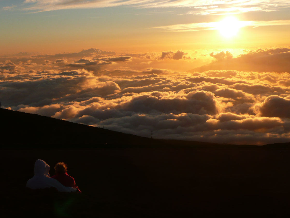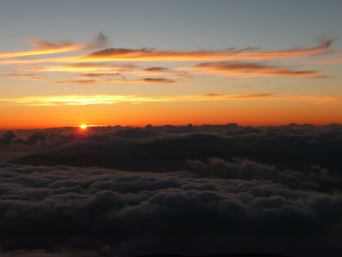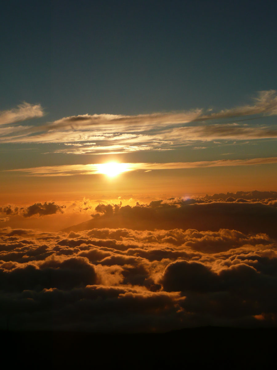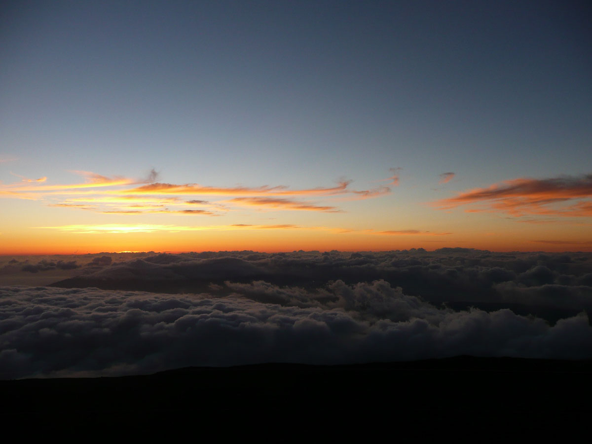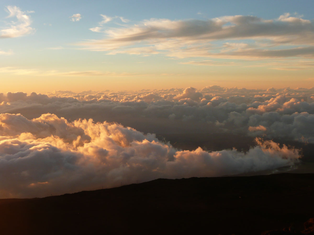 Most people go to Halelaka National Park to experience sunrise at the top of the dormant volcano. We wanted to do something different so we decided to head up there for sunset. The drive which takes about one and a half hours can get very dangerous at times. There are many switchbacks and at some points, there is nothing between you and falling down the side of the volcano. We started the trip at the bottom with a temperature in the mid 80’s and as we drove through the clouds, we reached the summit where the temperature was now 55°F. We quickly got our warm clothes on and started up to the viewing area.