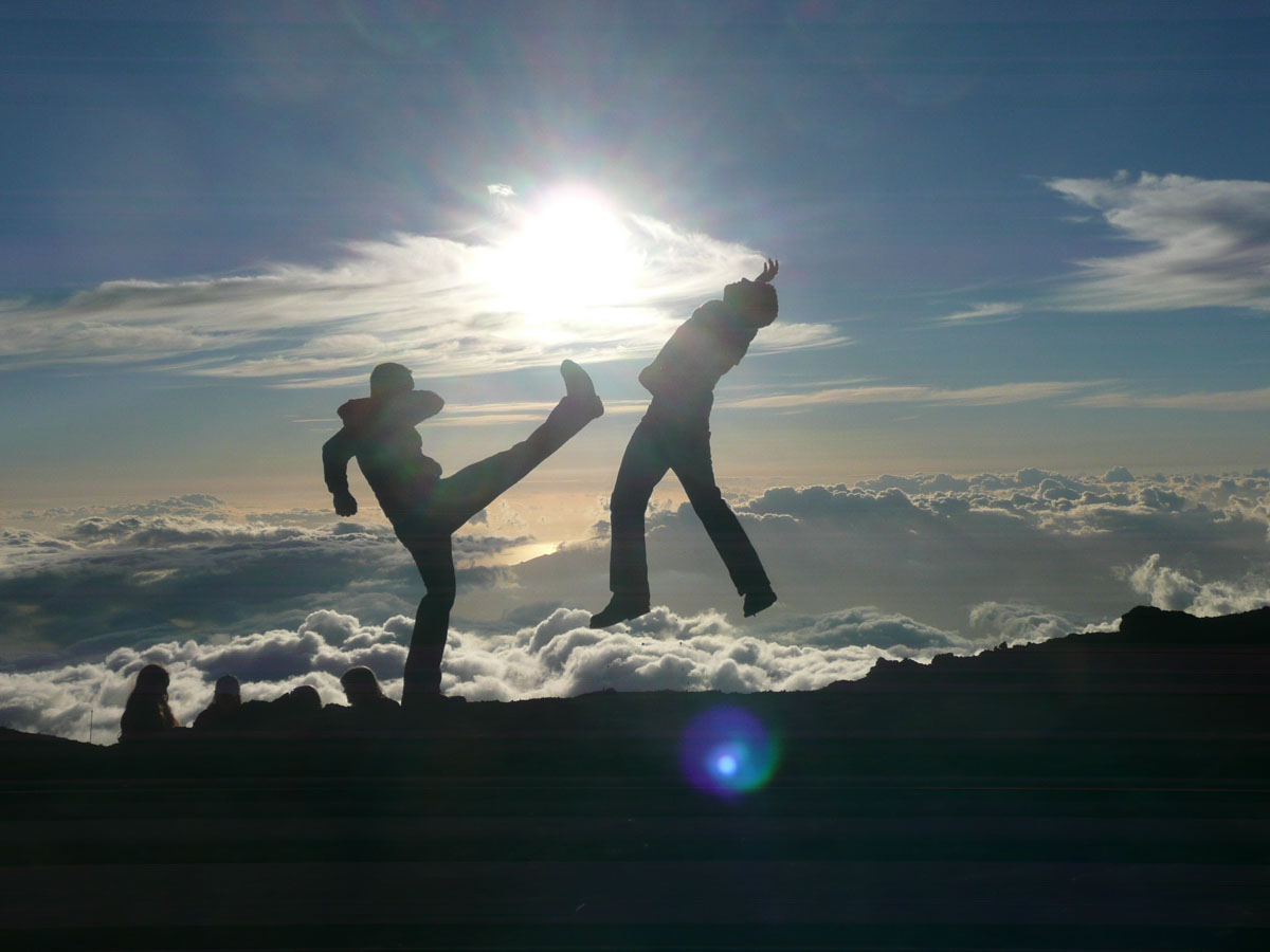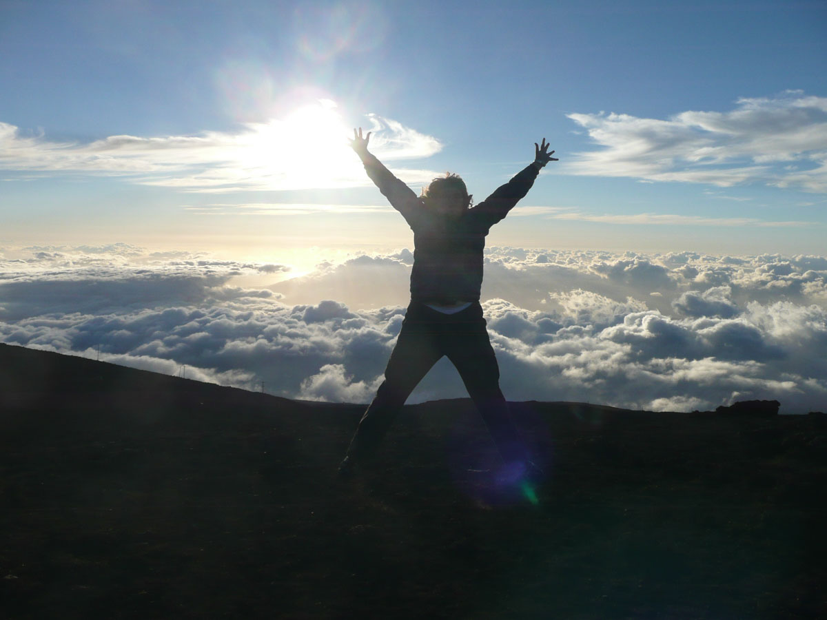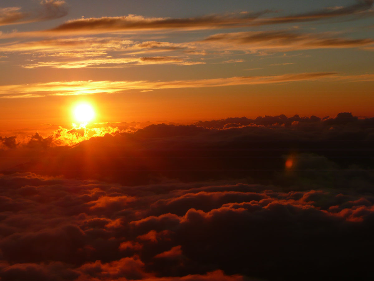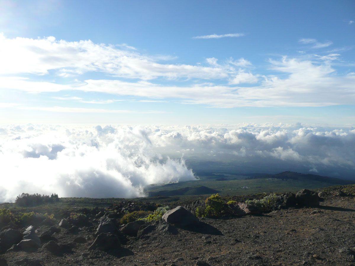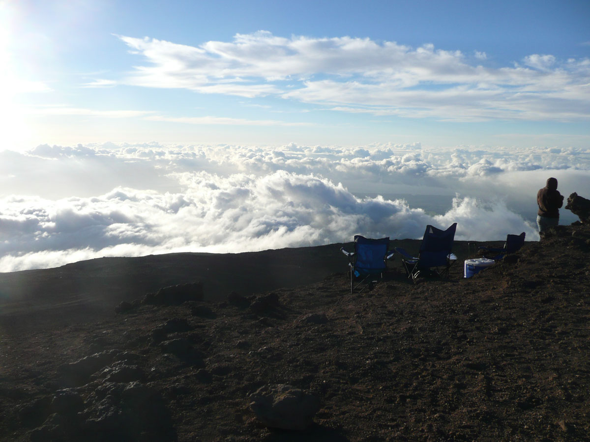 Most people go to Halelaka National Park to experience sunrise at the top of the dormant volcano. We wanted to do something different so we decided to head up there for sunset. The drive which takes about one and a half hours can get very dangerous at times. There are many switchbacks and at some points, there is nothing between you and falling down the side of the volcano. We started the trip at the bottom with a temperature in the mid 80’s and as we drove through the clouds, we reached the summit where the temperature was now 55°F. We quickly got our warm clothes on and started up to the viewing area.