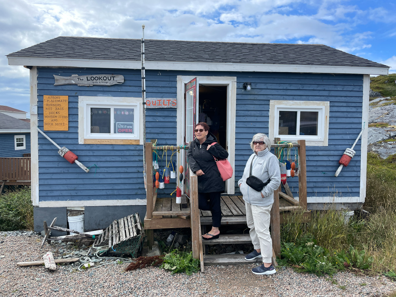 The next stop was Lookout Quilts and Things. This shop sells locally made items including socks, mittens and quilts. As we walked in, the owner said to Pauline “You must be Bride Sheppard’s daughter”. This is a phrase we heard many times today. They have such beautiful items that we all ended up buying something. We made a few more stops before heading back to the house for lunch where Dennis fried up some mackerel and cod tongues.