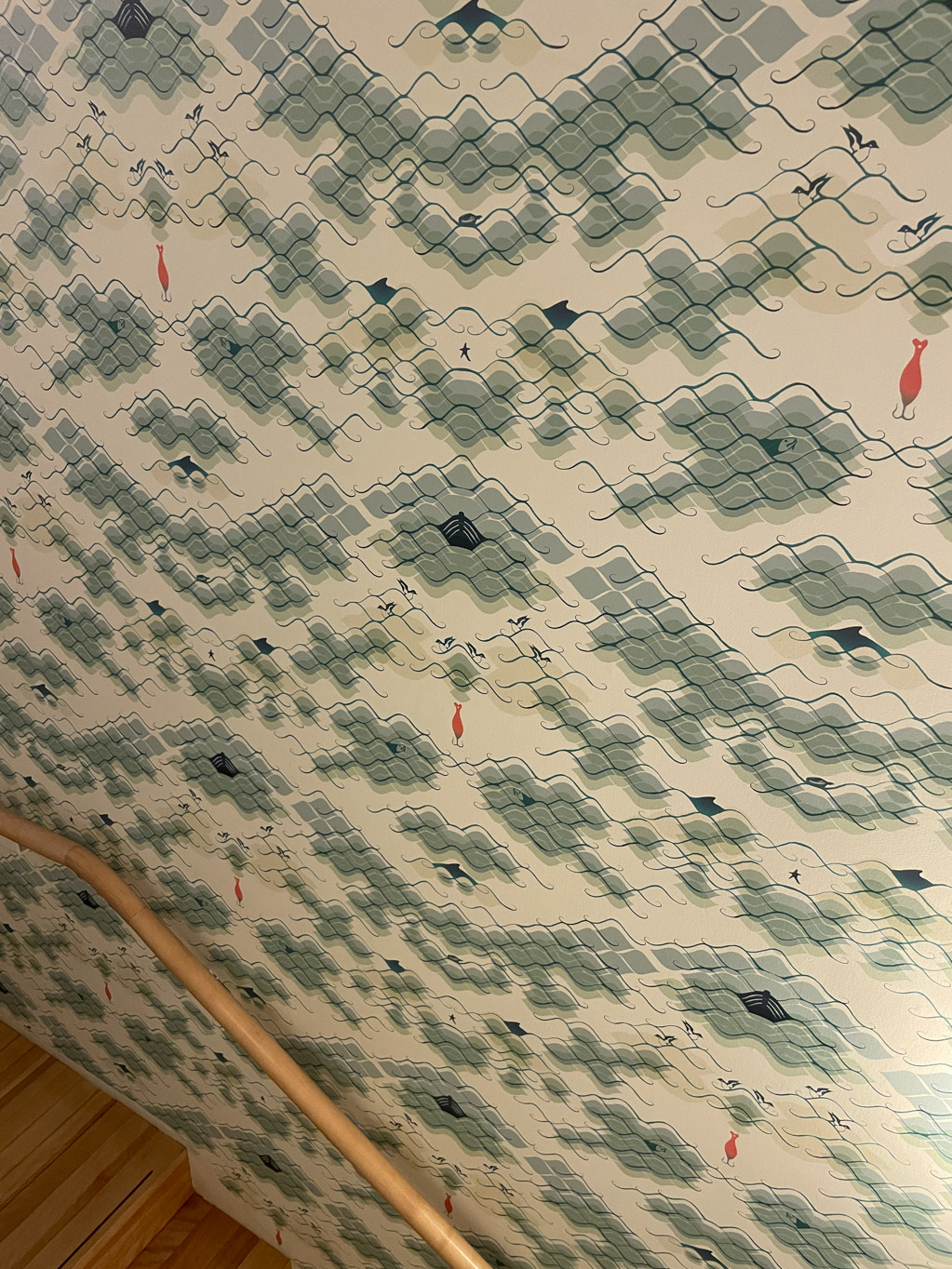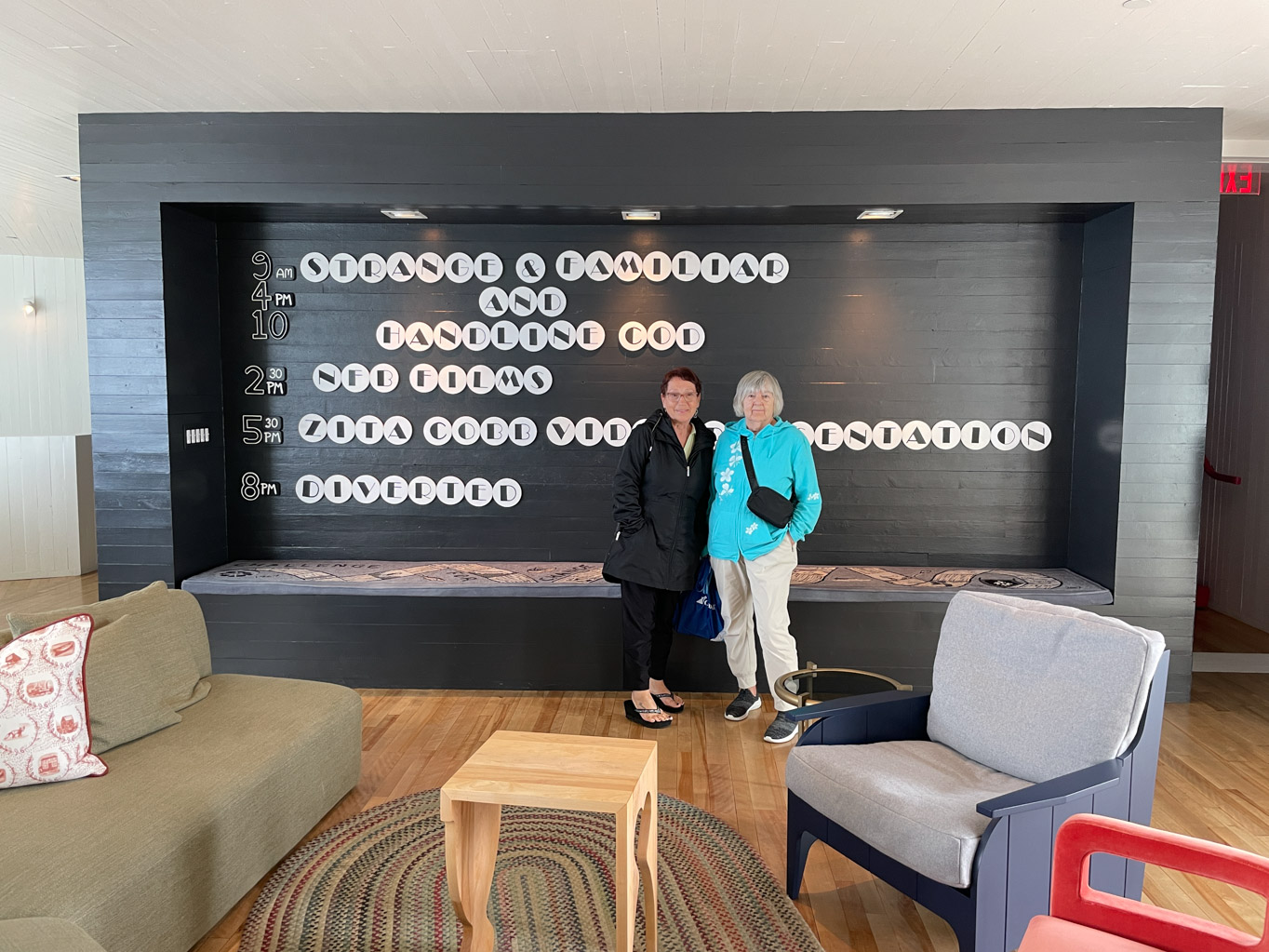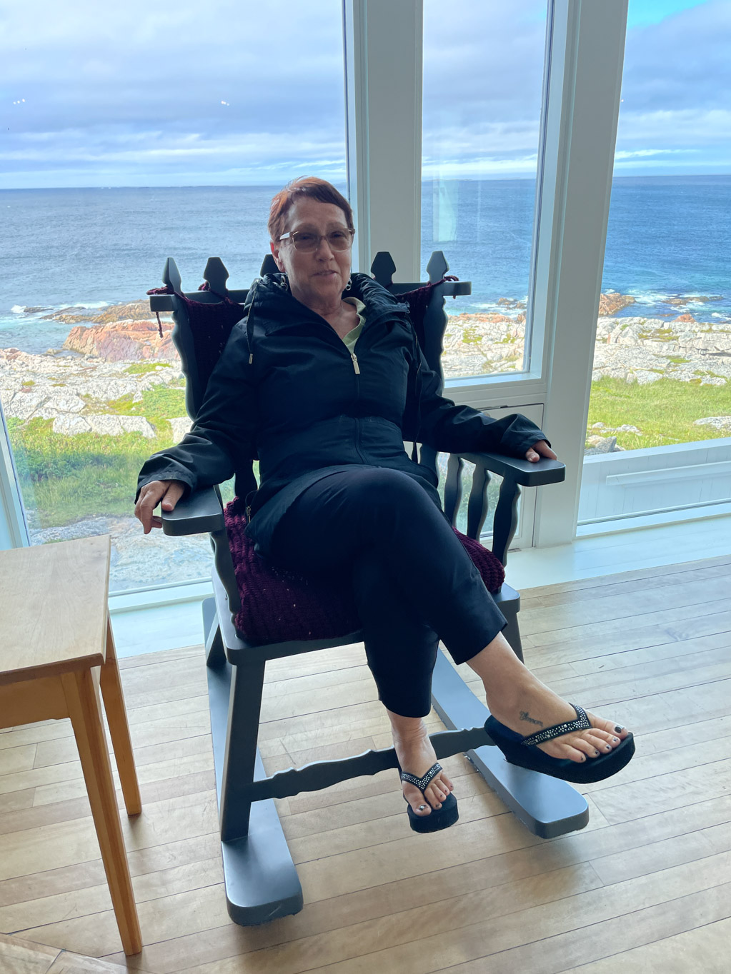 We started up on the fourth floor which has the rooftop hot tubs and sauna along with many of the guest rooms. As we worked our way down the stairwells, we noticed the unique wallpaper. Grace explained that it was custom and that each one told a story. For example one told the story of cod jigging. The last two areas we got to see was The Library and The Cinema. During the tour, Grace gave us a lot of information about the inn. I think what made the tour extra special was that we had Pauline with us. Between her and Grace, they told us all about life on Fogo Island. And of course, Grace knows Pauline’s mom.