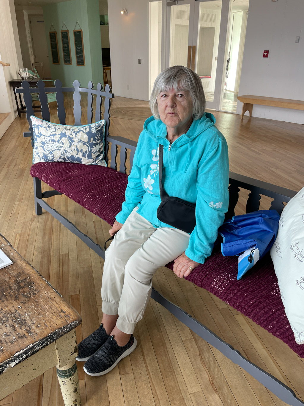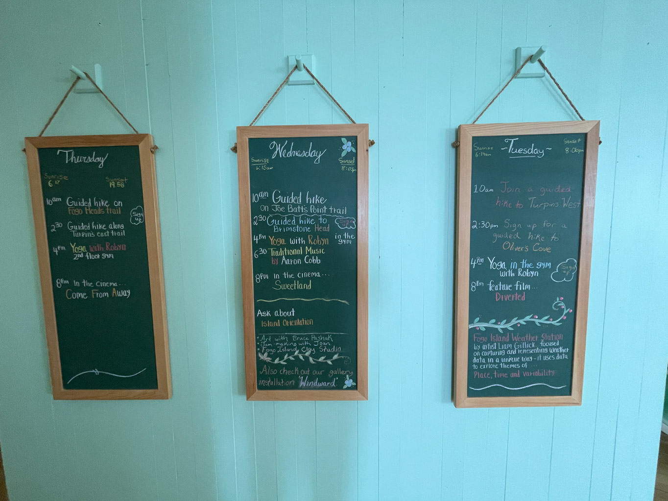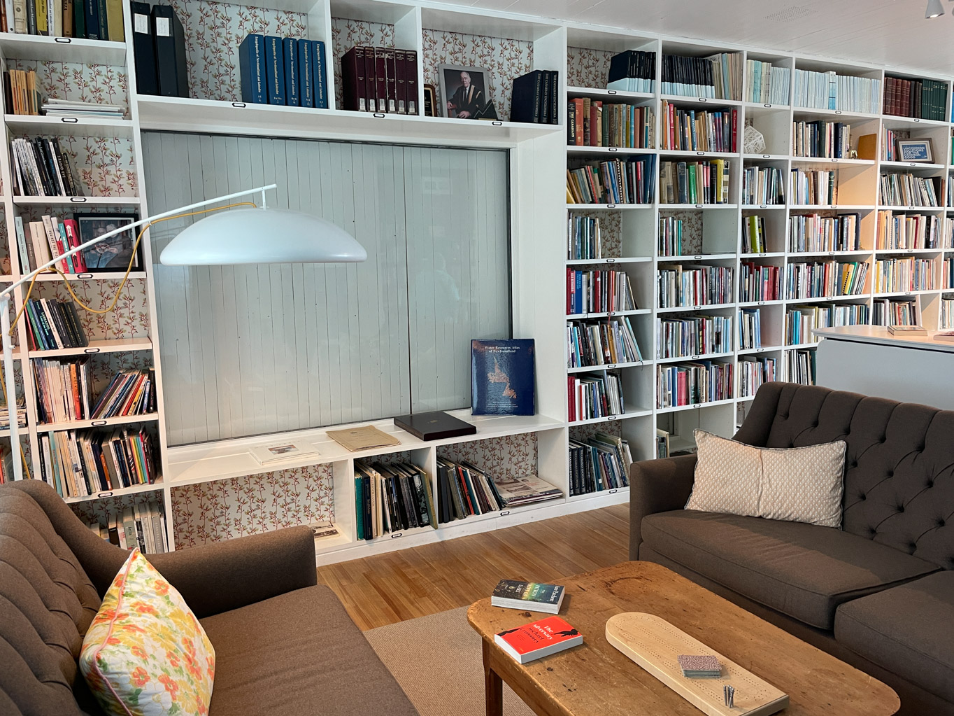 We started up on the fourth floor which has the rooftop hot tubs and sauna along with many of the guest rooms. As we worked our way down the stairwells, we noticed the unique wallpaper. Grace explained that it was custom and that each one told a story. For example one told the story of cod jigging. The last two areas we got to see was The Library and The Cinema. During the tour, Grace gave us a lot of information about the inn. I think what made the tour extra special was that we had Pauline with us. Between her and Grace, they told us all about life on Fogo Island. And of course, Grace knows Pauline’s mom.