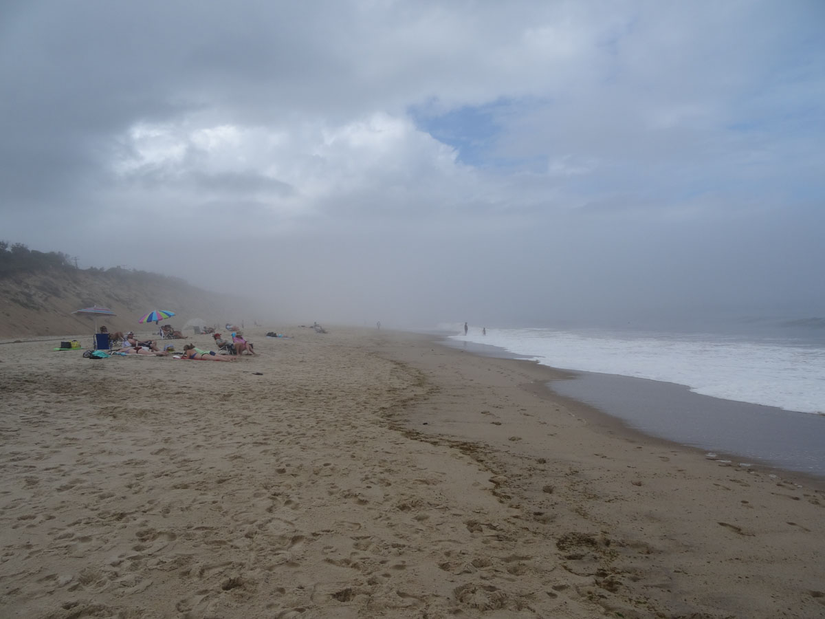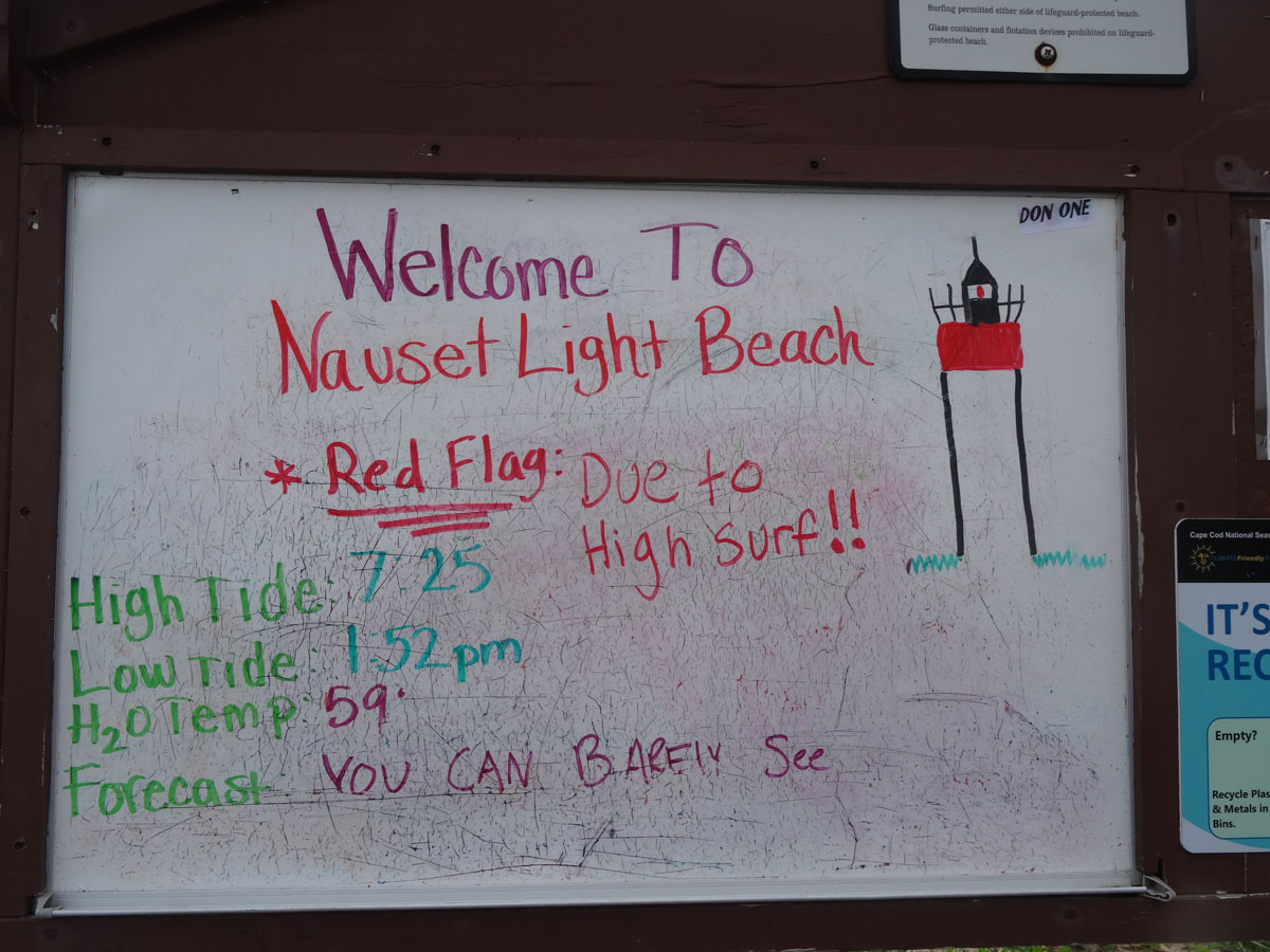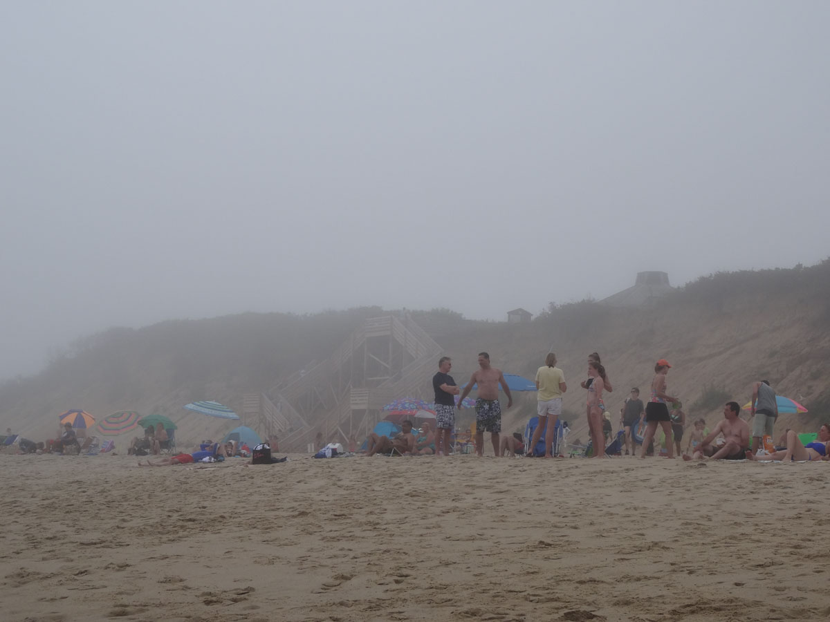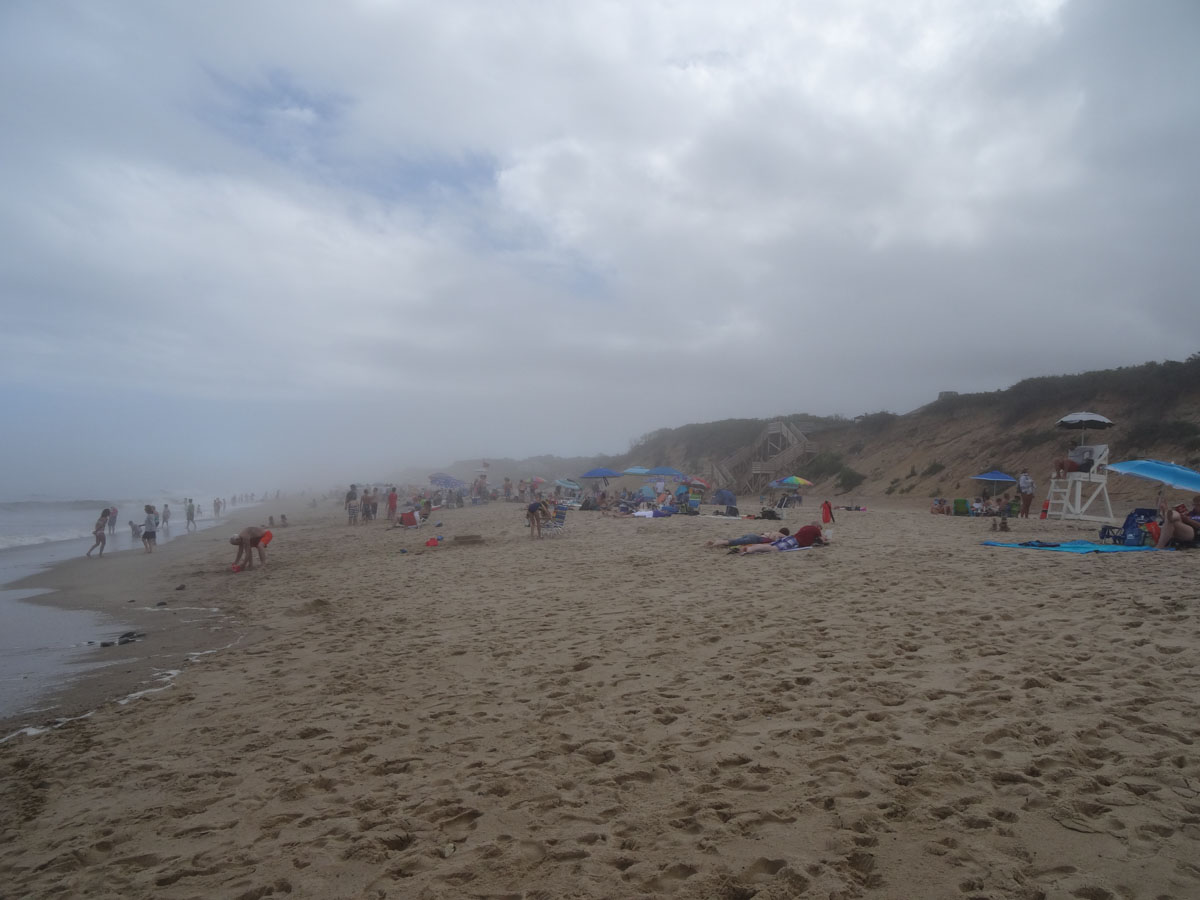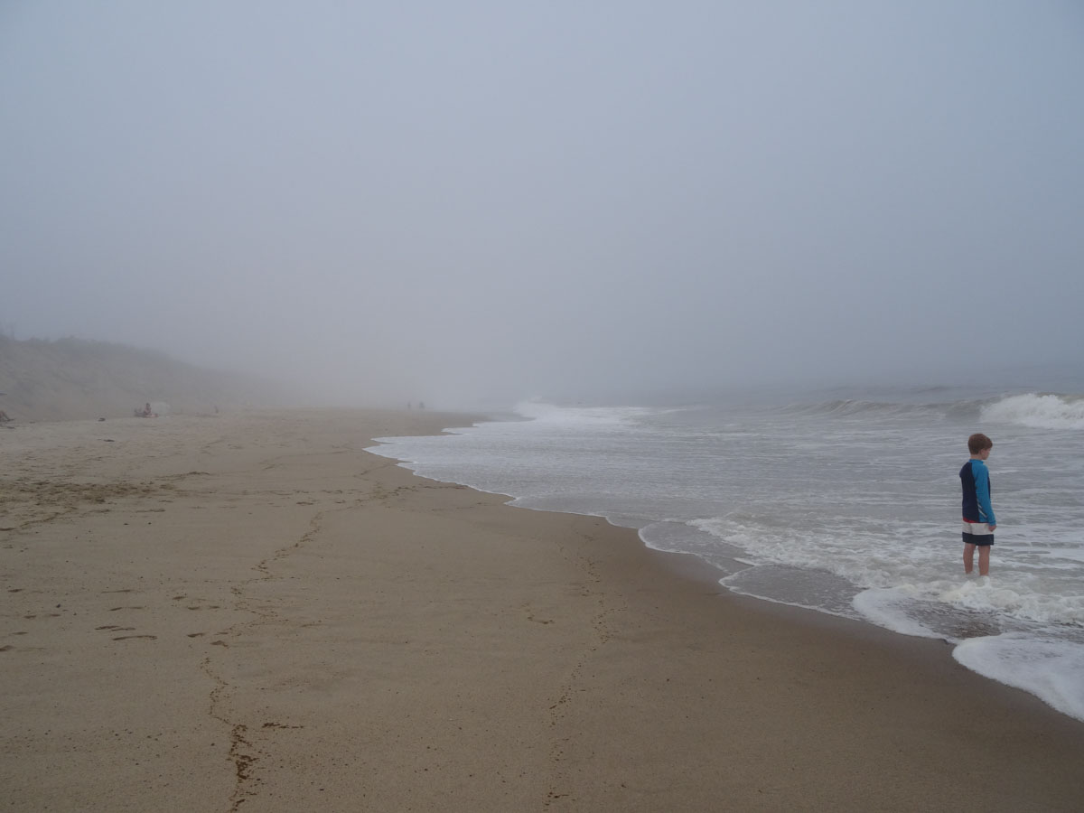 Nauset Light Beach which is in the Cape Cod National Seashore is a big beautiful beach located in the Outer Cape.  As we arrived and parked the car, we noticed that the fog was pretty thick.  Not sure how much of the beach we will see today.  We grabbed all of our stuff and headed down to the beach.  As we were walking down, we noticed a sign saying that there have been recent shark sightings.  In the end, we did not see any sharks but we did see lots of seals.