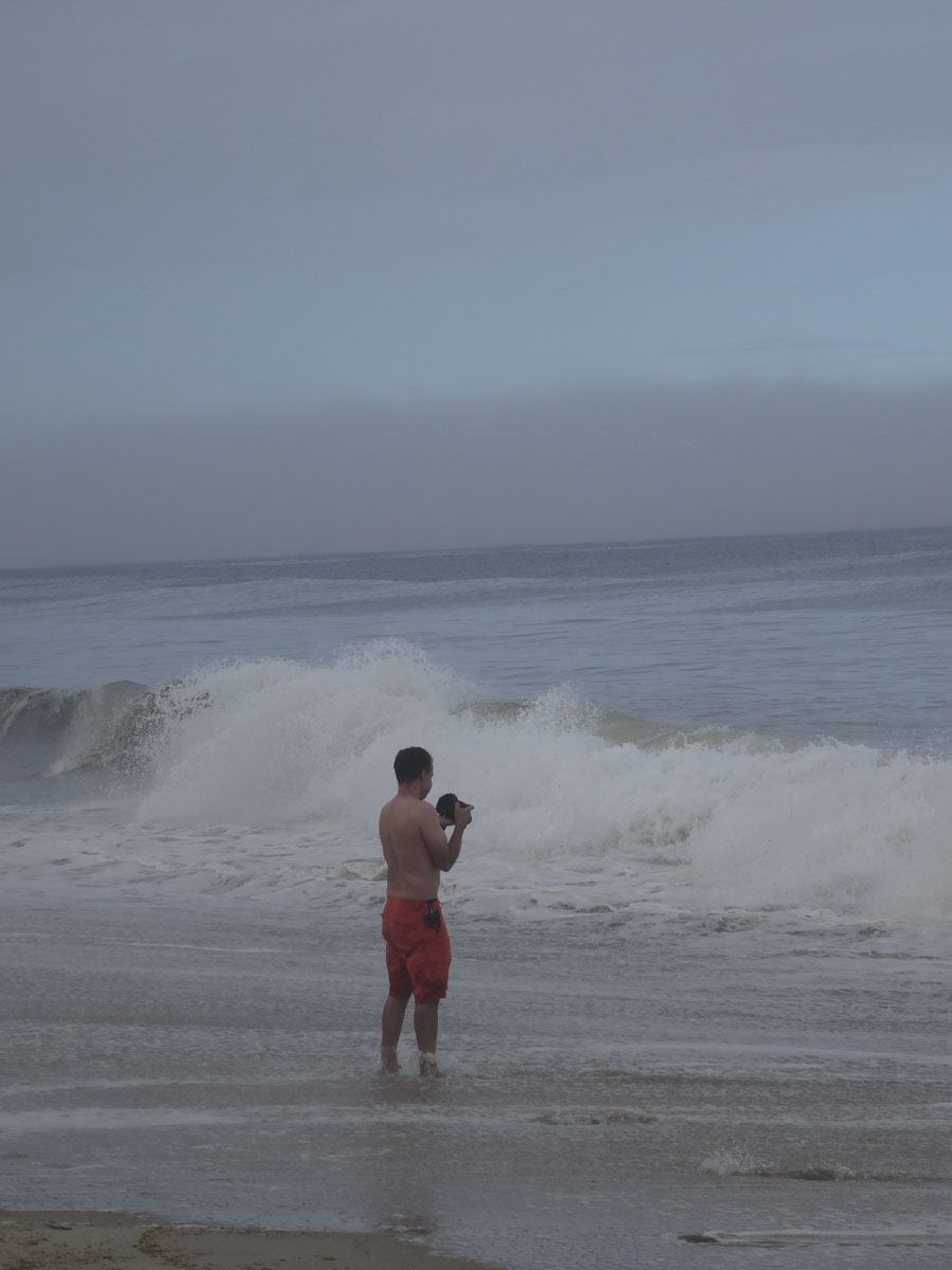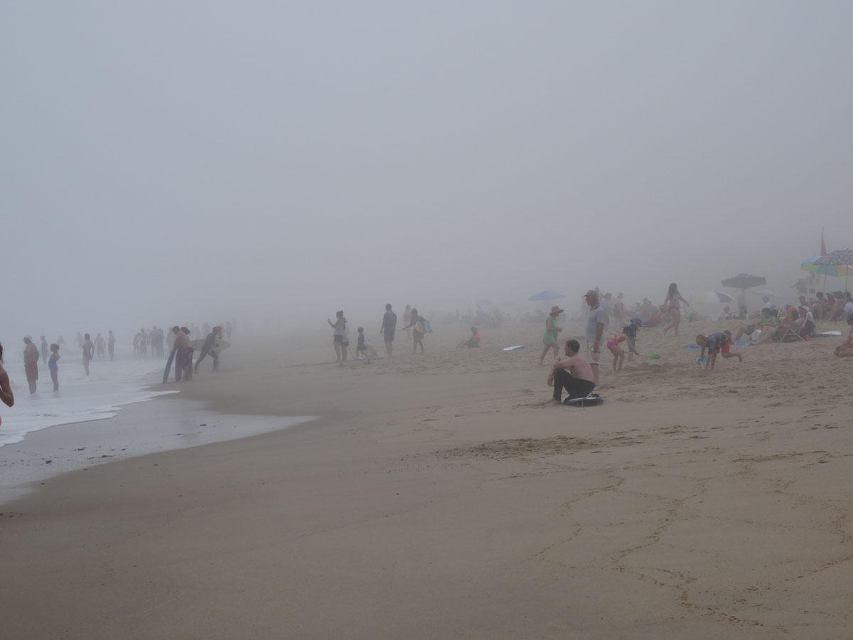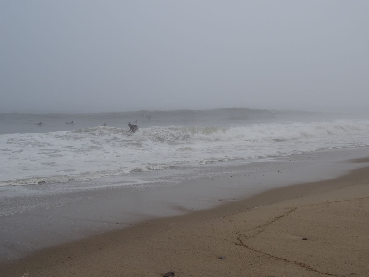 We spent the afternoon doing the typical beach stuff … eating, reading and napping.  Because the waves were so big and the fog was so thick, the only people in the water were the surfers.  It was kind of eerie just seeing everyone standing at the edge of the water.  Around 4:00pm, we decided to pack up and leave.