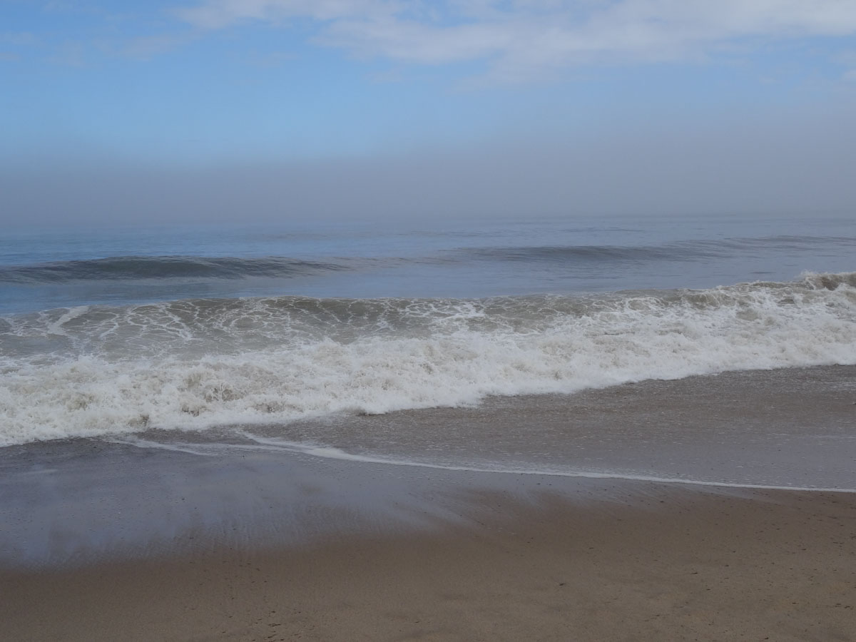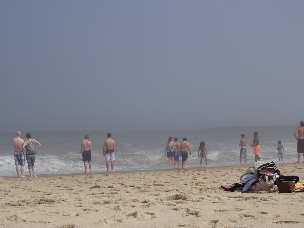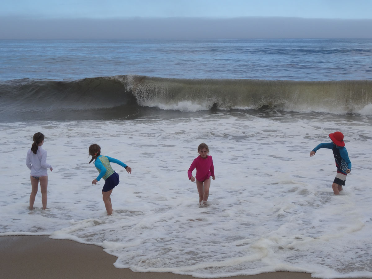 We spent the afternoon doing the typical beach stuff … eating, reading and napping.  Because the waves were so big and the fog was so thick, the only people in the water were the surfers.  It was kind of eerie just seeing everyone standing at the edge of the water.  Around 4:00pm, we decided to pack up and leave.