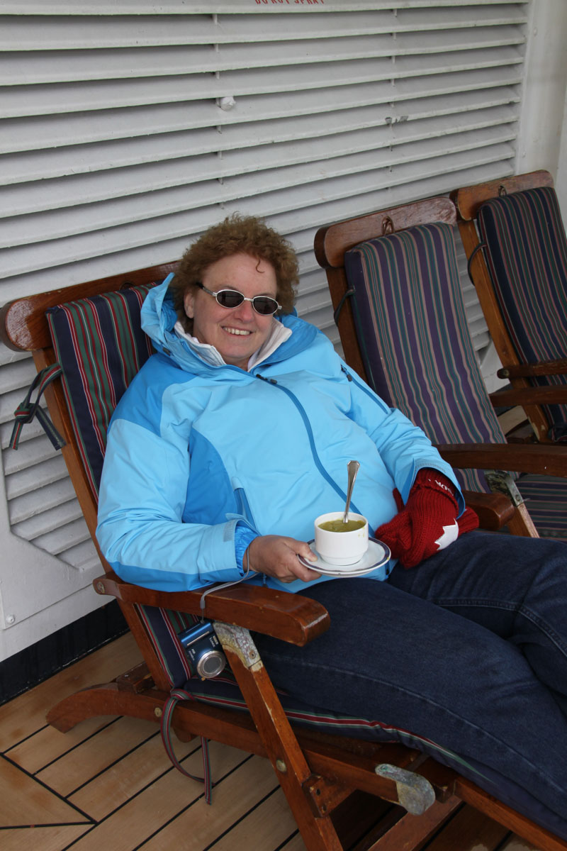 The ship left Margerie Glacier so we headed back inside and had lunch in the Vista dining room. Papa had the tortilla soup with mushrooms and the fusilli prima vera, Nana had the greek salad and the mint and cilantro crusted tilapia, Karen and I each had the apple and pear gazpacho but she had the tomato and bread salad with tender chicken bites and I went with the fish. After lunch, Nana and Papa went back to their room while Karen and I headed back to the pool to spend the afternoon looking for wildlife while cruising out of the park. We saw sea otters, sea lions, mountain goats, whales and even dolphins.