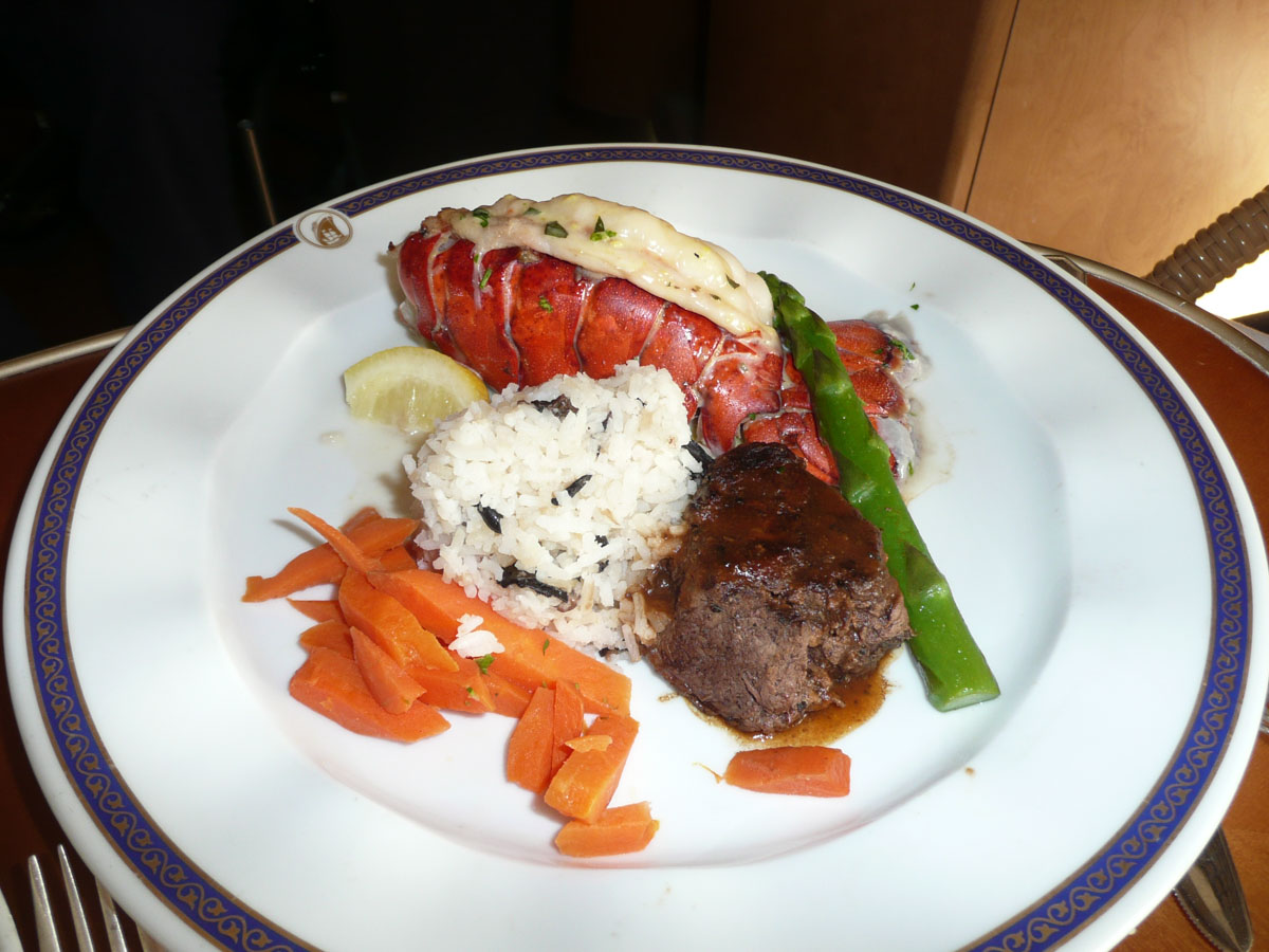 We hit the casino before going back to the rooms to order dinner. We learned from Cruise Critic that you can order anything that is being served in the main dining room for room service. Since we didn’t bring our formal wear, we decided to do that. And guess what they were having in the main dining room tonight, surf and turf. It was a very nice meal with a stunning view.