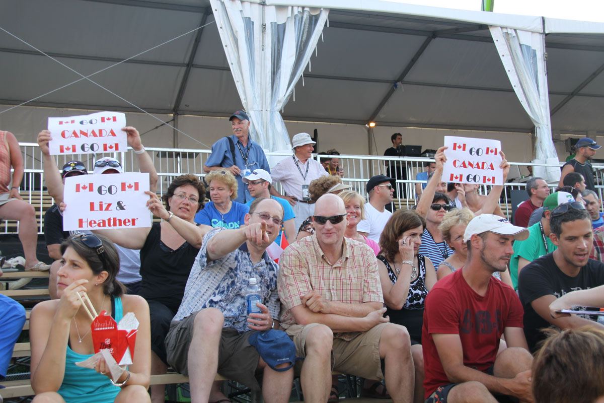 Liz and Heather’s first opponents were the team from France. It was an exciting match that took three games to complete. Between the first and second match, the Paisley Maloneys (Dave, Cathy and Michael) arrived to cheer the girls on. We were off to Court 1 (where the temperature was 39°C) to watch them play against Japan. This match only took it to two games and the girls were on a roll. The last match of the day was against The Netherlands (who were seeded 13th). This was the most exciting match so far. Both games were very close and in the end, Canada was victorious.