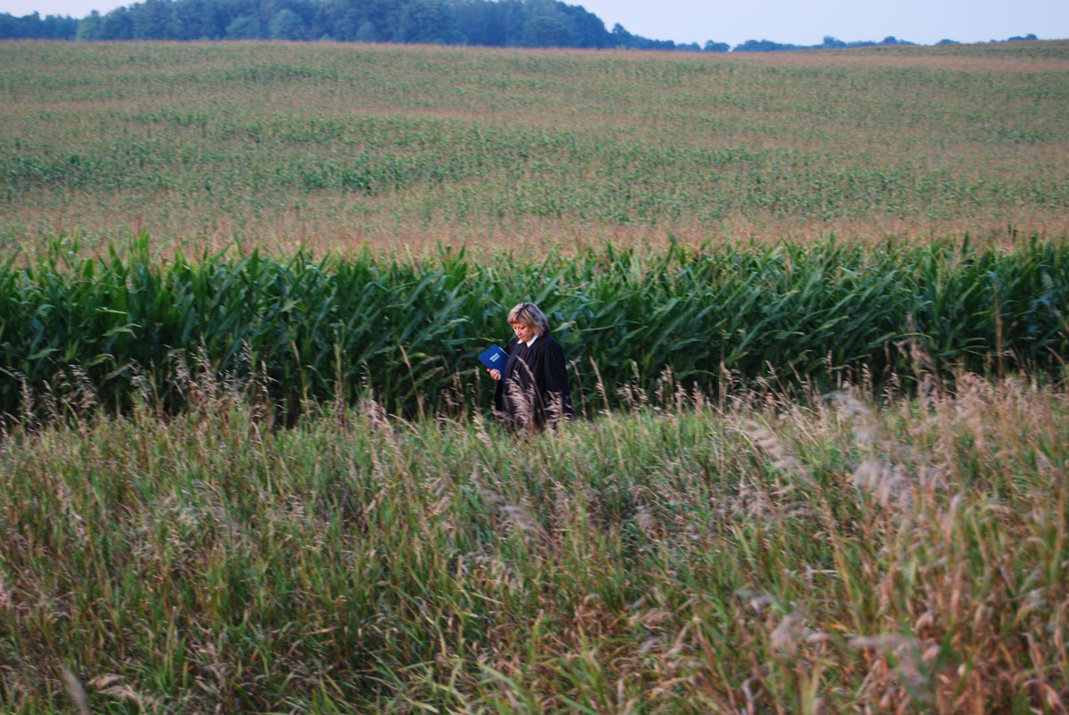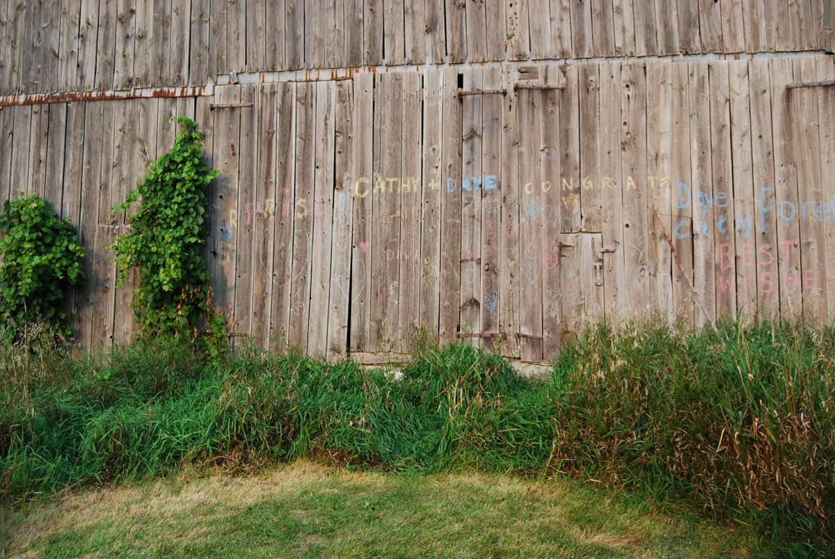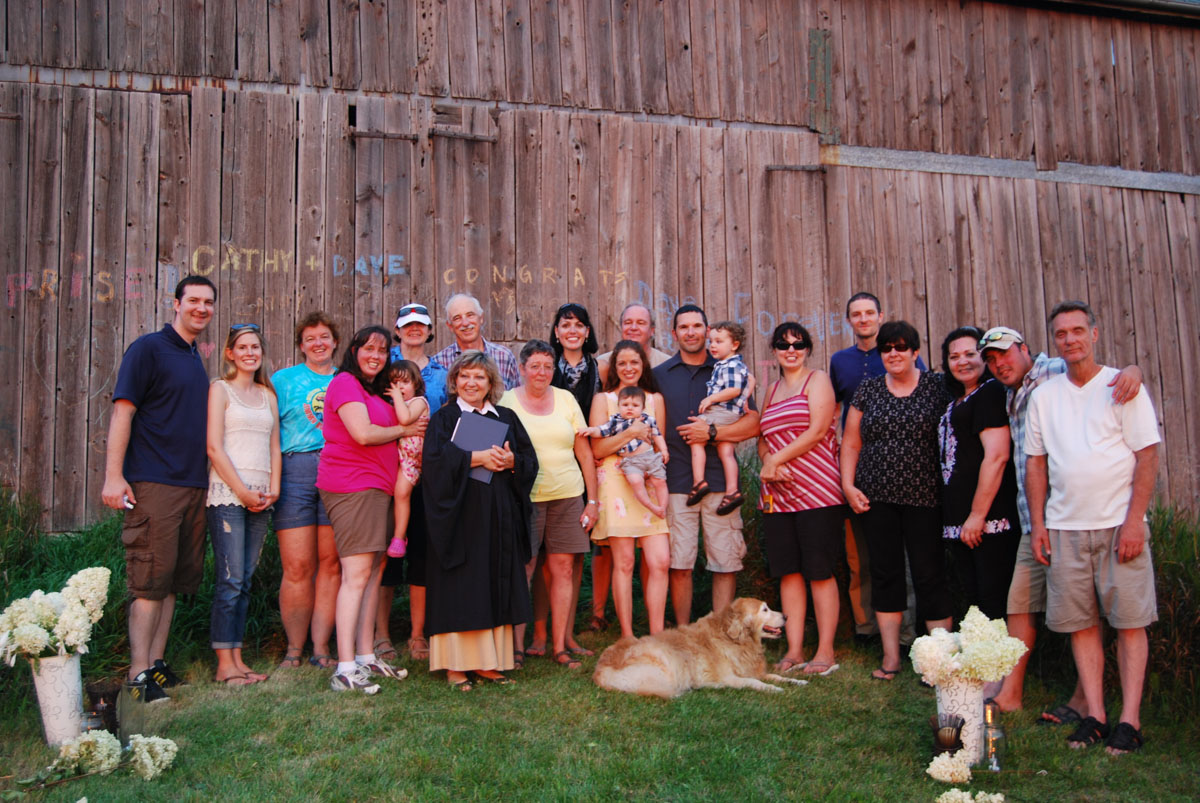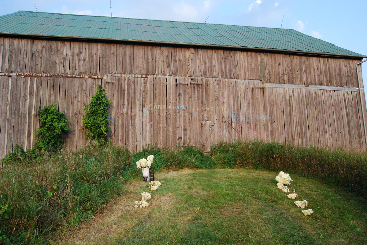 We had about an hour before the ceremony to get the wedding site decorated. Dave and Cathy decided to get married in front of their barn overlooking the corn fields. People grabbed chalk and started writing well wishes on the side of the barn. Others decorated the pathway with flowers and candles. It came together very quickly and looked stunning.