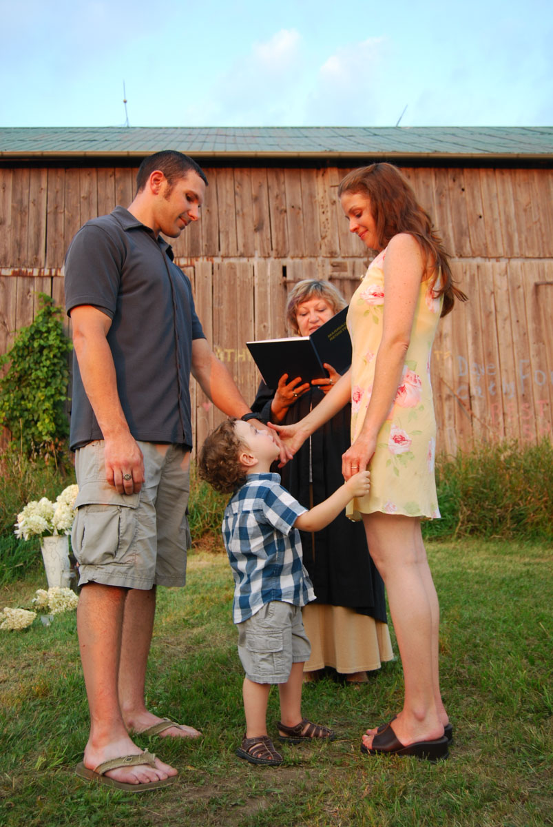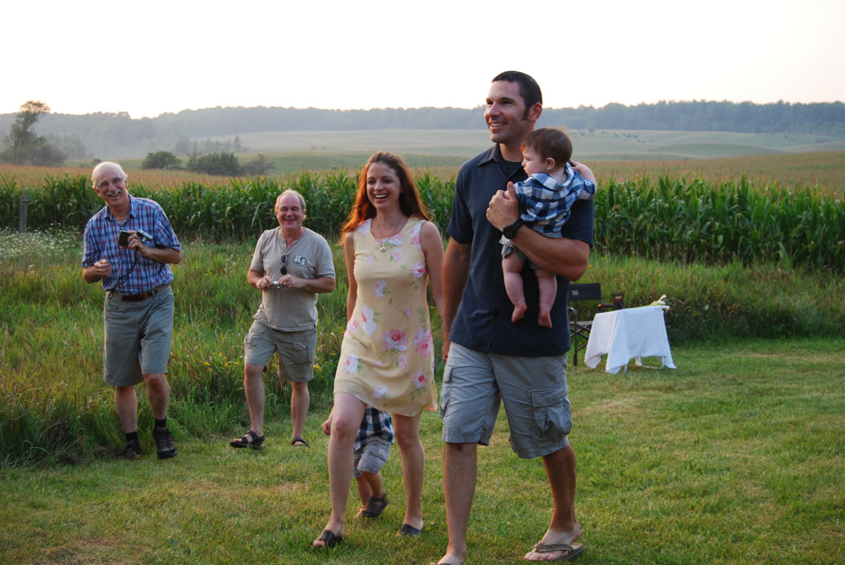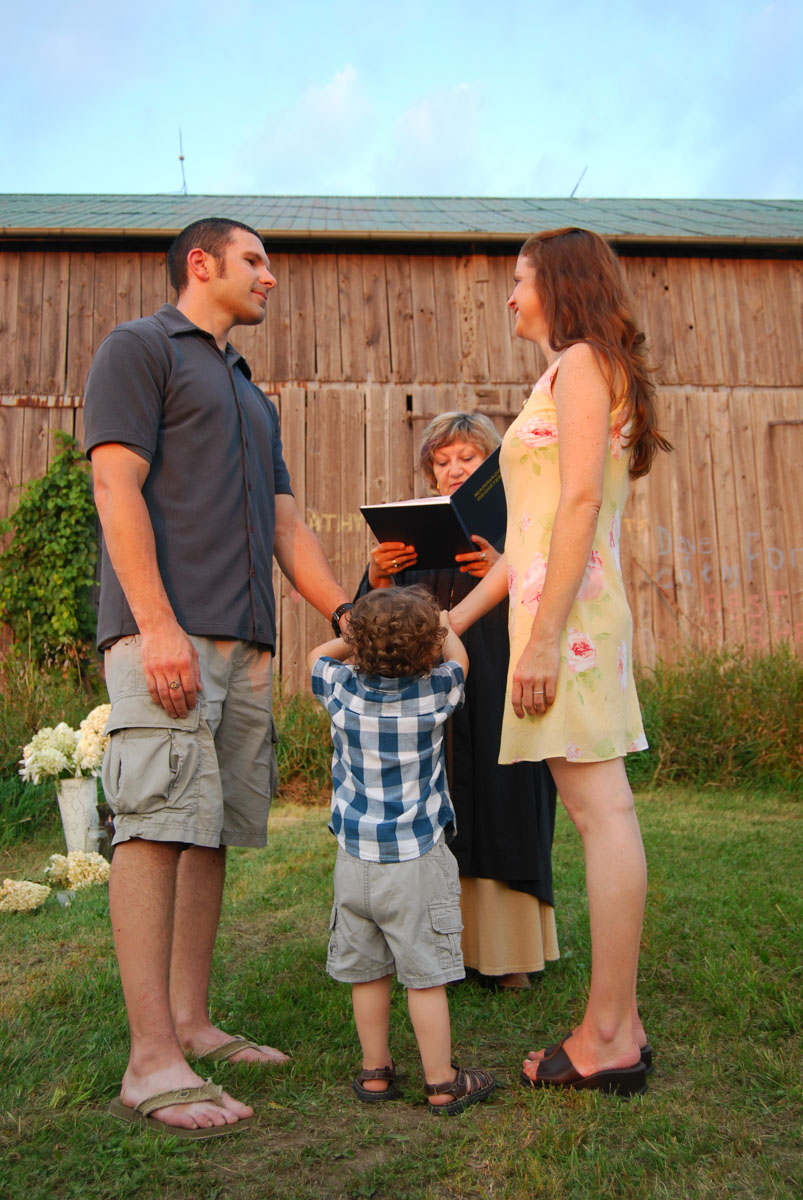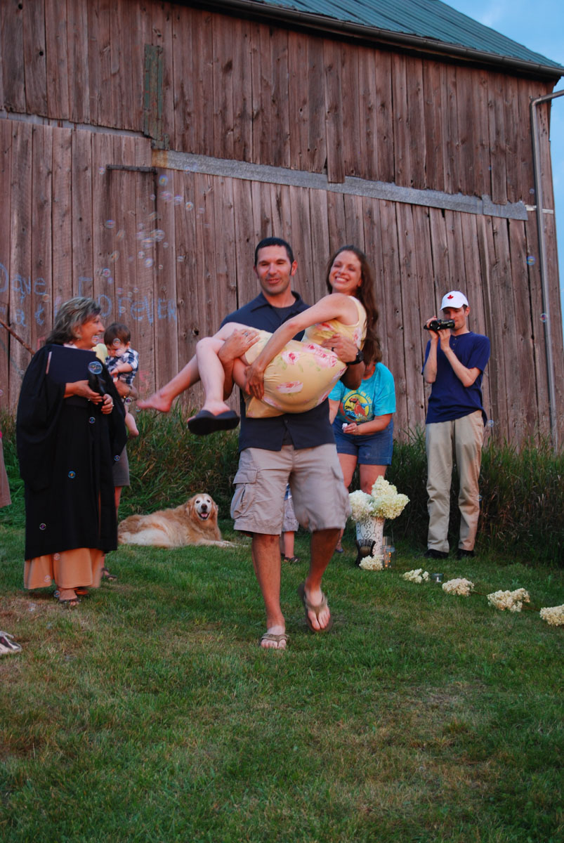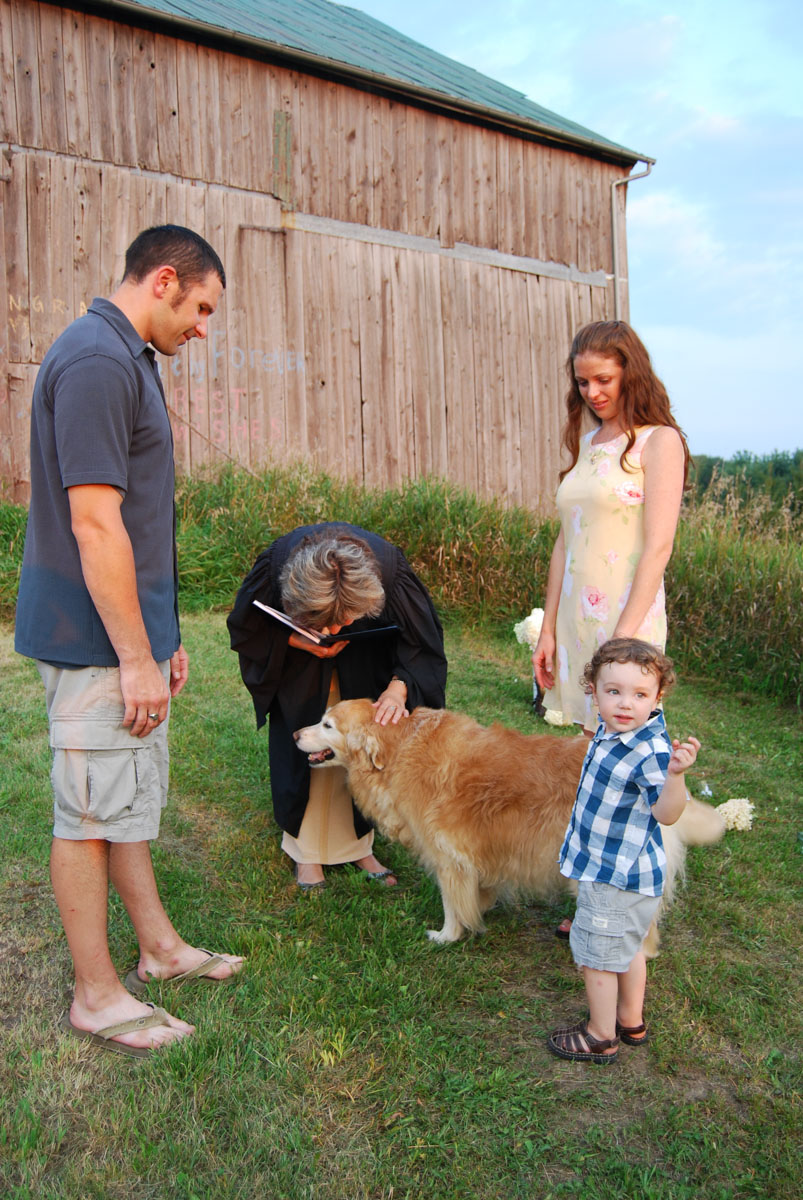 Soon it was sunset and the ceremony began. Dave and Cathy walked down the aisle with their two sons Michael (2 years old) and Liam (7 months old). Their 13 year old Golden Retriever Maggie shortly followed them and took her place. It was a beautiful ceremony, short and sweet. When it came time to exchange rings, Michael and Liam each had one in their cargo pants pocket. It was so cute. Just as the justice of the peace pronounced them husband and wife, Cathy got stung in the bottom of her foot by a bee. Dave then had to carry her down the aisle. A quick signing of the paperwork followed just in front of the cornfields.