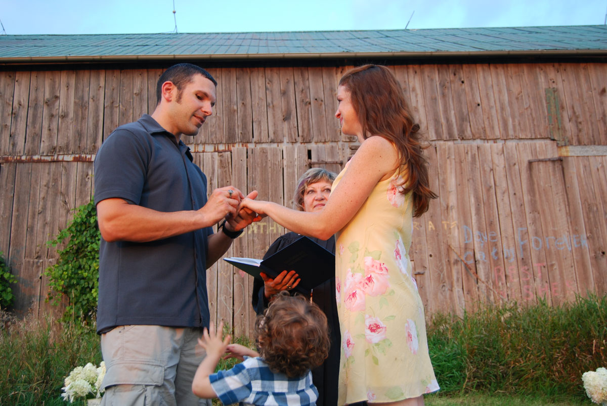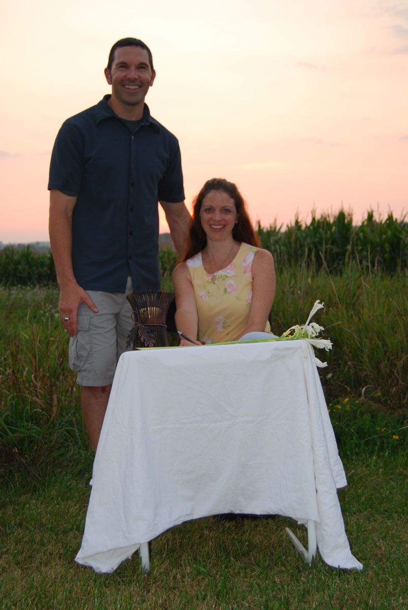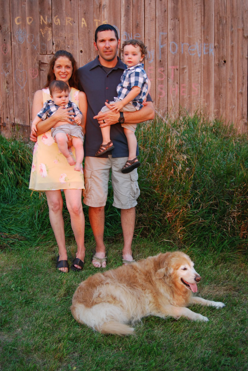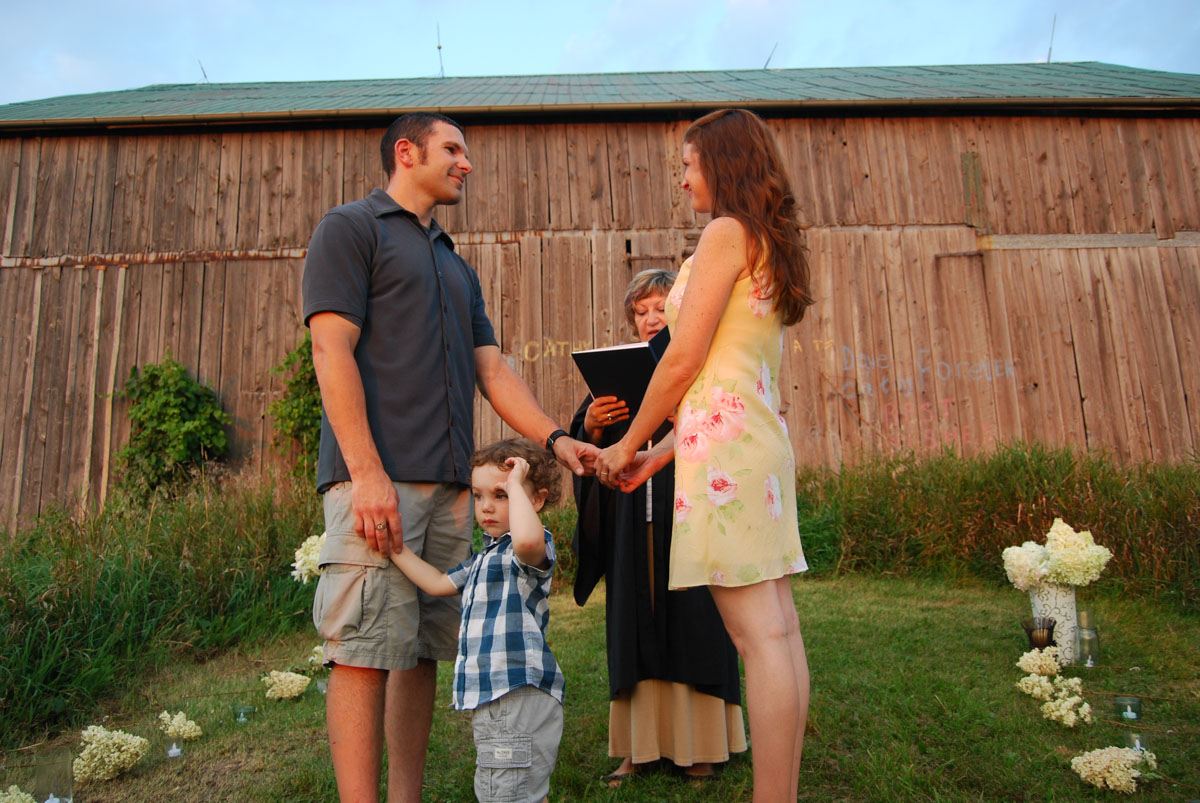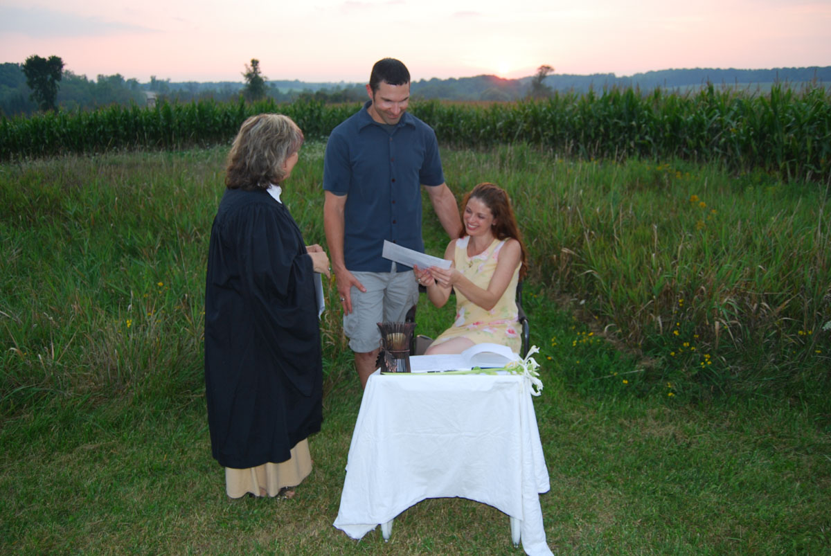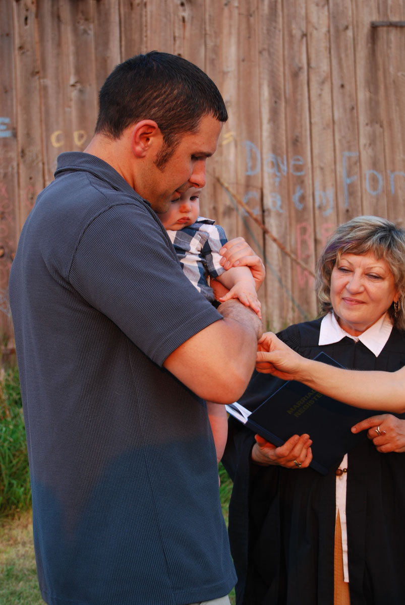 Soon it was sunset and the ceremony began. Dave and Cathy walked down the aisle with their two sons Michael (2 years old) and Liam (7 months old). Their 13 year old Golden Retriever Maggie shortly followed them and took her place. It was a beautiful ceremony, short and sweet. When it came time to exchange rings, Michael and Liam each had one in their cargo pants pocket. It was so cute. Just as the justice of the peace pronounced them husband and wife, Cathy got stung in the bottom of her foot by a bee. Dave then had to carry her down the aisle. A quick signing of the paperwork followed just in front of the cornfields.