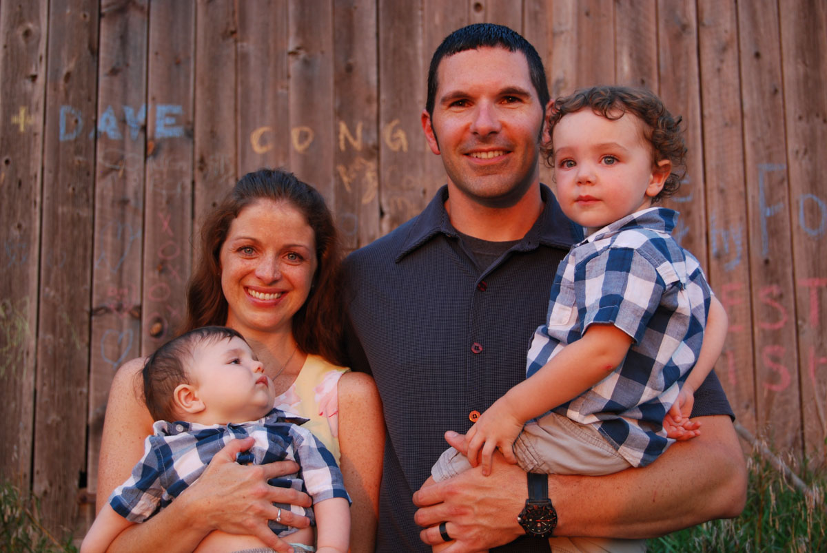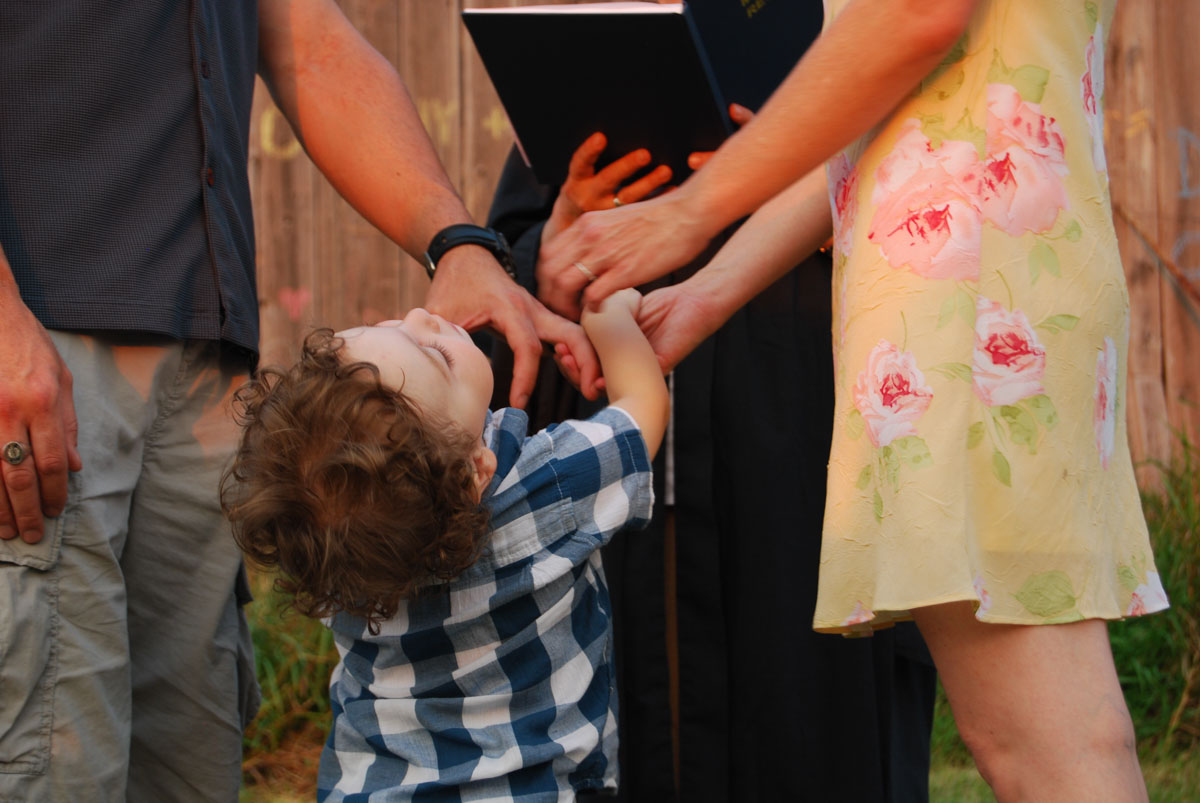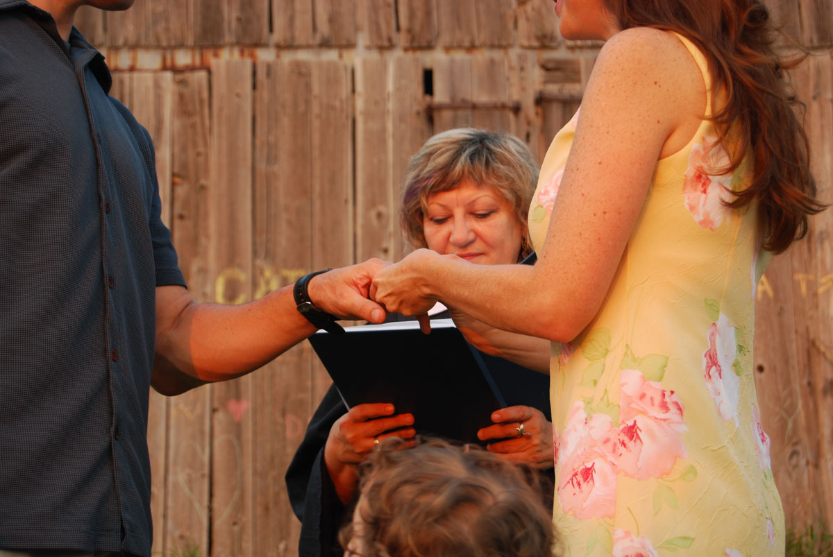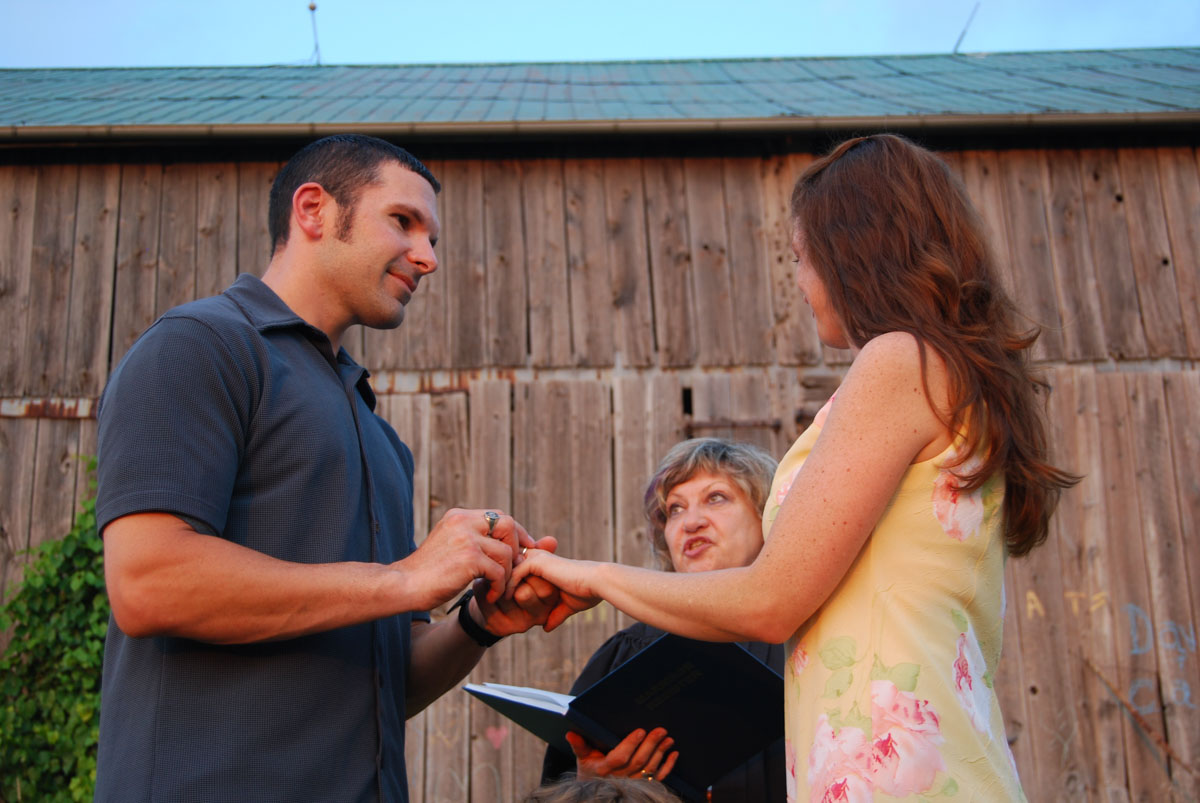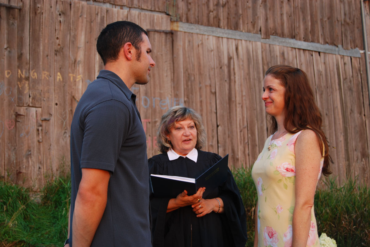 Soon it was sunset and the ceremony began. Dave and Cathy walked down the aisle with their two sons Michael (2 years old) and Liam (7 months old). Their 13 year old Golden Retriever Maggie shortly followed them and took her place. It was a beautiful ceremony, short and sweet. When it came time to exchange rings, Michael and Liam each had one in their cargo pants pocket. It was so cute. Just as the justice of the peace pronounced them husband and wife, Cathy got stung in the bottom of her foot by a bee. Dave then had to carry her down the aisle. A quick signing of the paperwork followed just in front of the cornfields.