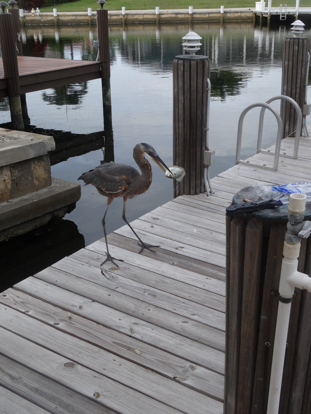 Swimming, napping and fishing is how we spent the afternoon. There was a heron standing to the side watching Dave fish. He really became interested when he saw Dave actually catching fish. So Dave decided to see what would happen if he left the fish on the dock. The heron waited and then flew over and grabbed the fish. He flew back and then proceeded to swallow it whole. It was creepy watching the fish go down the bird’s throat and even see it flopping in it’s stomach. In total the heron got three fish. A good day for him.