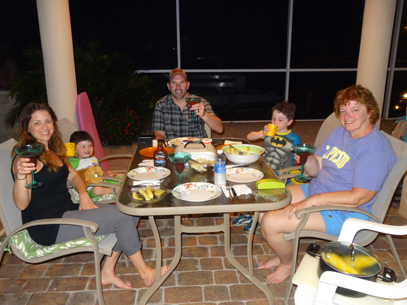 While we were at the market, we picked up some potatoes and corn on the cob to go with our BBQ chicken. Even the margaritas were flowing tonight. The evening ended with the boys in the pool and the girls just relaxing.