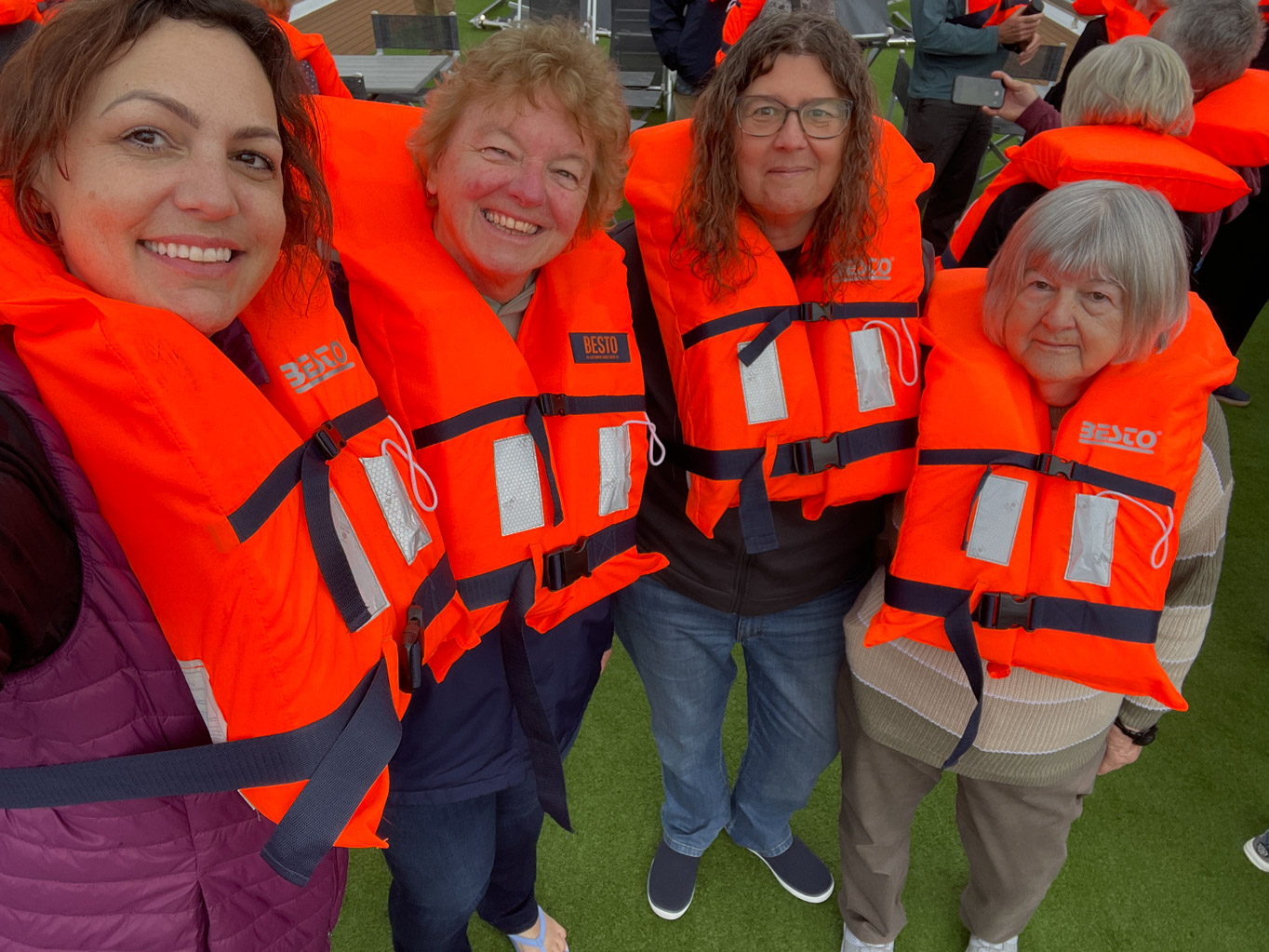 All of sudden at 10:00am, the very loud general alarm starts going off. They told us last night that we would be having a safety drill but I completely forgot. We were instructed to head to the Sun Deck where we donned our life vests. After everyone was assembled, the Captain informed us that we had set a new record. It. only took five minutes for the ninety-five guests and about sixty crew members to gather.