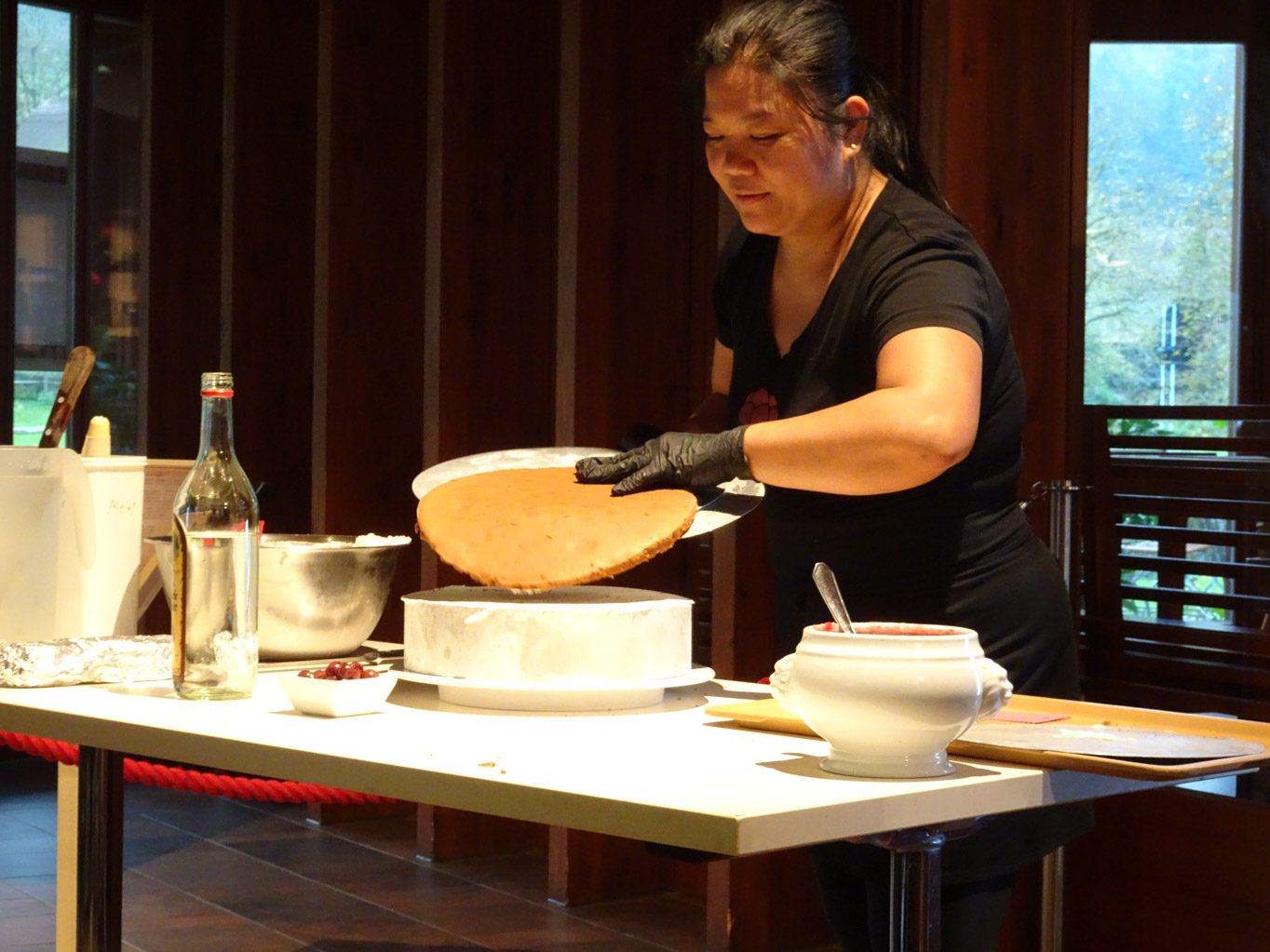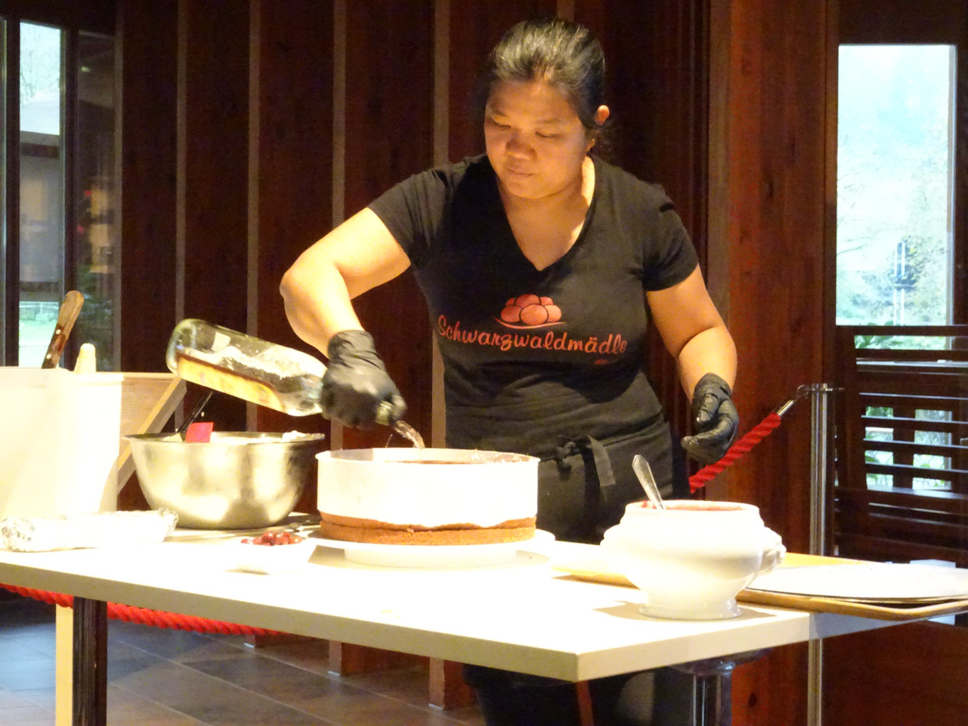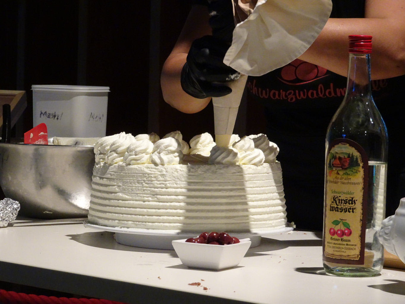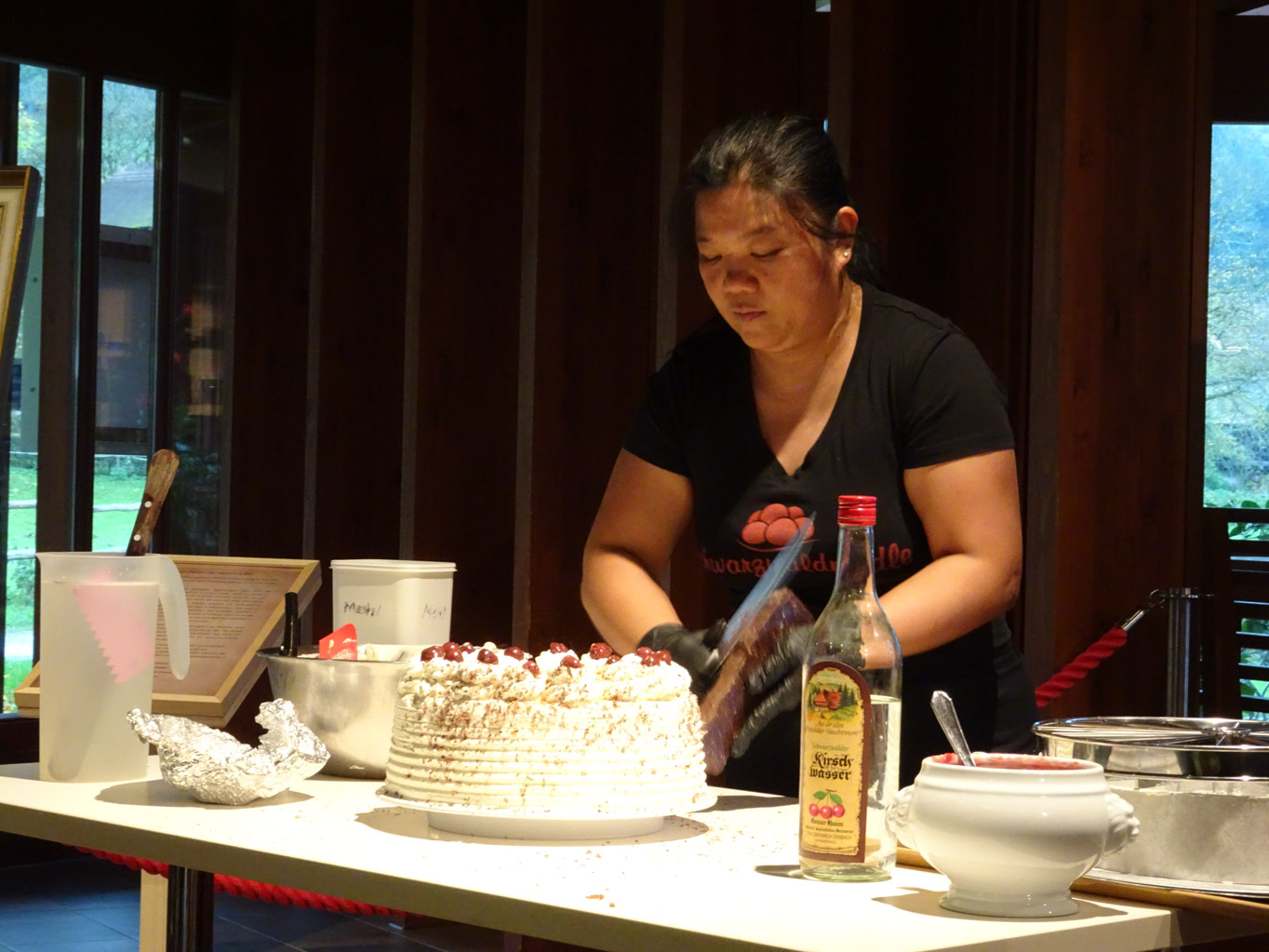 At 4:00pm, we all gathered back in the lobby for the best part of the tour, the cake making demonstration. Debbie who I believe runs the on-site restaurant, showed us how to make Black Forest Cake. It starts with the first of four layers of chocolate cake. This is followed up with a layer of sour cherries. And then alternating layers of cake and whip cream. And do not forget to throw in some Cherry Brandy. It is then garnished with cherries, whip cream and chocolate shavings. Now it was time for the best part, sampling the cake. Unfortunately we could not eat Debbie’s creation since Black Forest Cake is best when it has time to rest and chill. But she did have slices for everyone to enjoy in the restaurant along with a beverage. I have to say that having Black Forest Cake in the Black Forest is way better than Black Forest Cake at home. We had about a half an hour to shop before it was time to get back on the bus.