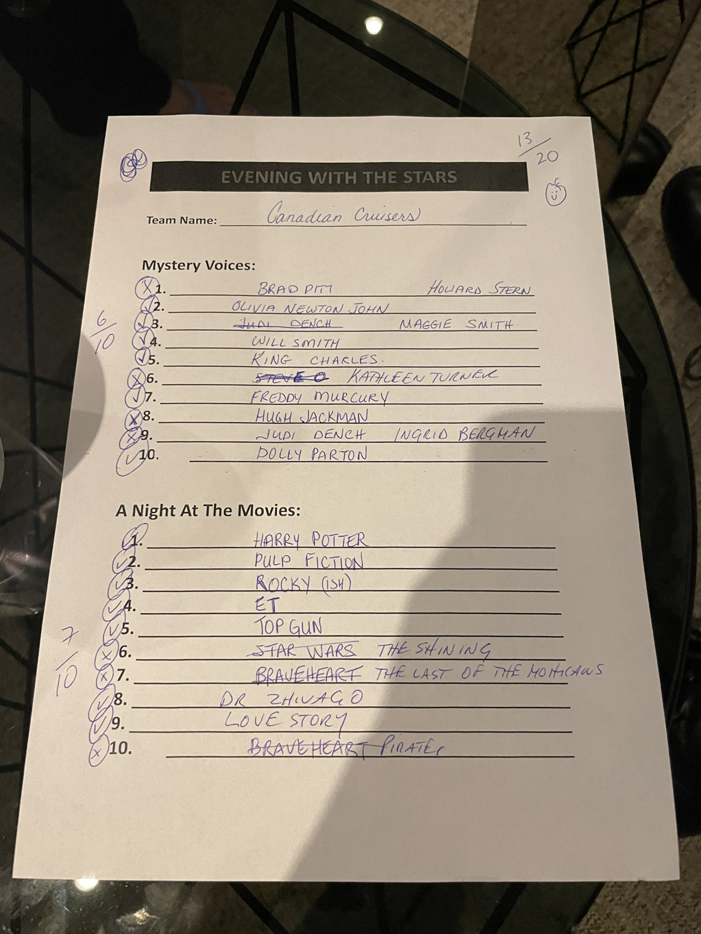 We went back to the cabins to do some planning for tomorrow’s day in port. We want to make sure to maximize our time since we have quite a bit of it. We headed back to the Lounge at 9:15pm to play “Evening With the Stars”. We scored thirteen out of twenty, putting us in fourth place. By 10:30pm, we were back in the cabins ready for a good night’s sleep.