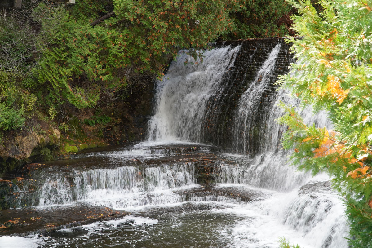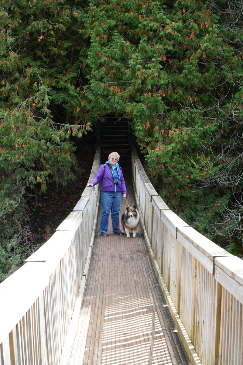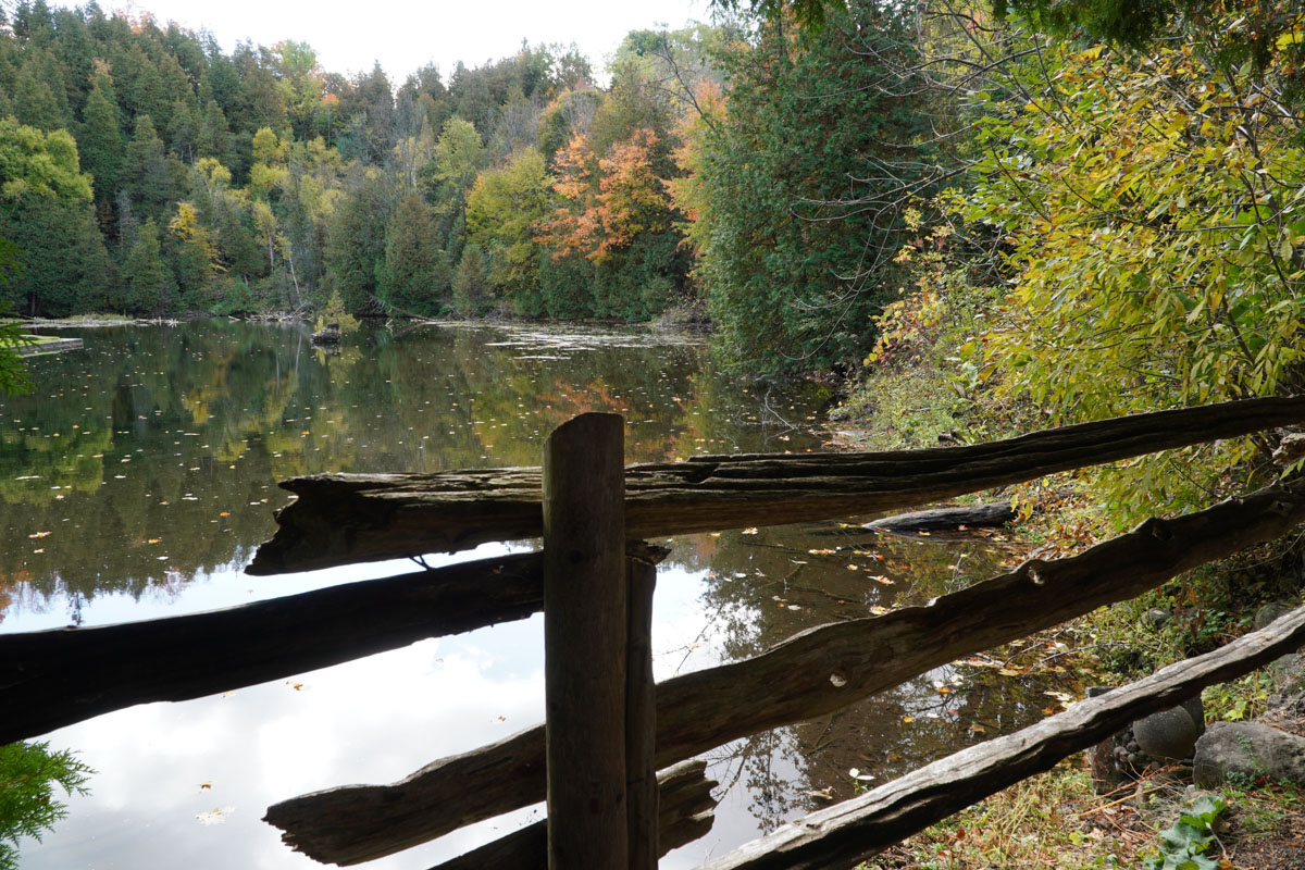 We started our walk past the fountain with a bell which honours the town of Belfountain. Then we crossed the suspension bridge that spans a waterfall. Maui was not that fond of the bridge. We enjoyed the rest of the walk around the pond enjoying the fall colours. In total , it was only about a fifteen minute walk.