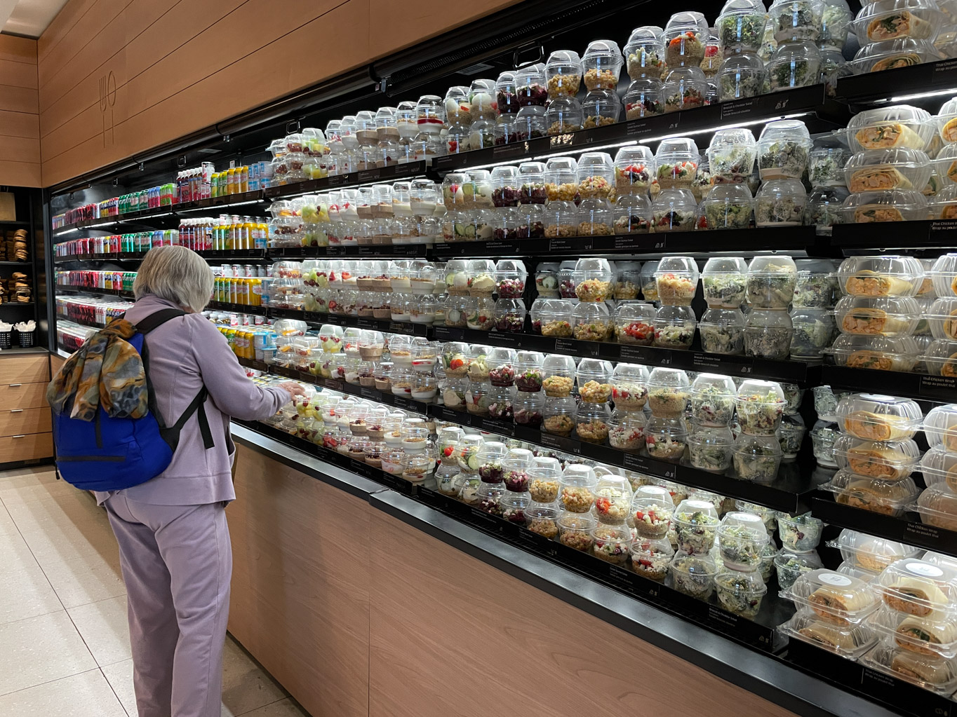 The Air Canada app was telling me that boarding was beginning in about thirty-five minutes. So we filled up our water bottles and headed to the departure gates. We did make one stop at the Air Canada Cafe. This is not a full fledged lounge but it does have prepackaged snacks and drinks that you can take with you. We each grabbed a bag and I filled mine up with fresh fruit and a cranberry cocktail. Nana got cheese and crackers, some kind of salad and a drink. While we were in the cafe, I received a call from Pat at Whispering Wind Cove Cottages. I explained to her the situation and she says that it is best to have dinner in Gander since most places will be closed in Twillingate. She also said that she will leave our cottage unlocked and the keys on the table. That is so sweet of her to do that. Once I finished the phone call, we loaded up the snacks in our backpacks and made the five minute walk to gate D42.