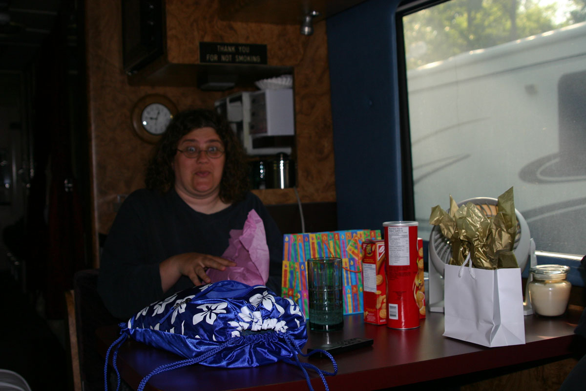 Thursday morning started by waking up on Loretta’s bus, and opening birthday presents.  (Happy Birthday to me).  And no, we did not see any ghosts on the bus, although our campfire neighbors swore they saw Loretta when they stayed on the bus the night before us.