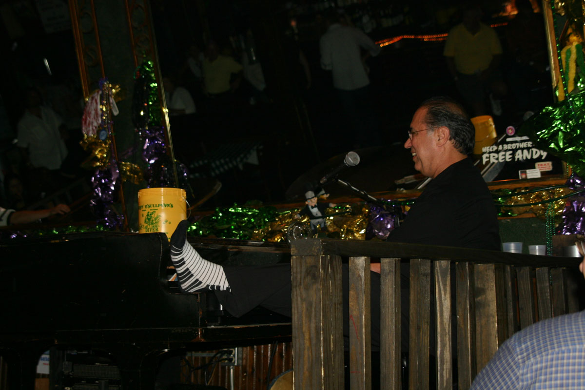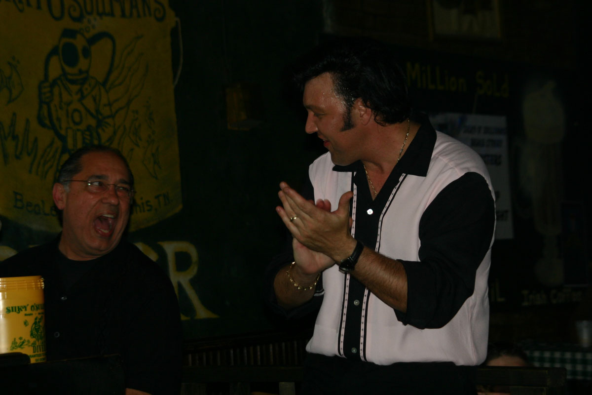 After stuffing ourselves, we walked back down Beale Street to Silky O’Sullivan’s where Silky personally greeted Mike and his gang at the door.  This place is a bar with two piano players tonight.  Darren was introduced to the crowd by Jerry, and then wowed the crowd with a version of “Big Boss Man”.