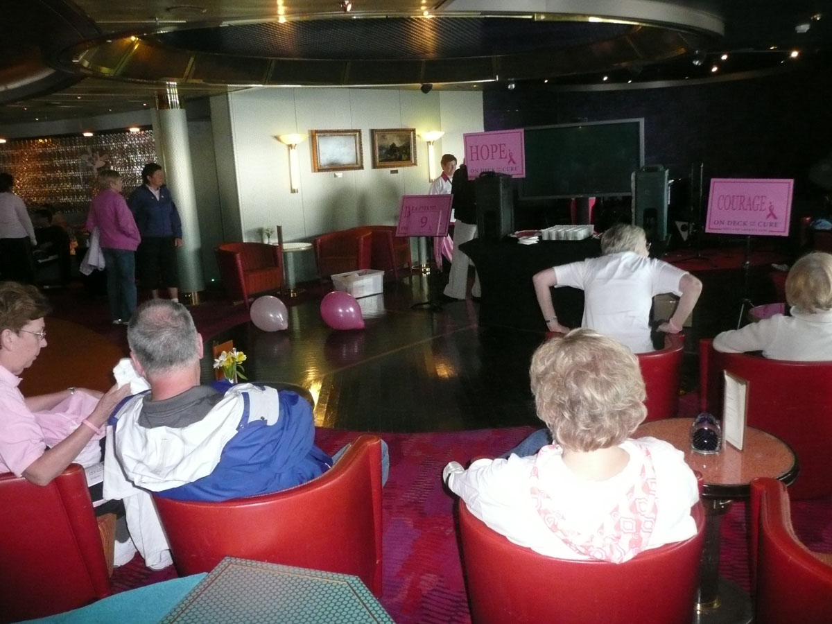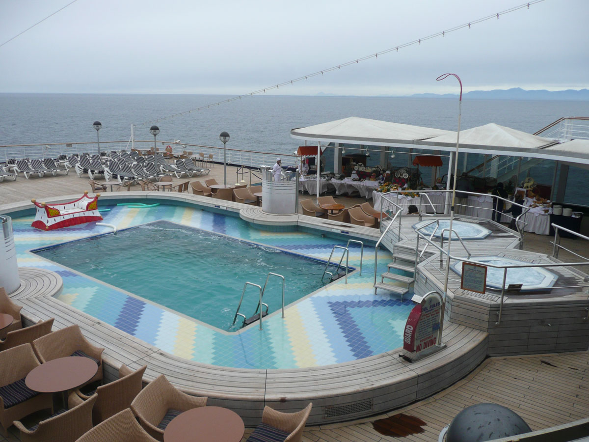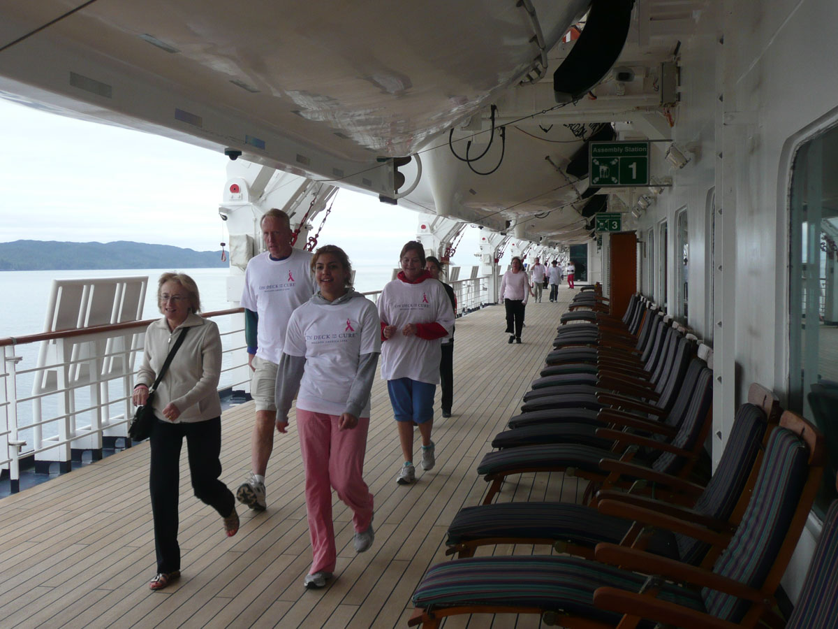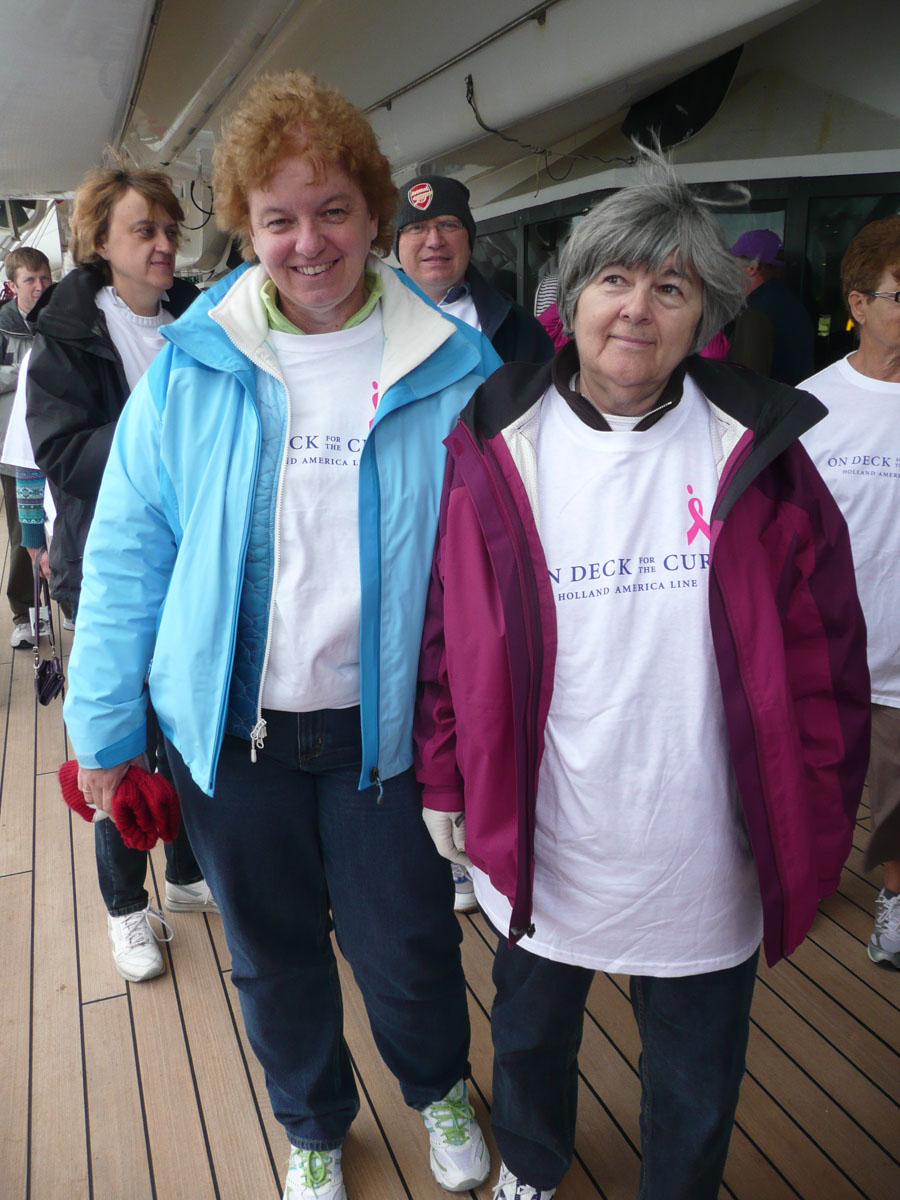 We had signed up for the “On Deck For the Cure” walk today. It is a 5K non-competitive walk around the ship’s deck and the money raised goes to the Susan G. Komen Breast Cancer Foundtain. Holland America has raised $2,000,000 so far. The 5K works out to be 9 laps around the ship. Now I know what you are thinking … me … walking 5K. Well I have to say that I did it but with alot of grumbling. Around lap 5, I could feel the burn … whatever that means. The walk was basically over but Karen and I still had three more laps to go. All of a sudden behind us comes a gentleman who ended up walking the three laps with us. We learned that he was a cancer survivor (brain cancer) and he said that he wasn’t leaving any teammates behind. The conversation with him made those last three laps go by quickly. After the walk, we picked up Nana and Papa and headed up to the Lido pool to enjoy the late afternoon scenery.