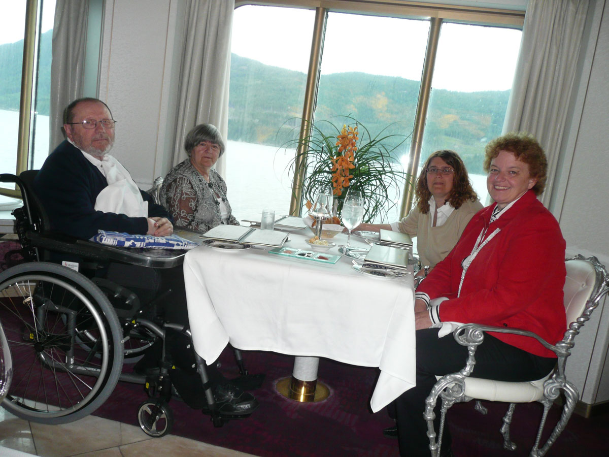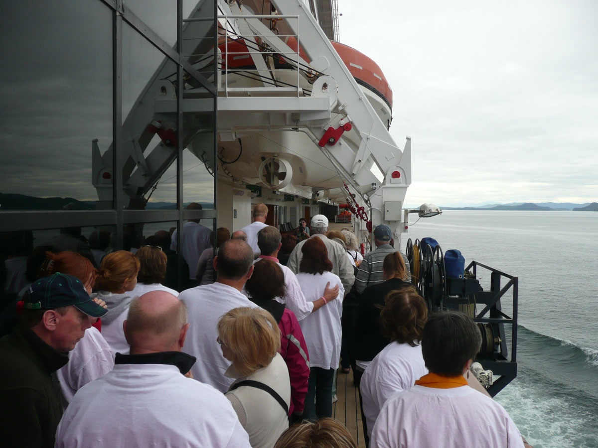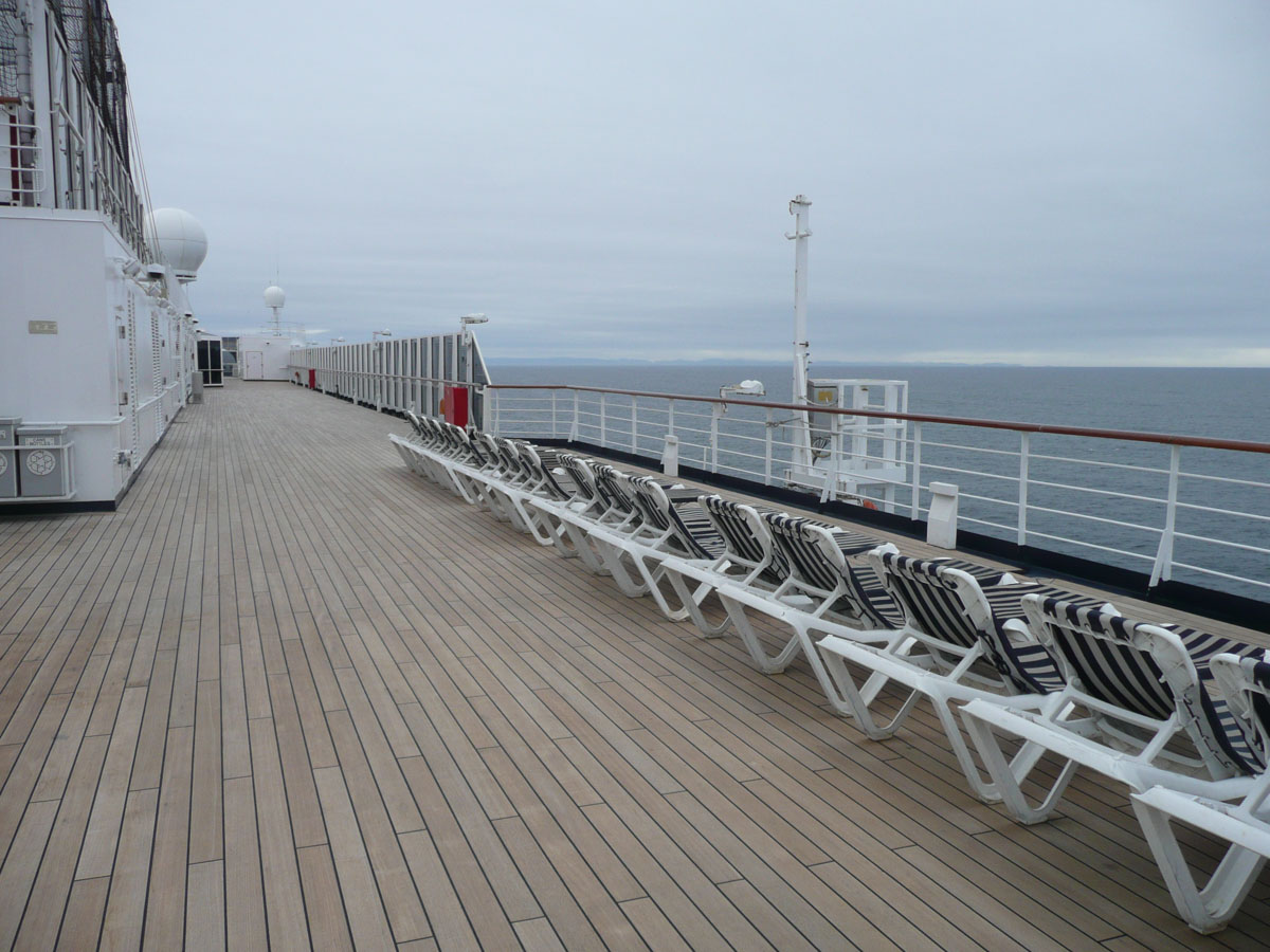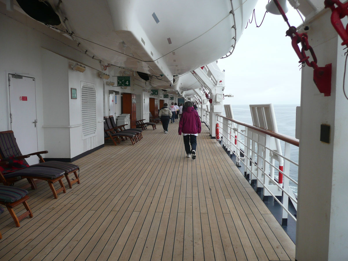 We had signed up for the “On Deck For the Cure” walk today. It is a 5K non-competitive walk around the ship’s deck and the money raised goes to the Susan G. Komen Breast Cancer Foundtain. Holland America has raised $2,000,000 so far. The 5K works out to be 9 laps around the ship. Now I know what you are thinking … me … walking 5K. Well I have to say that I did it but with alot of grumbling. Around lap 5, I could feel the burn … whatever that means. The walk was basically over but Karen and I still had three more laps to go. All of a sudden behind us comes a gentleman who ended up walking the three laps with us. We learned that he was a cancer survivor (brain cancer) and he said that he wasn’t leaving any teammates behind. The conversation with him made those last three laps go by quickly. After the walk, we picked up Nana and Papa and headed up to the Lido pool to enjoy the late afternoon scenery.