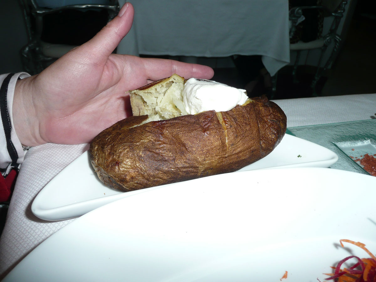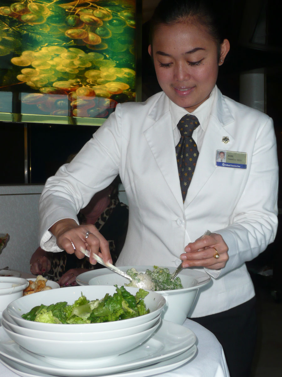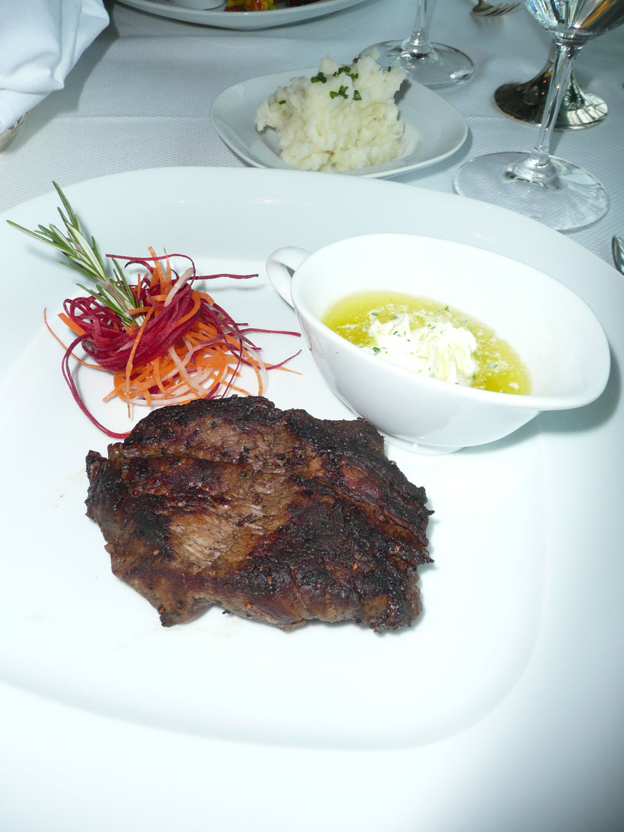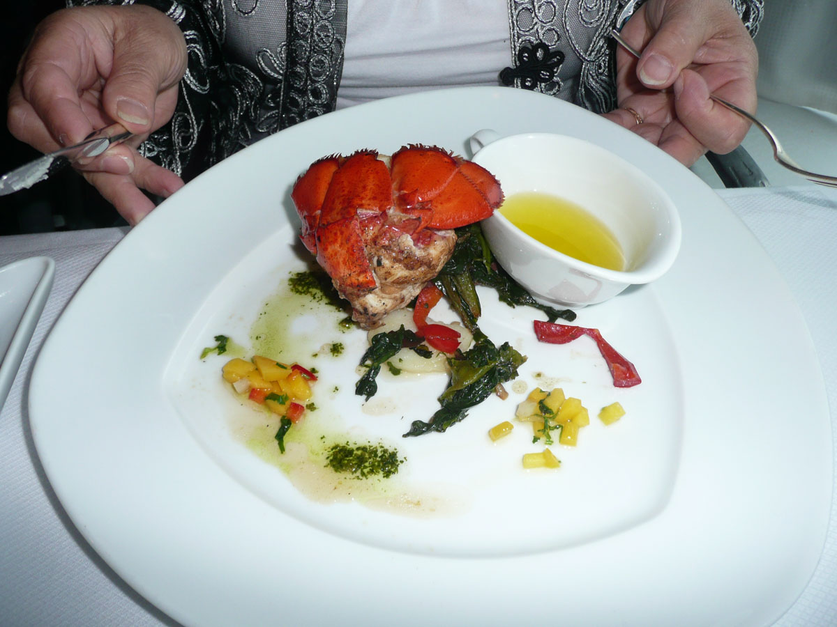 We decided to splurge tonight and eat dinner at The Pinnacle Grill. This is the high end restaurant on the ship where there is a $20 cover charge/person. I would have to say that that was probably the best meal that I ever had. We had a table right by the window where we spent the next 2-1/2 hours. We had lobster bisque, table side ceasar salad, broiled lobster tails and filet mignon. Karen and Nana each had a baked potatoe that was the size of their hands. Dessert was to die for, and we all left completely stuffed.
