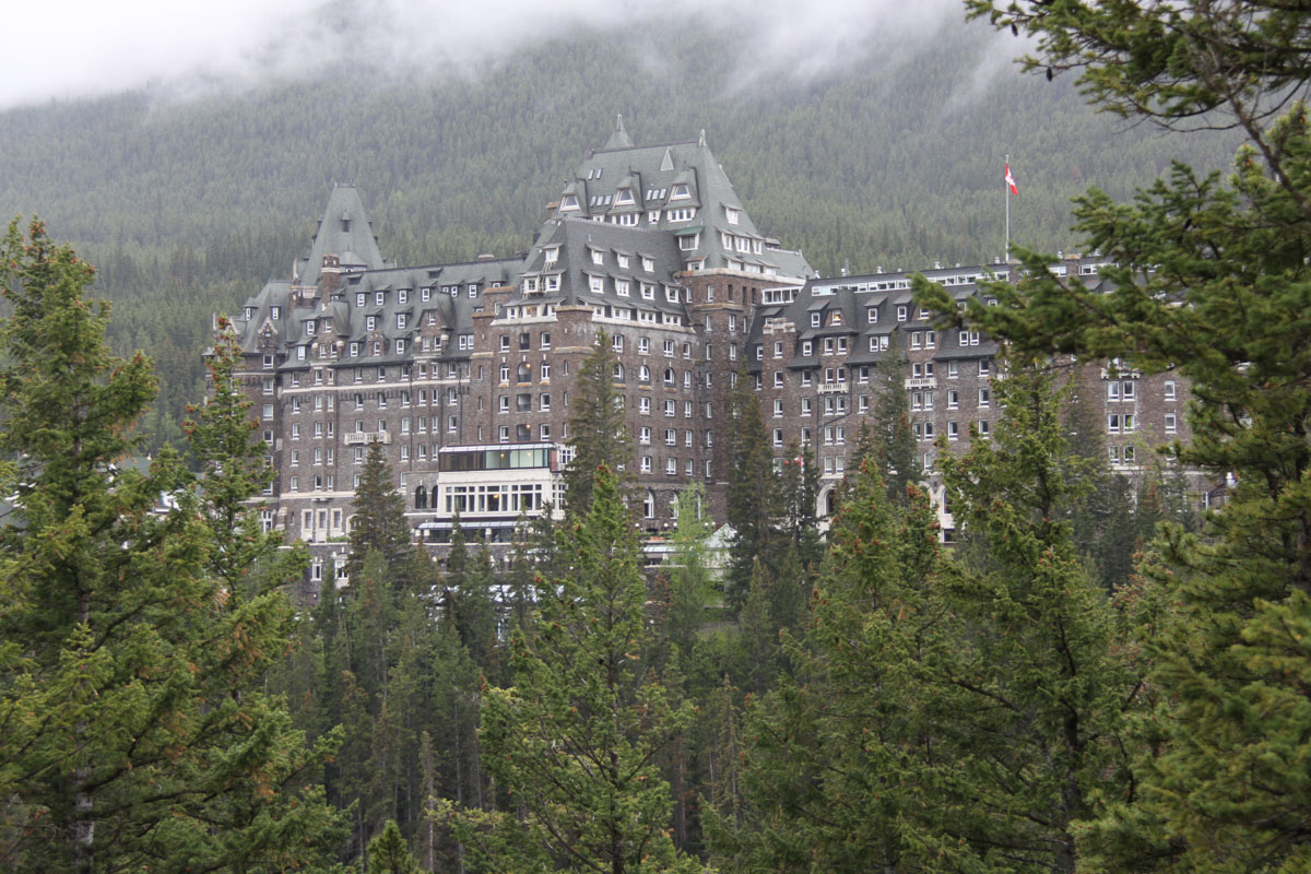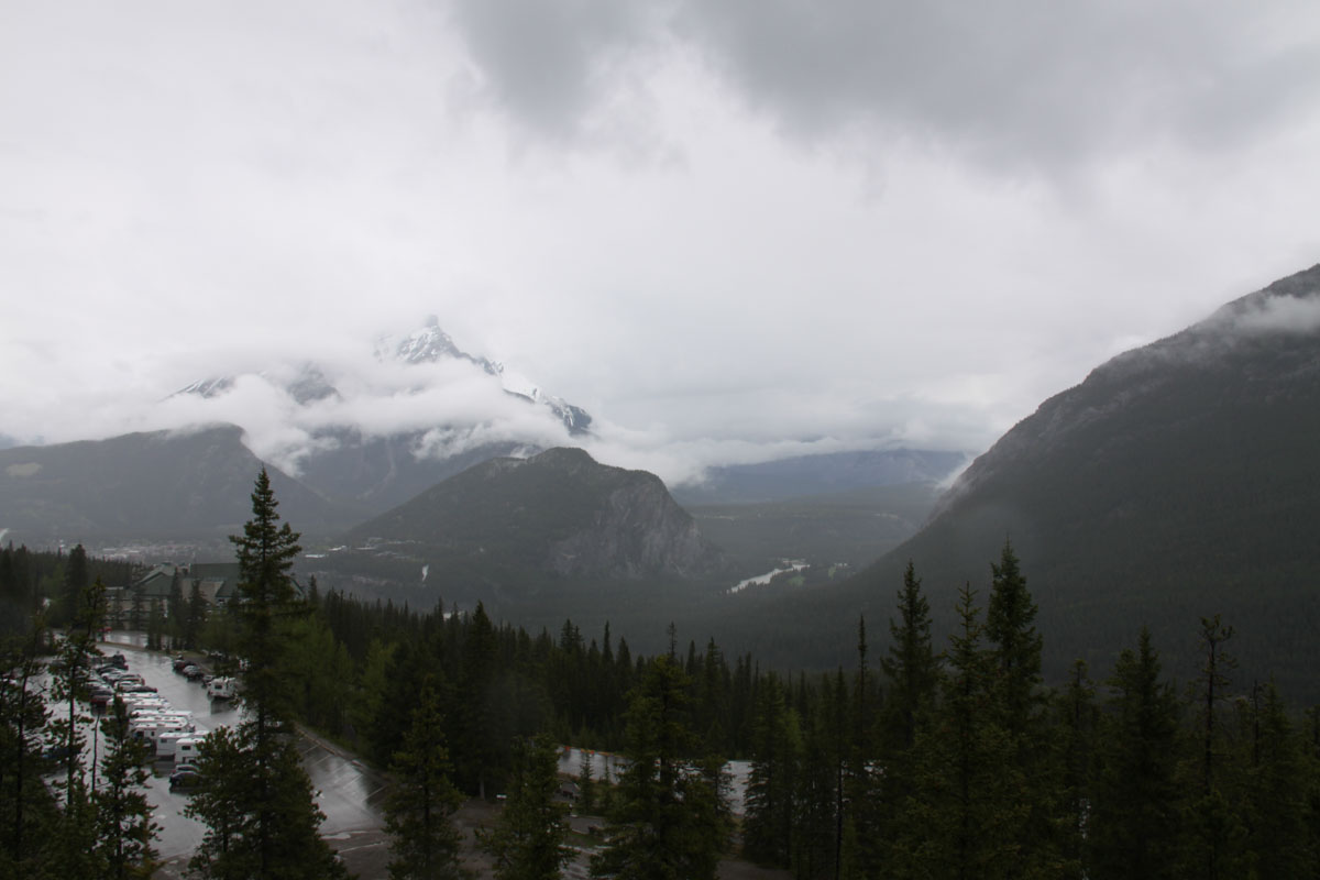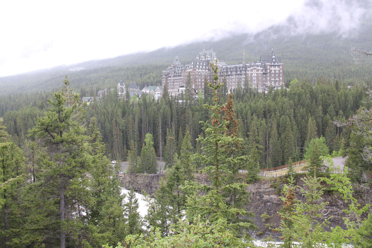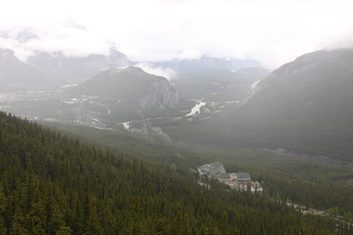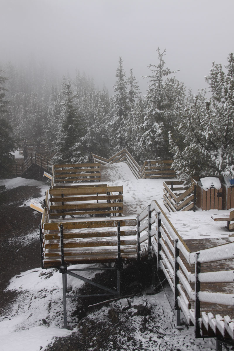 We took the Banff Gondola to the top of Sulphur Mountain. As we climbed up the mountain, the rain changed to snow and the temperature dropped. We were not able to see much of anything but it was very quiet and peaceful. We actually climbed to the observation deck and all we could see were lots and lots of clouds. We descended down the mountain and head back to the car to do some touring around. We stopped at surprise corner and got a lovely view of The Fairmont Banff Springs from across the Bow River.