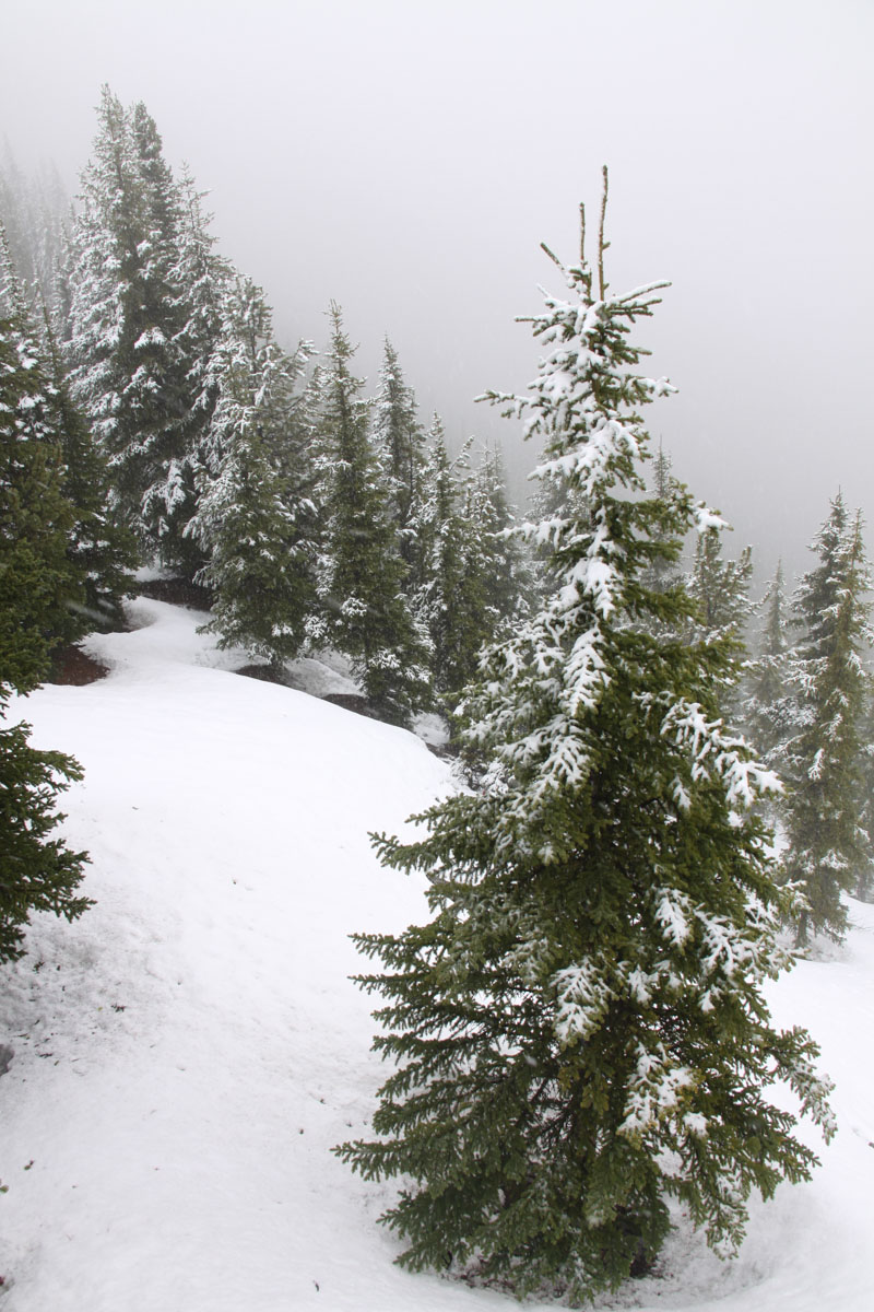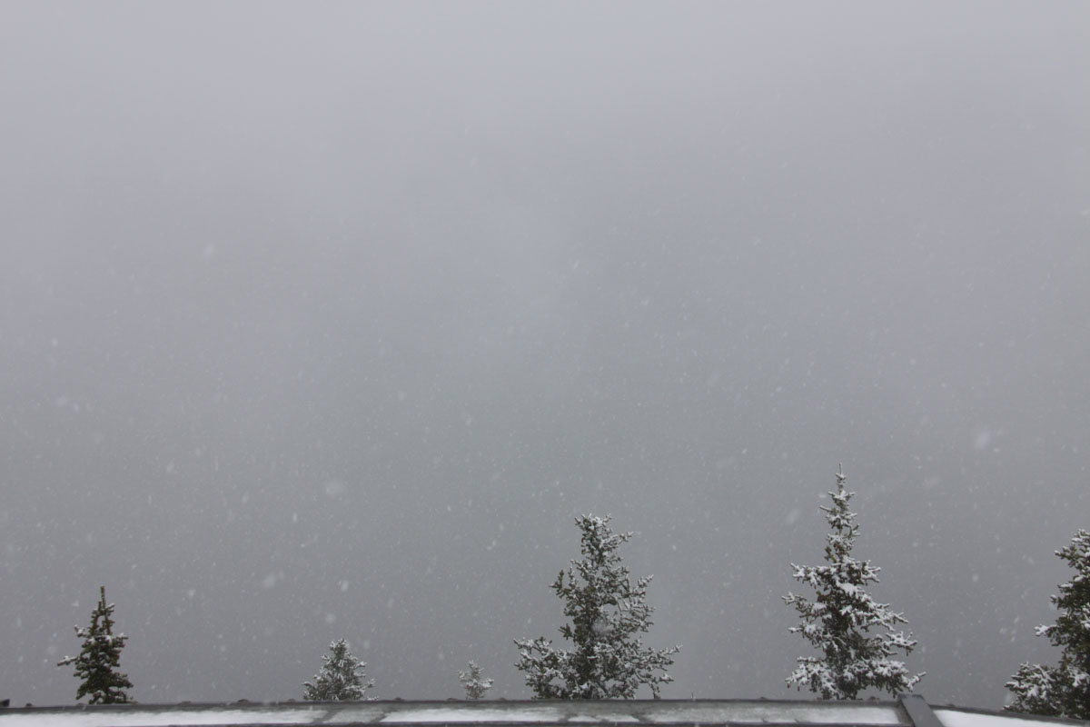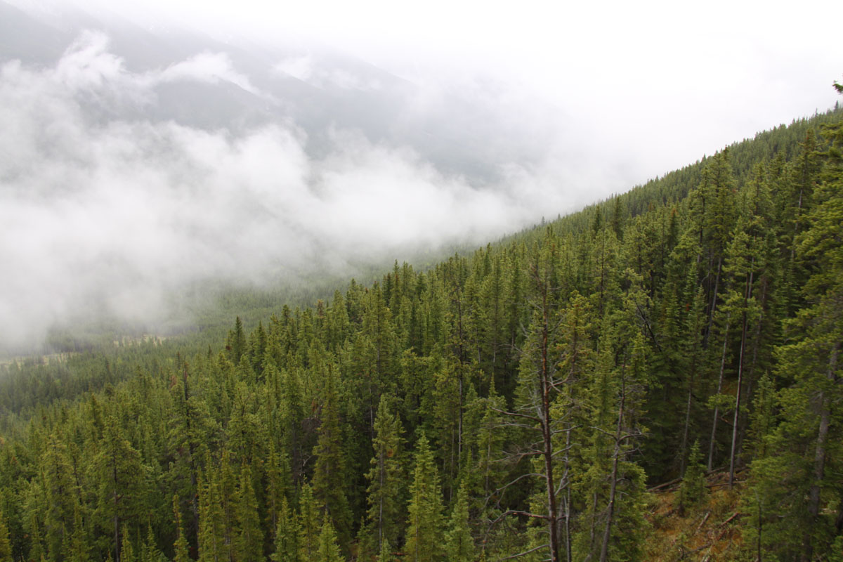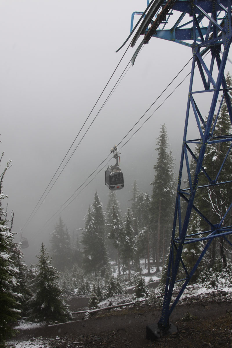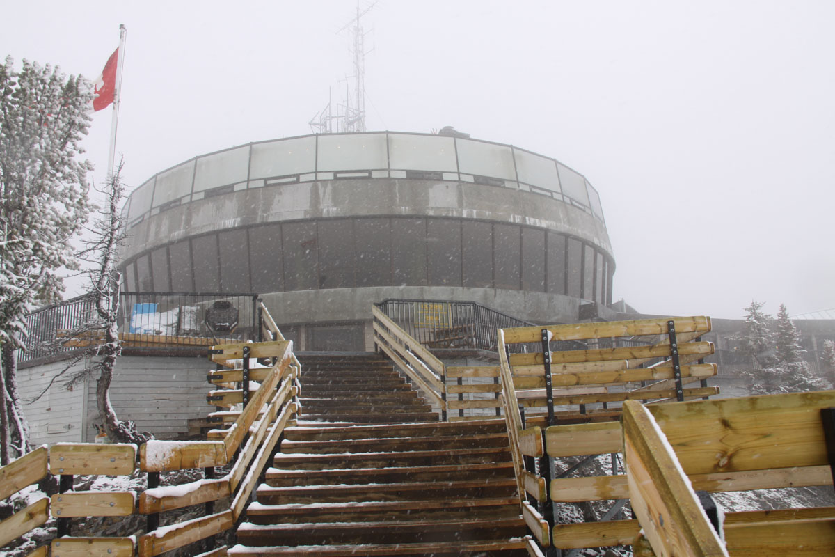 We took the Banff Gondola to the top of Sulphur Mountain. As we climbed up the mountain, the rain changed to snow and the temperature dropped. We were not able to see much of anything but it was very quiet and peaceful. We actually climbed to the observation deck and all we could see were lots and lots of clouds. We descended down the mountain and head back to the car to do some touring around. We stopped at surprise corner and got a lovely view of The Fairmont Banff Springs from across the Bow River.