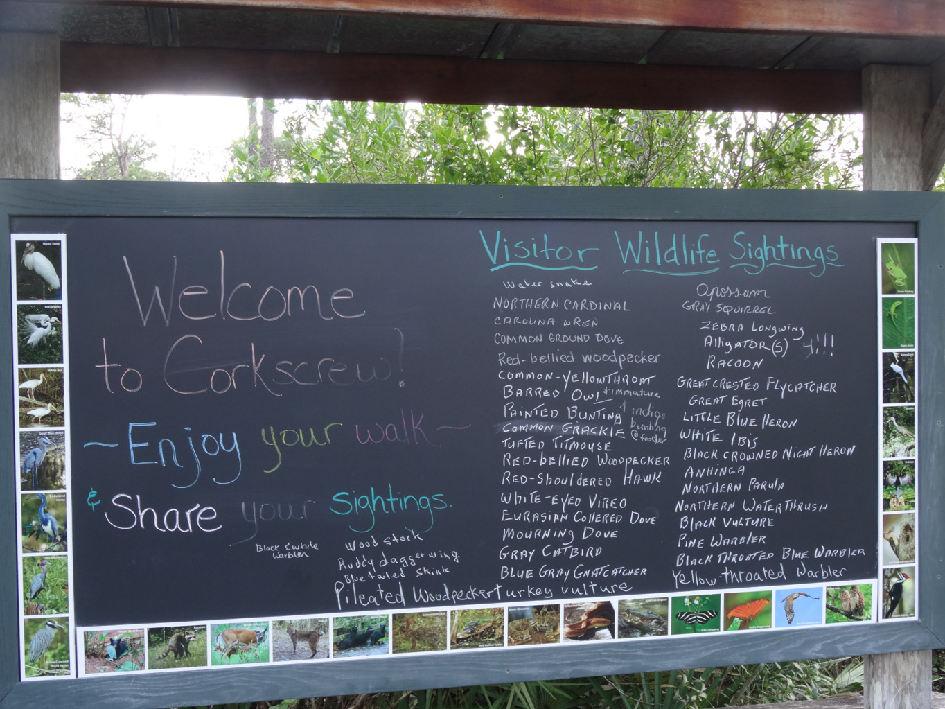 Corkscrew Swamp Sanctuary is a 13,000 acre preserve that has a 2.25 mile boardwalk that makes it way through pine flatwoods, wet prairie, a marsh and the largest remaining stand of bald cypress in North America. In the visitors center, we found a binder full of photographs of the various animals that have been spotted there. This gave us an idea of what to expect.