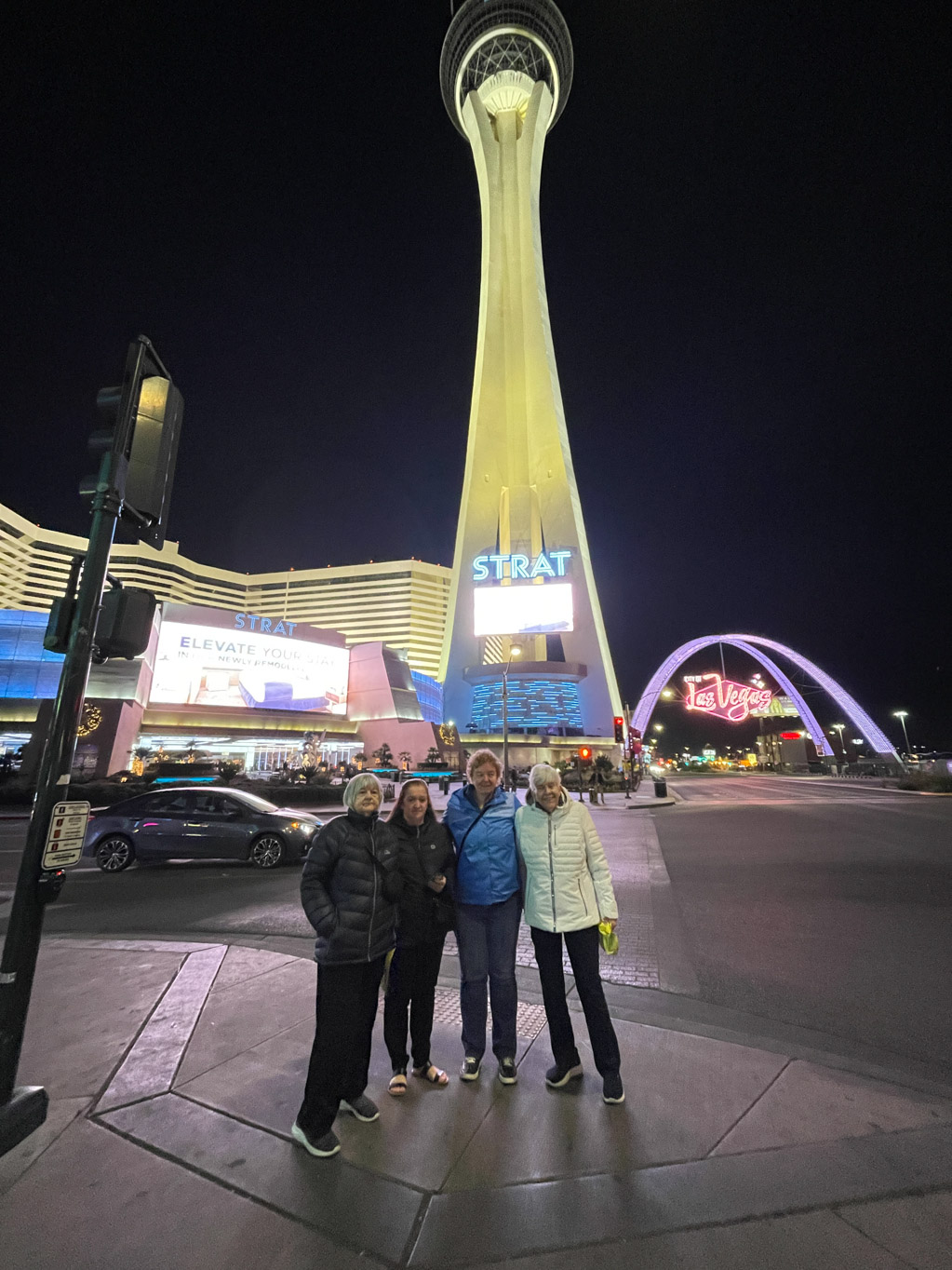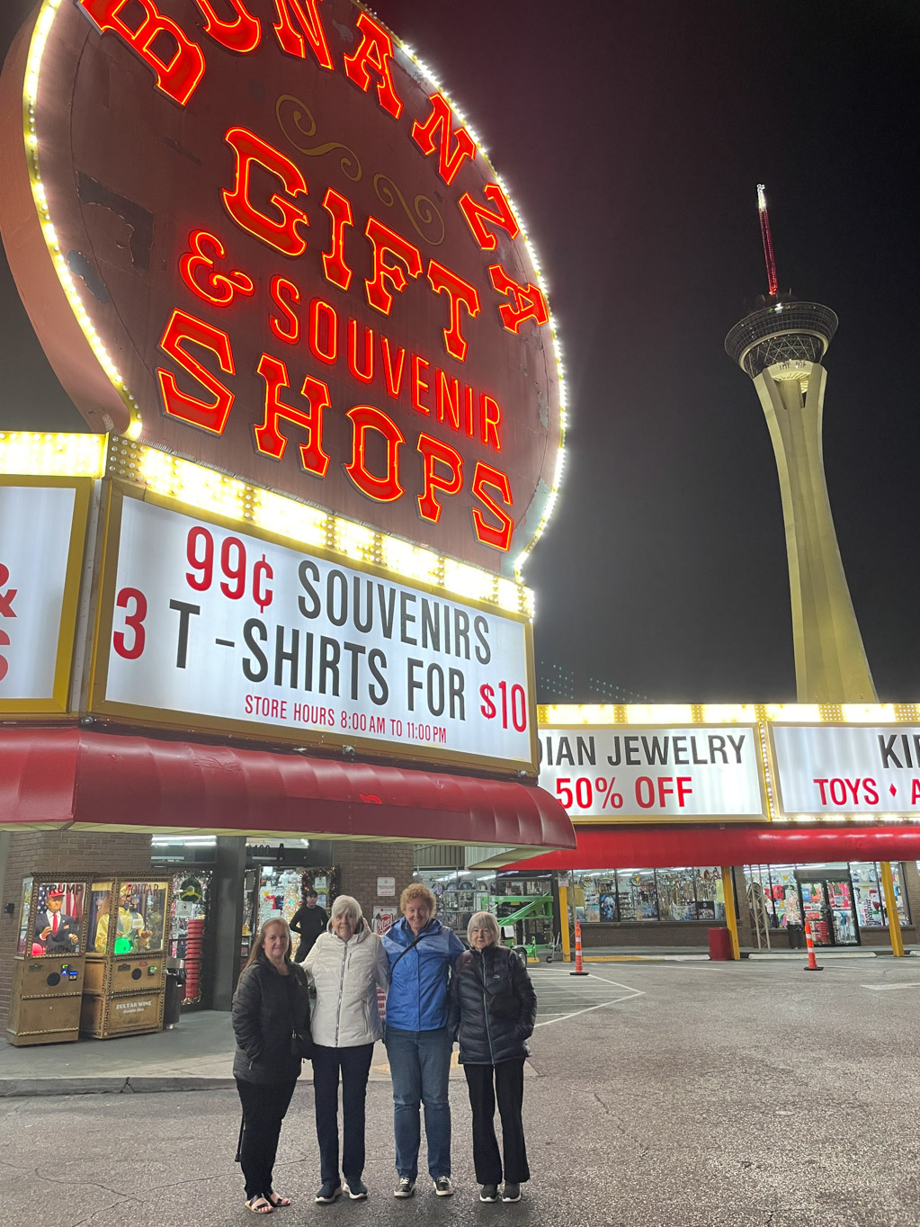After dinner, we visited the Bonanza Gift & Souvenir ShopsWorld’s, where Joan picked up a souvenir T-shirt. From there, we walked to The STRAT Hotel, Casino and Tower, where we finally tried our luck at the slots. Darlene was the big winner, walking away with $50. Now everyone can officially say they’ve gambled in Las Vegas—it was the perfect end to our night.
